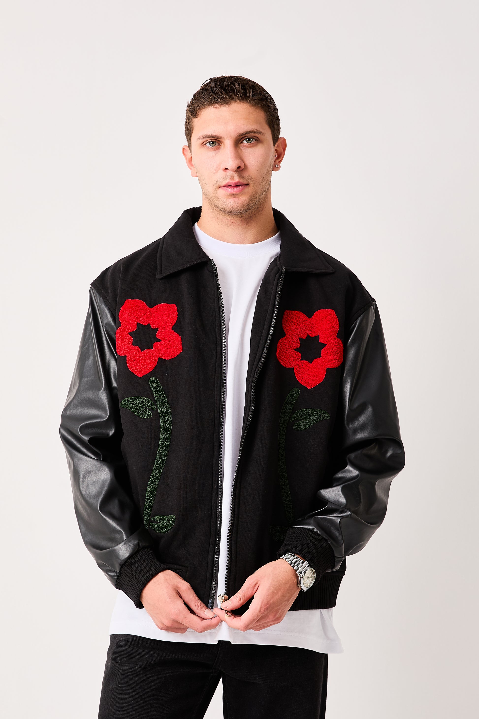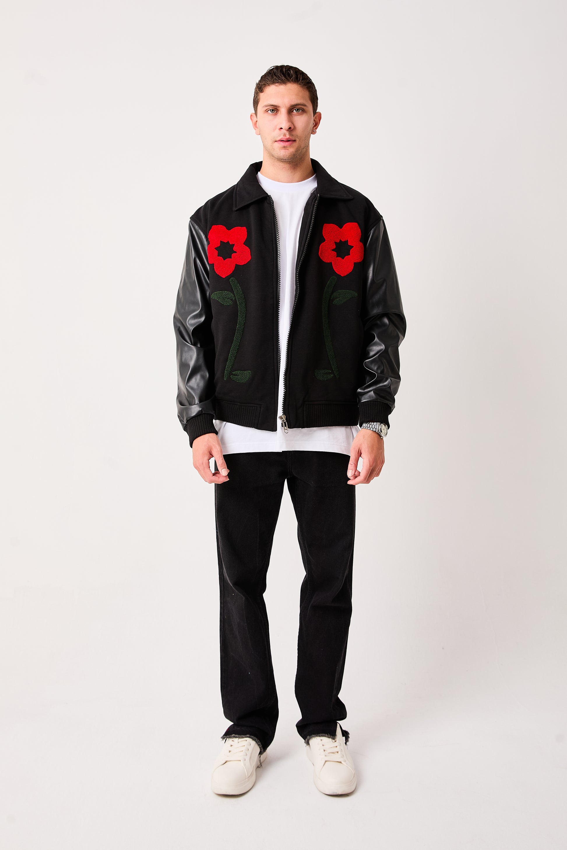 Turn heads with this standout varsity bomber featuring bold chenille flower appliqués on the chest and smooth faux-leather sleeves. The cotton-blend body is soft and durable, while ribbed cuffs and hem lock in warmth and keep the fit clean. A full front zipper and side pockets make it easy for everyday wear—pair with black denim or relaxed cargos for a sharp street look.