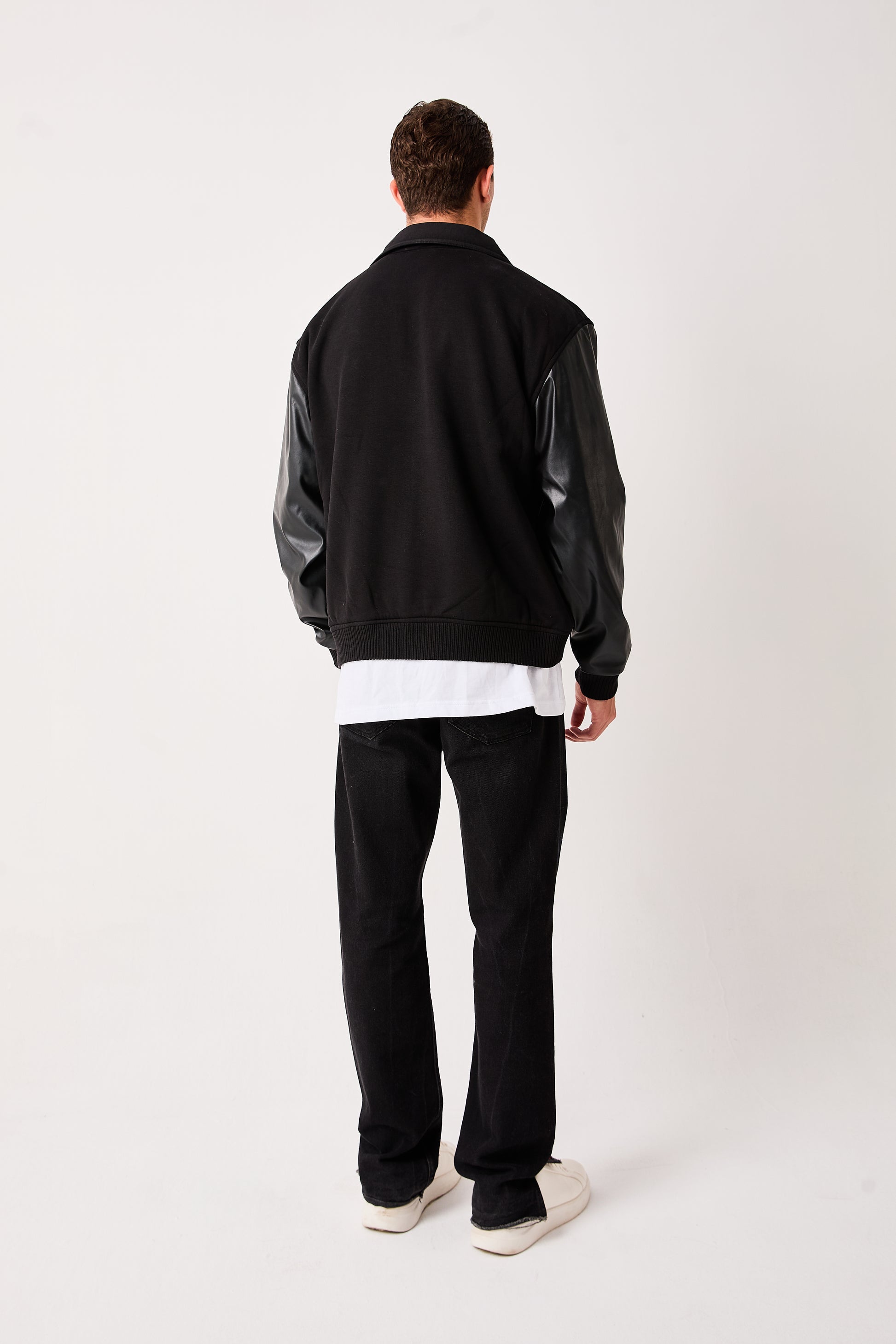 Faux-leather sleeves; soft knit body (cotton-poly blend)