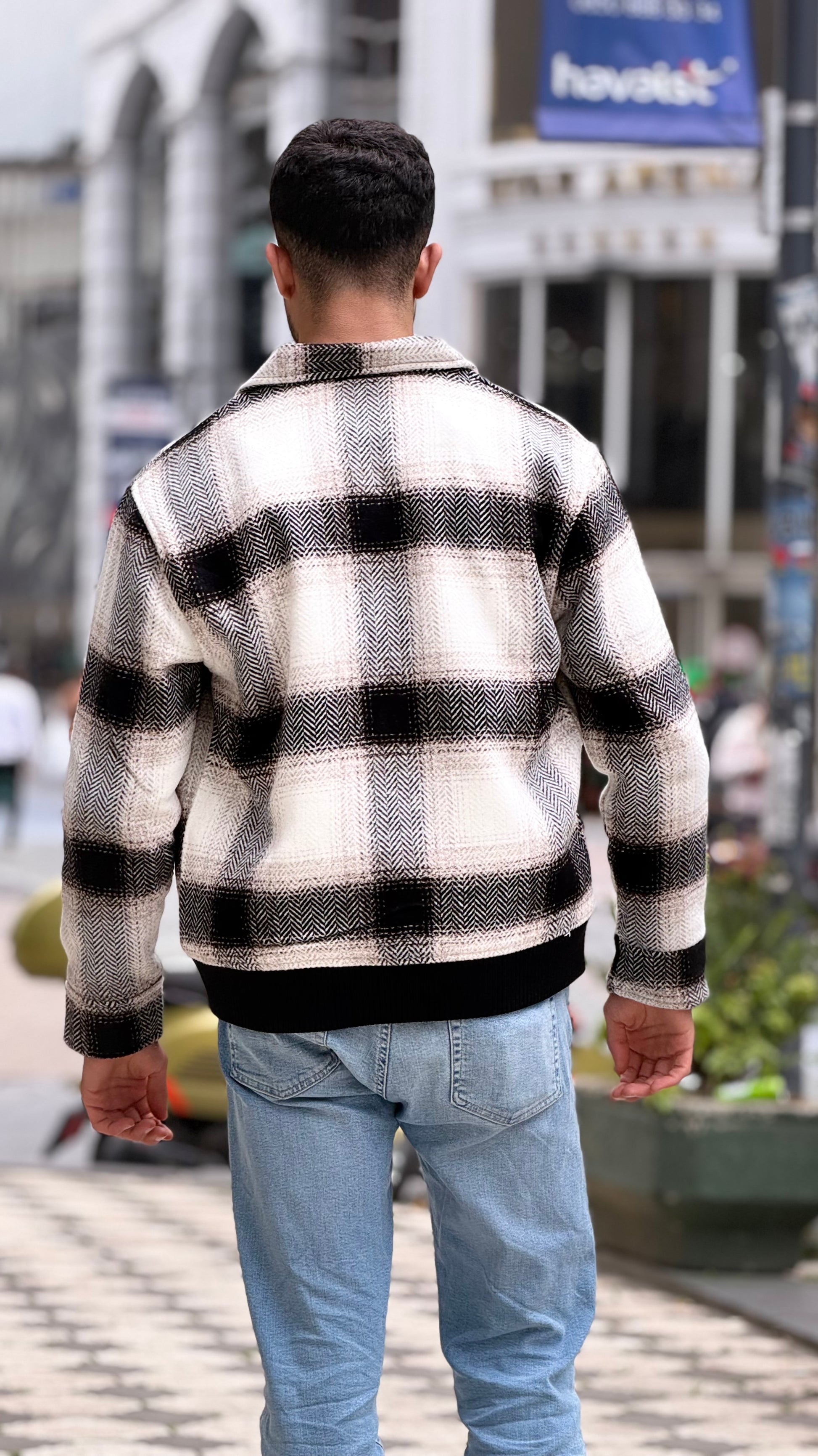 The jacket features a bold oversized check pattern, clean collar design and reinforced front button closure. Two large flap pockets add both practicality and a contemporary utility-inspired look. The ribbed hem and cuff details create a structured fit, ensuring the jacket sits cleanly over your outfit without losing comfort.