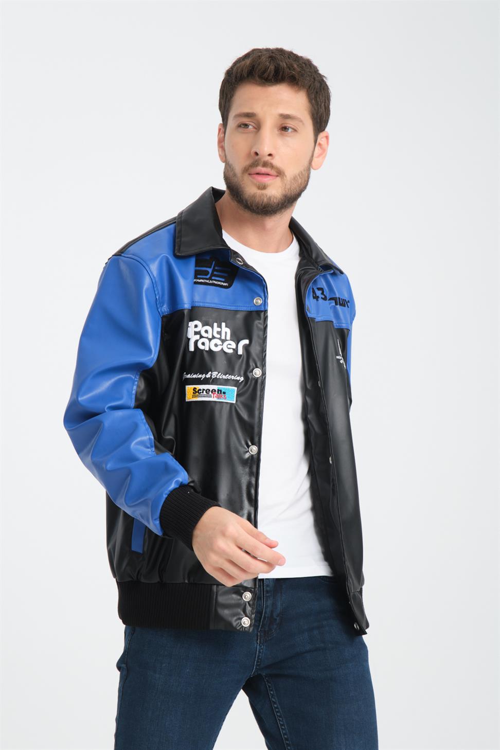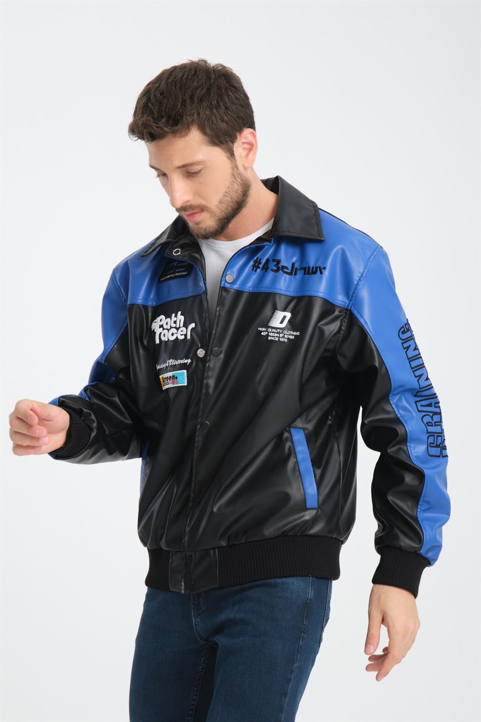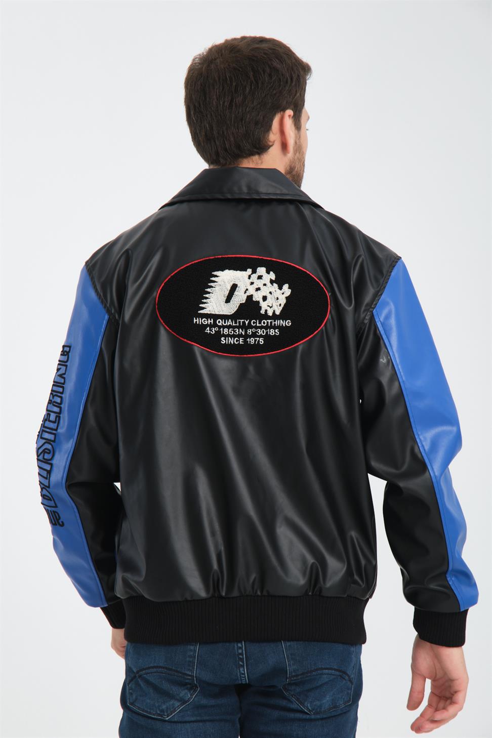 R-2384 Embroidered Detail Lined Faux Leather Jacket
