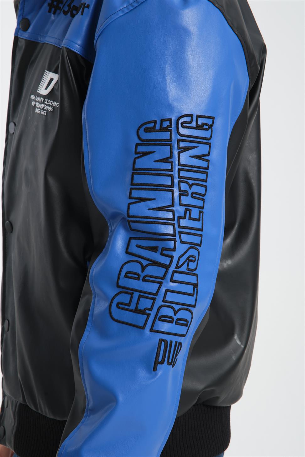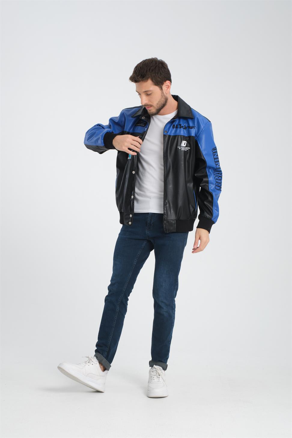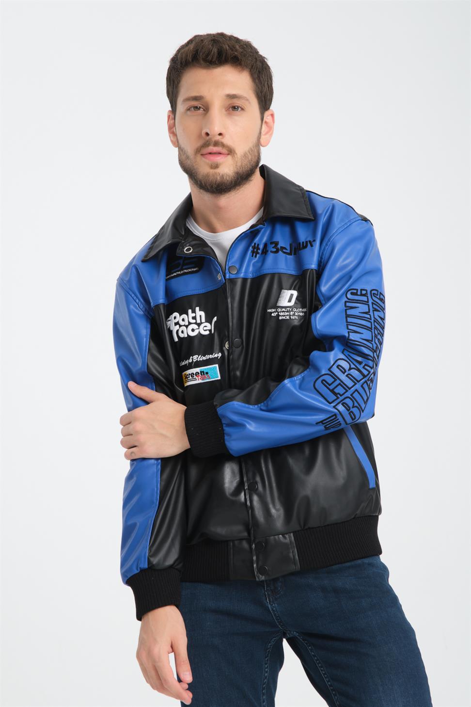 R-2384 Embroidered Detail Lined Faux Leather Jacket