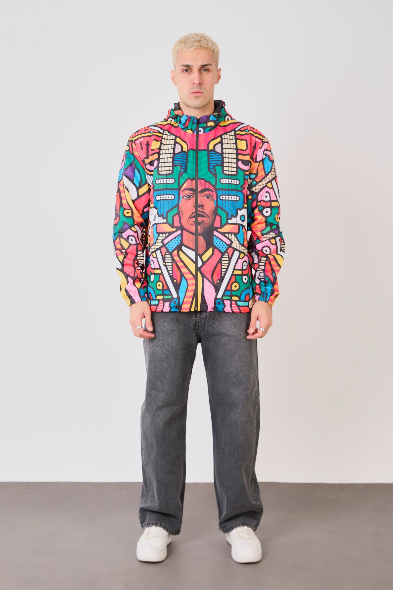 This unisex windbreaker jacket features a bold abstract art print inspired by modern street art and geometric illustration. Designed to stand out, the all-over print combines vibrant colors with a strong graphic composition, creating a wearable statement piece.