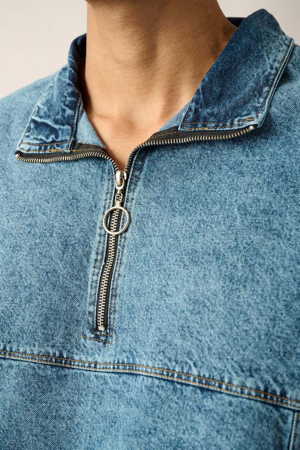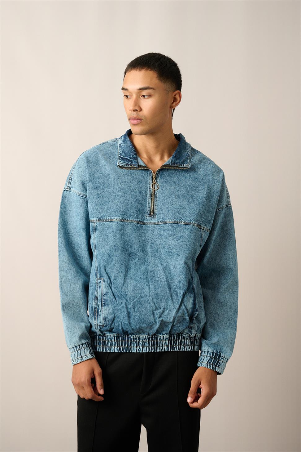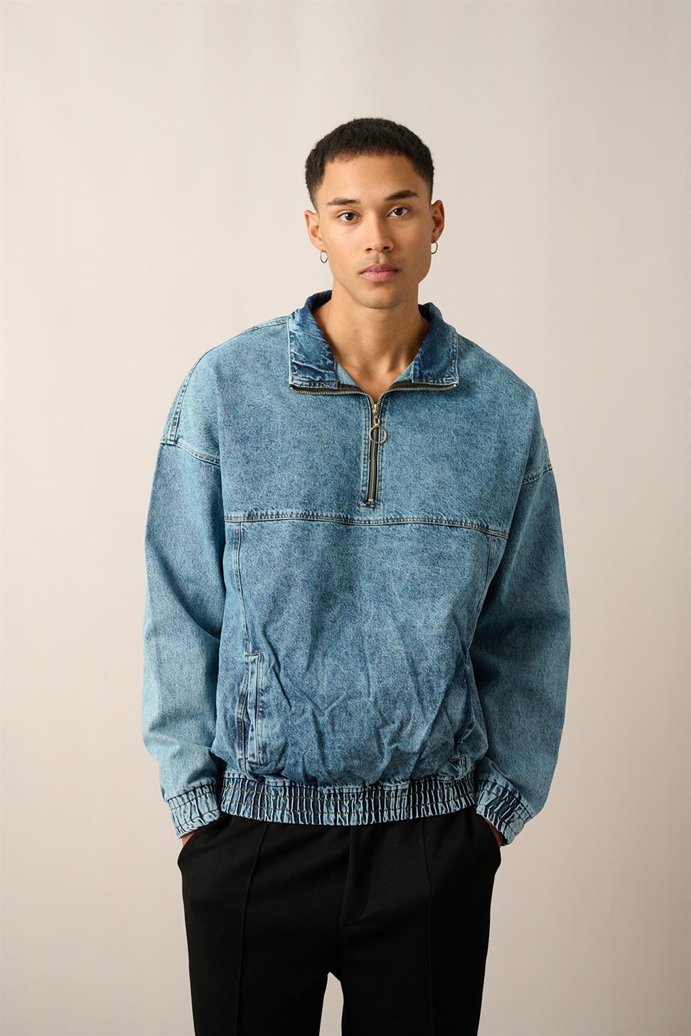 Upgrade your casual style with this half-zip denim sweatshirt in blue, designed with elastic hem and cuffs for a modern and comfortable fit. Crafted from 100% cotton denim fabric, it offers durability, breathability, and effortless style for everyday wear.