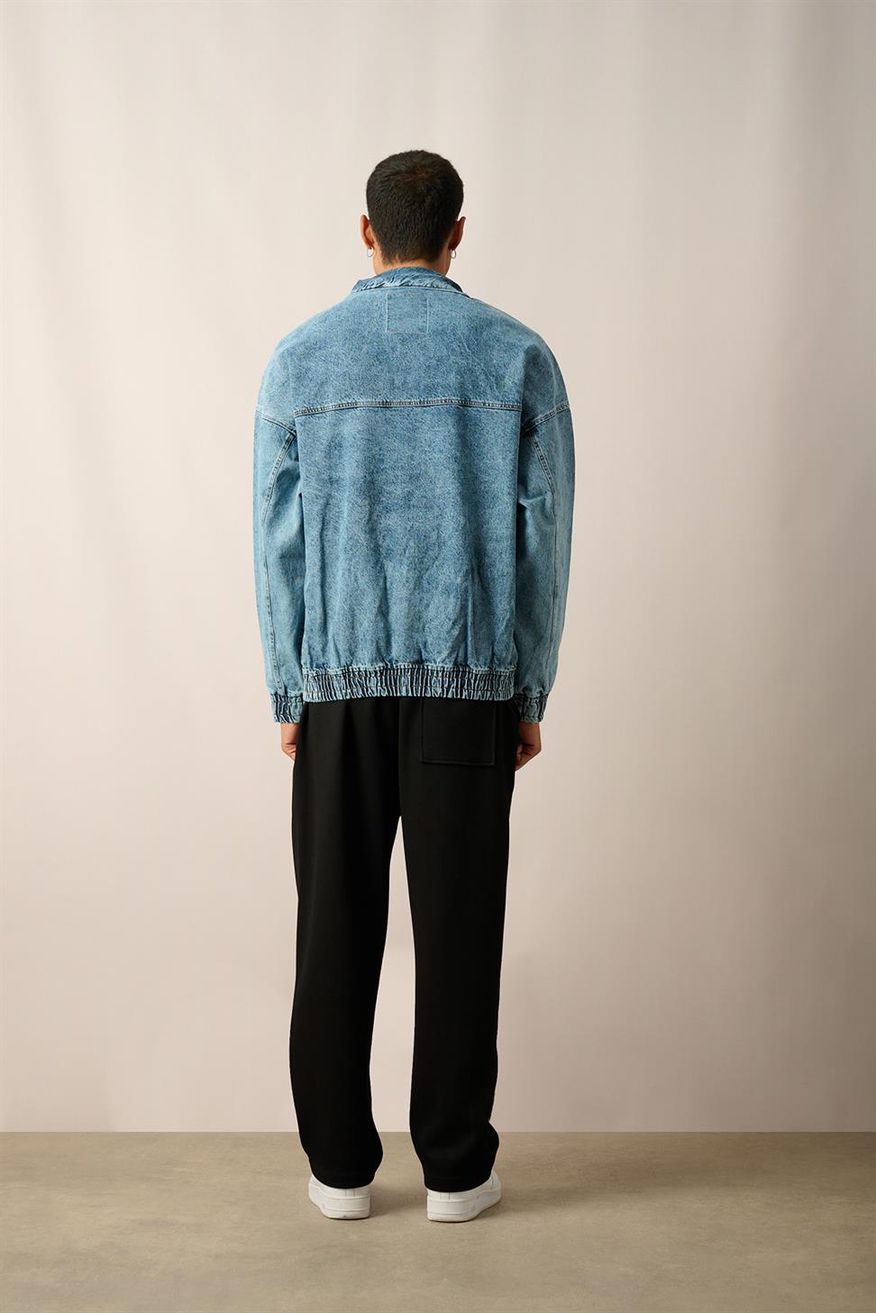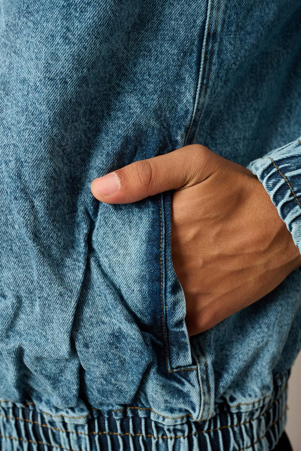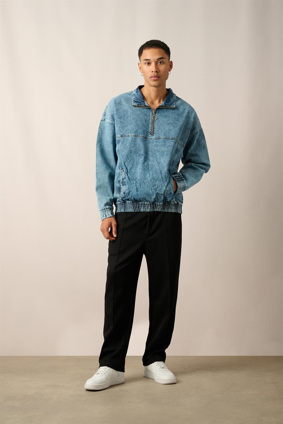 Upgrade your casual style with this half-zip denim sweatshirt in blue, designed with elastic hem and cuffs for a modern and comfortable fit. Crafted from 100% cotton denim fabric, it offers durability, breathability, and effortless style for everyday wear.