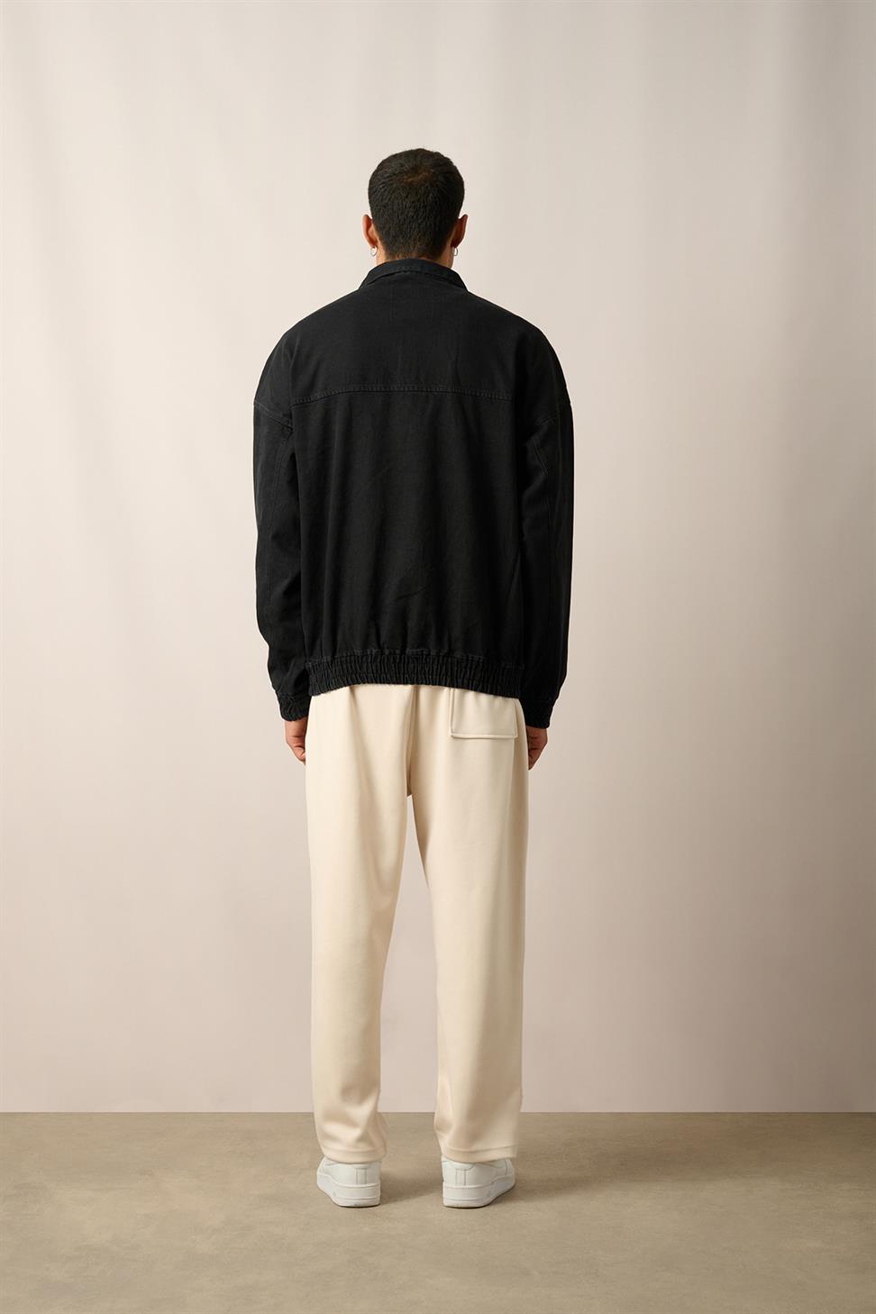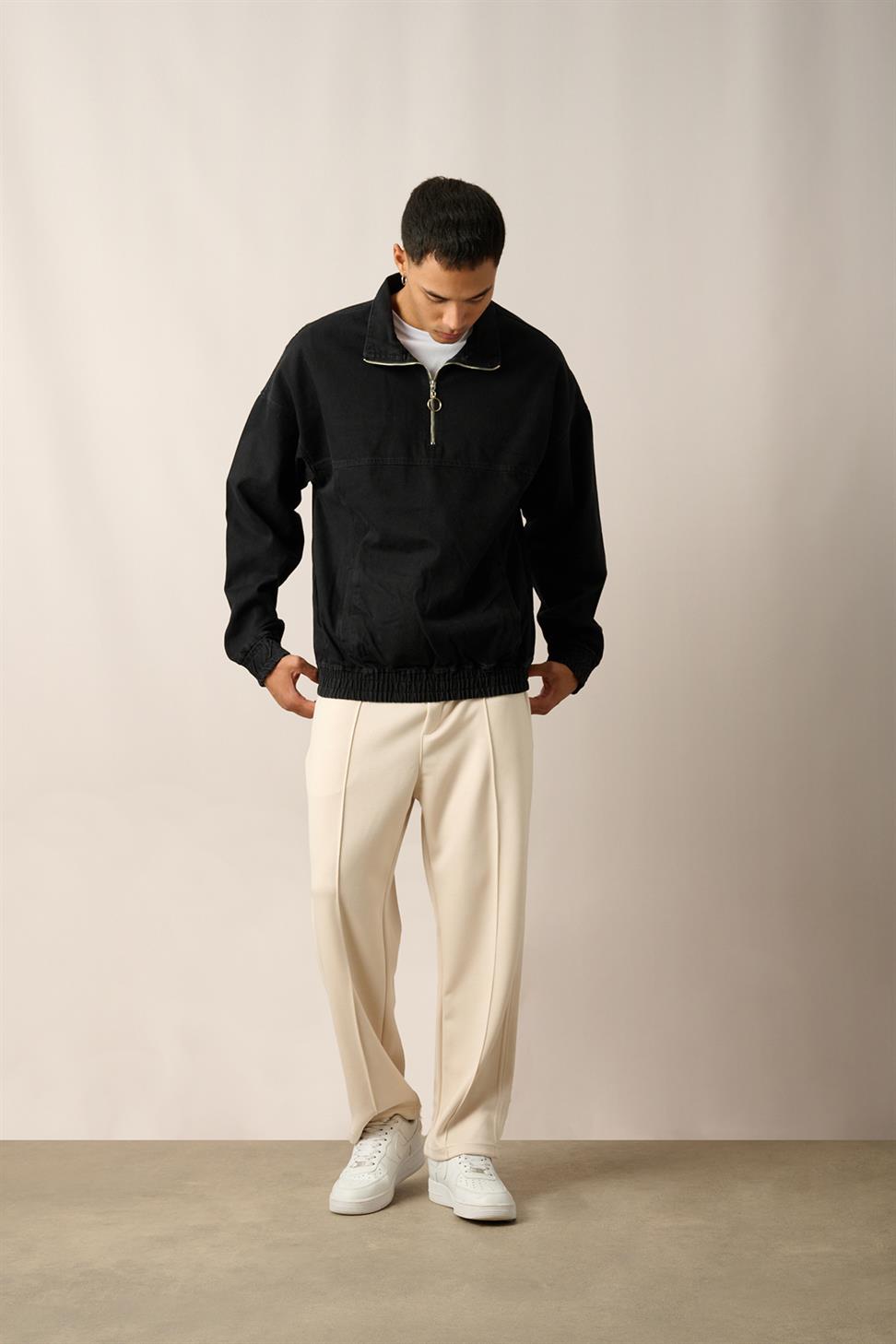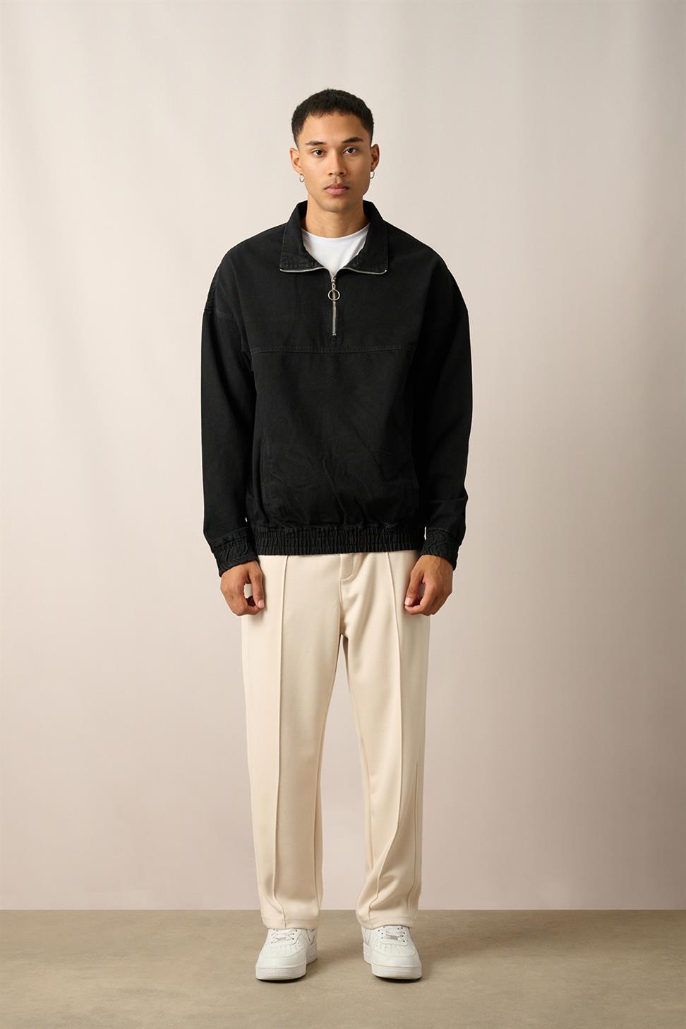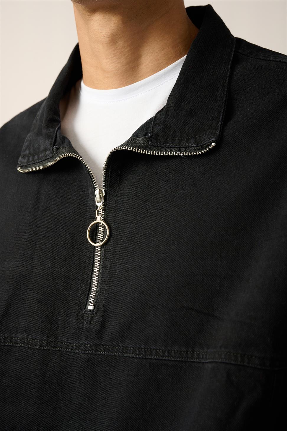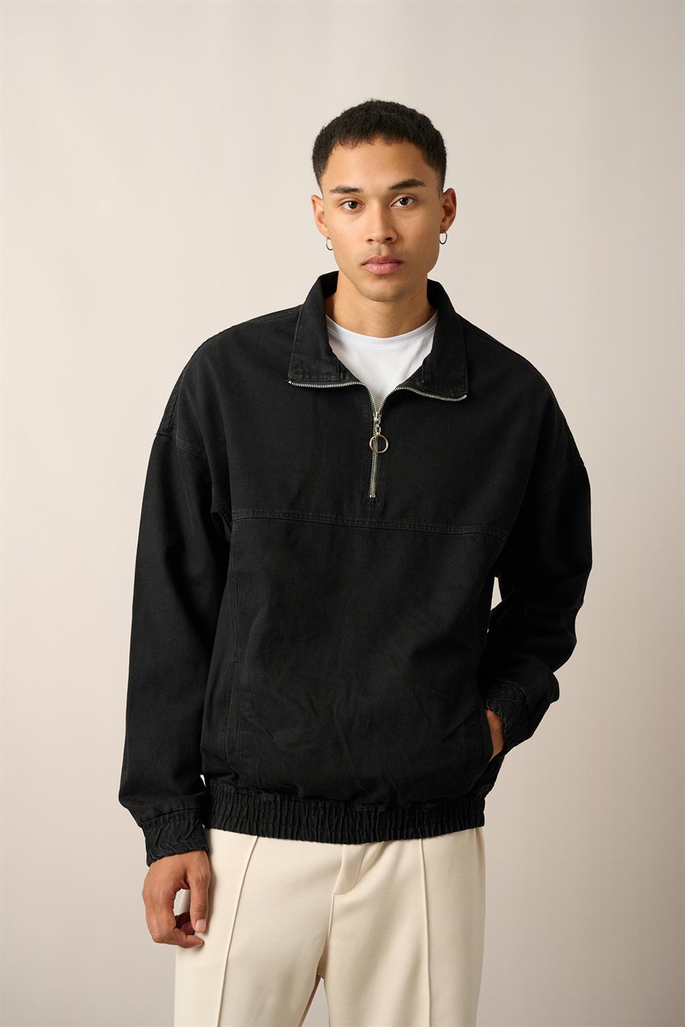 A modern take on casualwear, this half-zip denim sweatshirt in black is designed with elastic hem and cuffs for a comfortable fit and stylish silhouette. Crafted from 100% cotton denim fabric, it combines durability with breathable comfort, making it a versatile piece for everyday outfits.