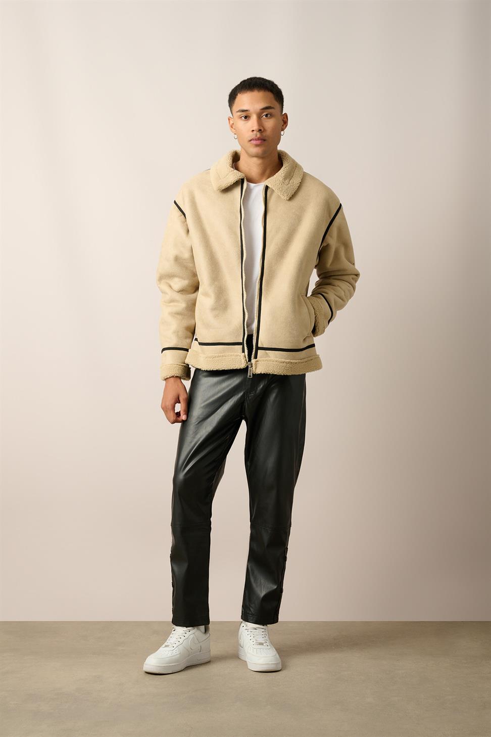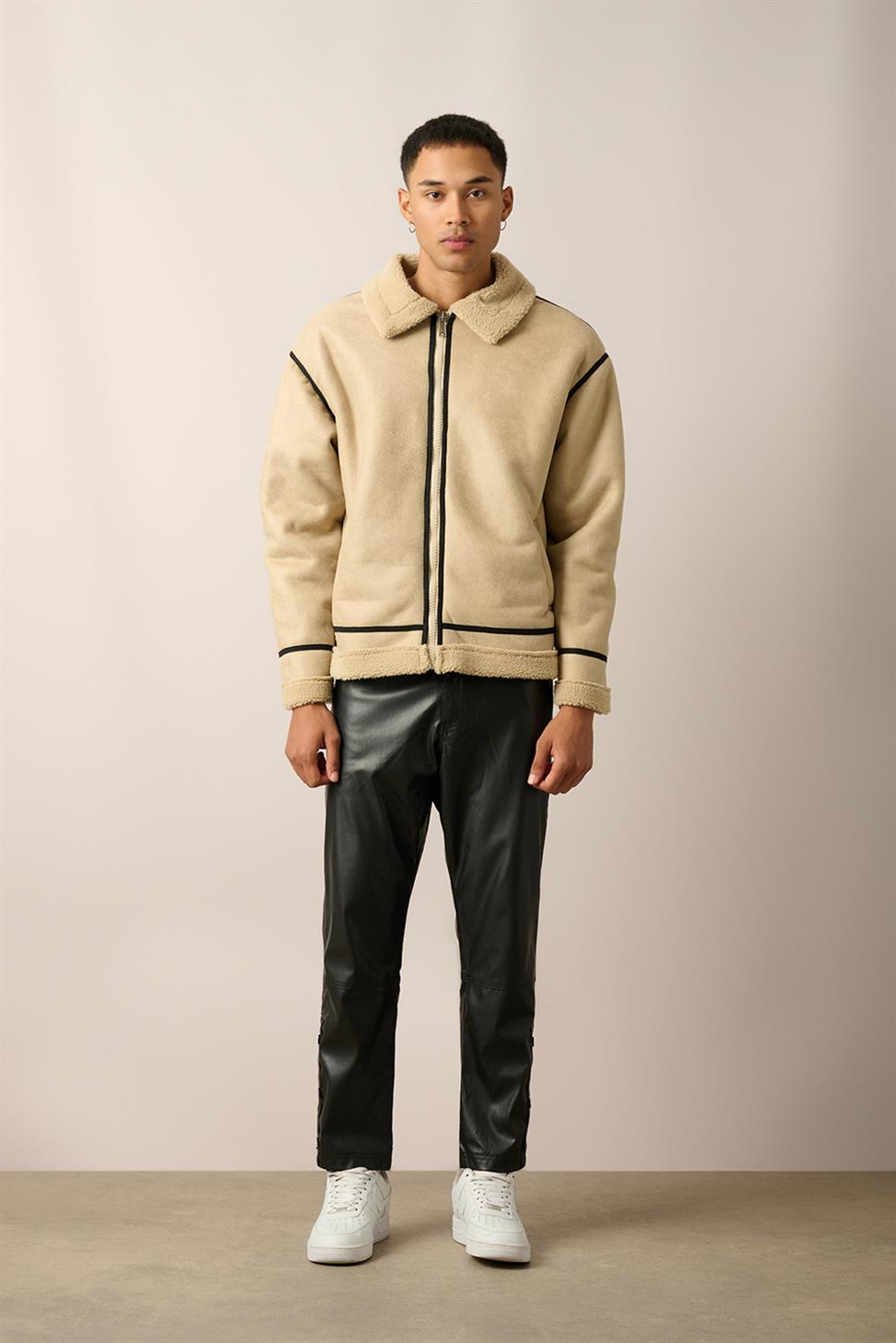 Designed for both style and comfort, this jacket features bold striped details, a functional zip closure, and a warm faux shearling lining. Crafted from 100% polyester nubuck leather, it combines durability with a modern look, making it a must-have piece for your seasonal wardrobe.