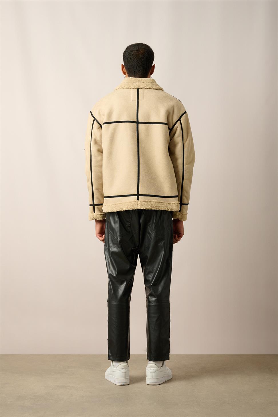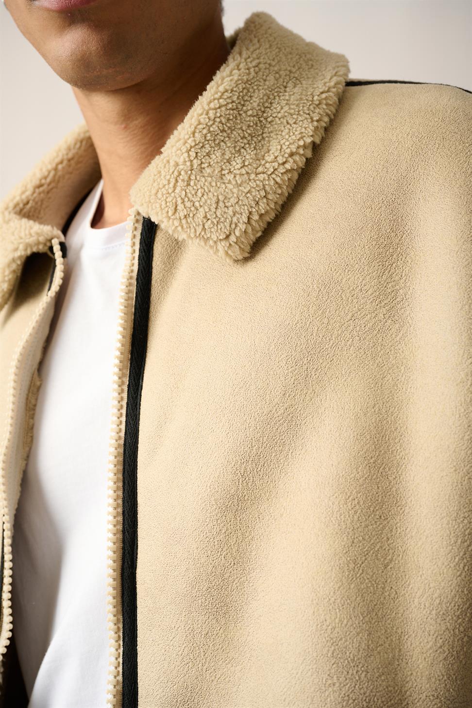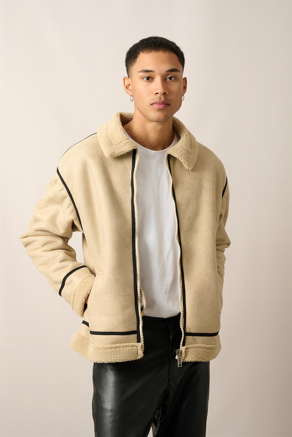 R-2461 Striped Detail Zippered Faux Shearling Jacket
