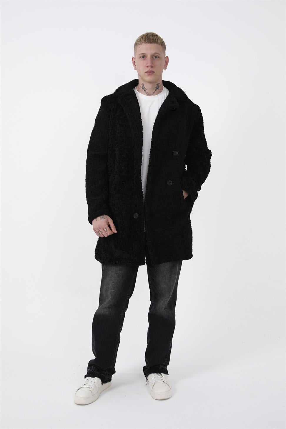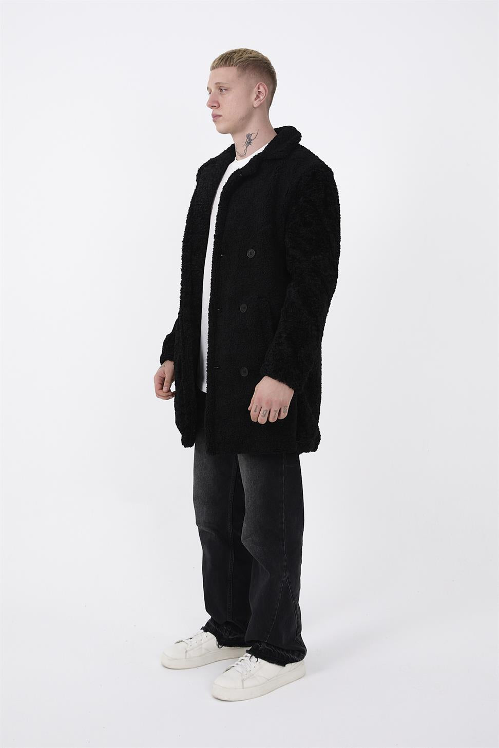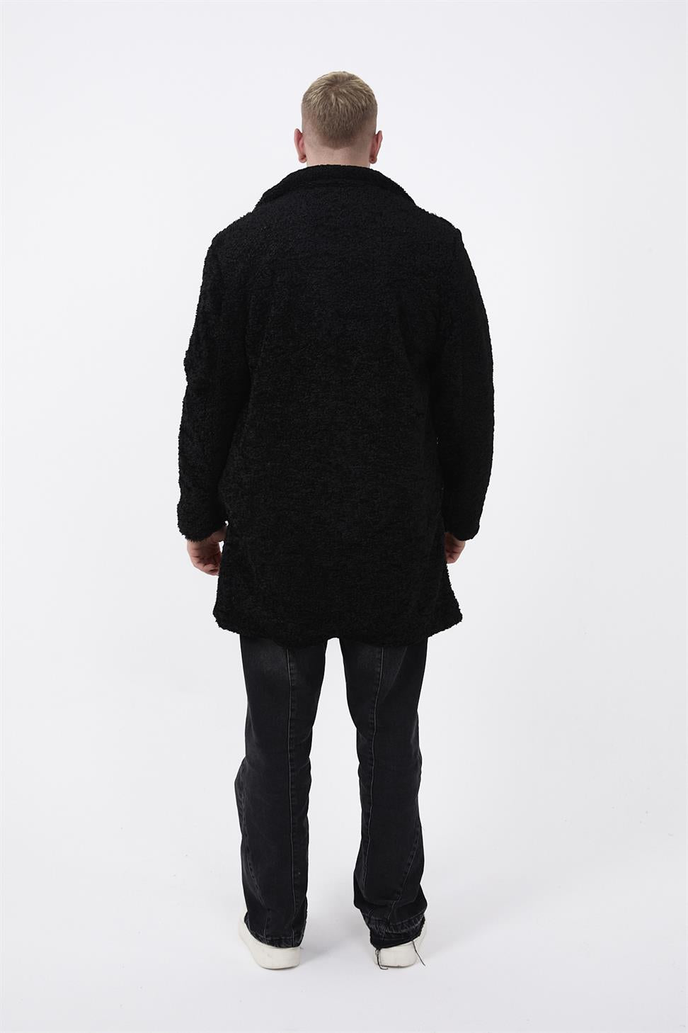 R-2469 Men’s Long Plush Coat with Side Slit and Lining – Black