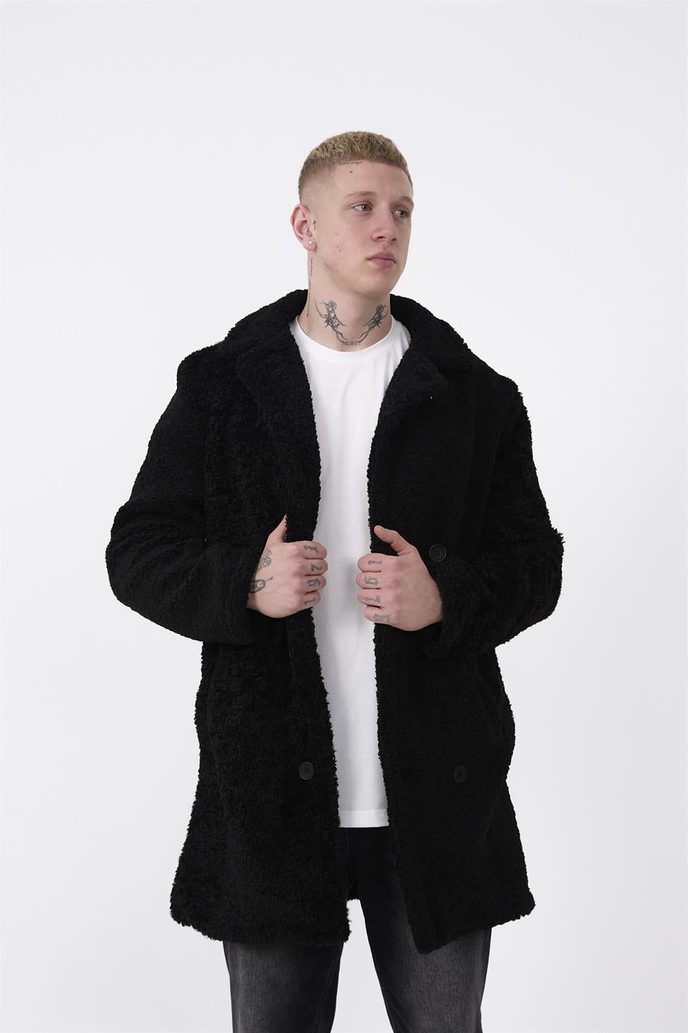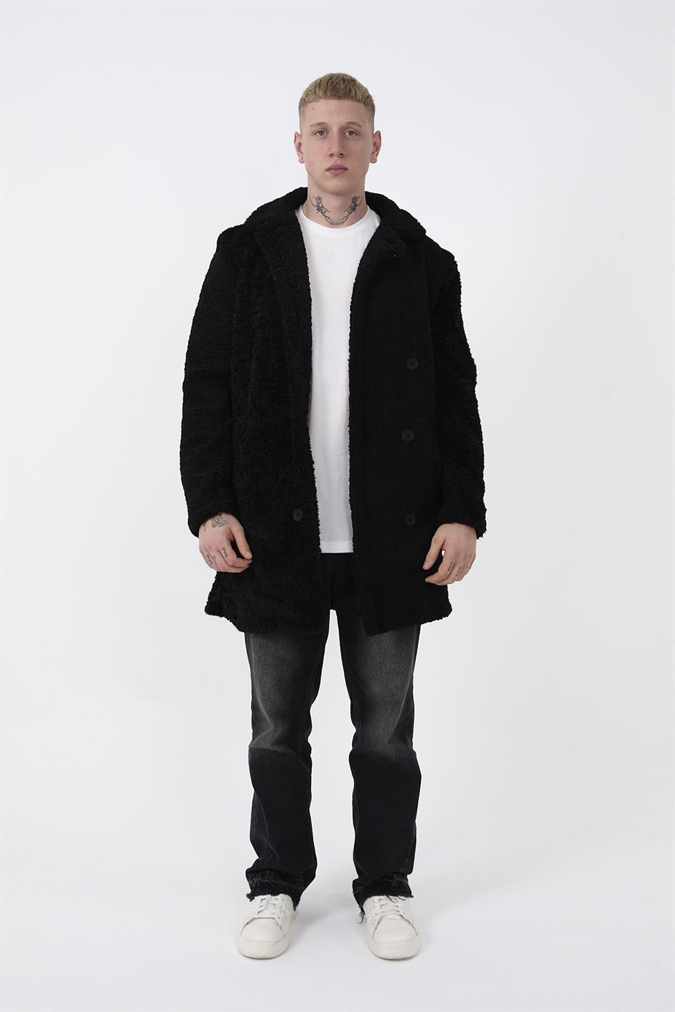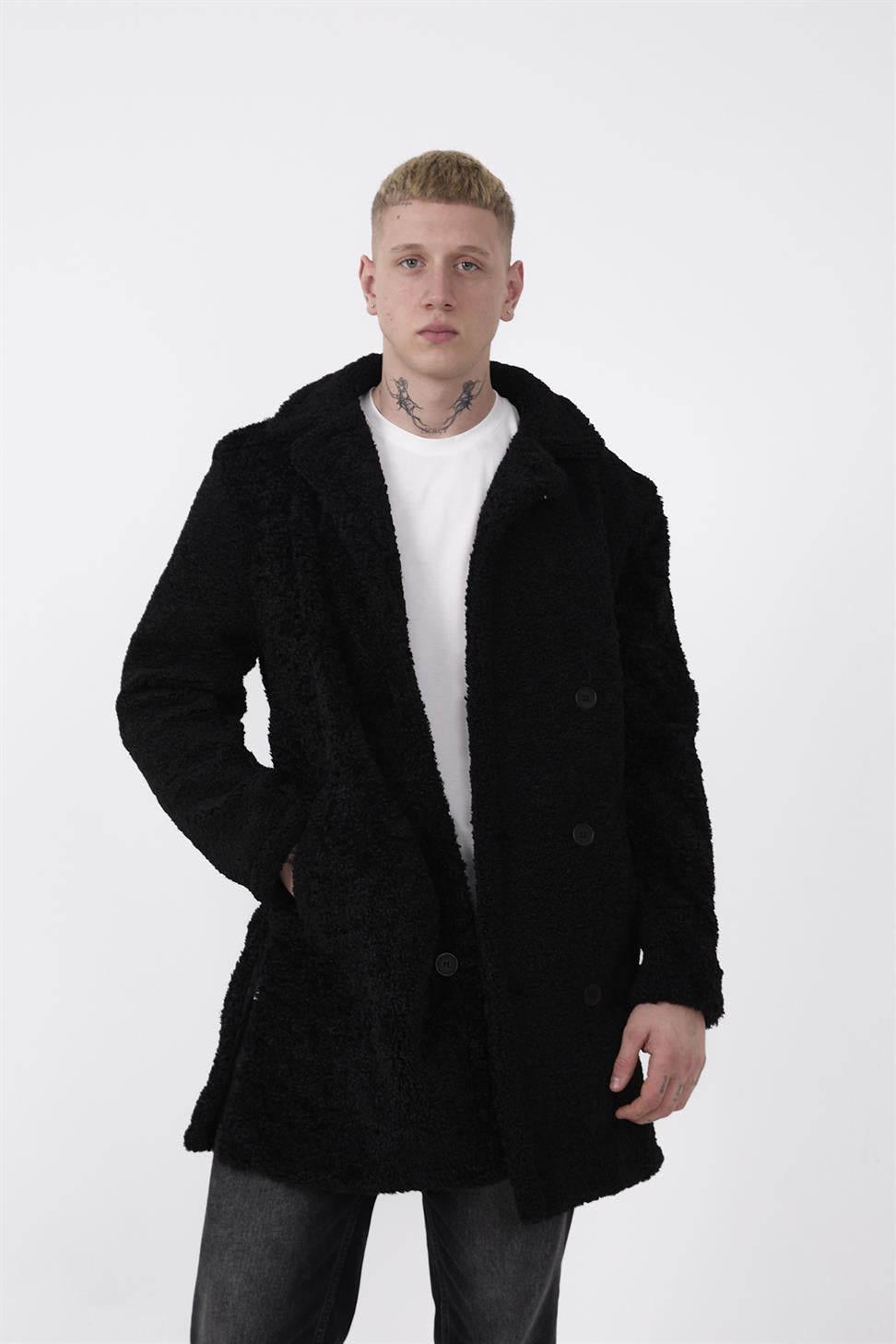 R-2469 Men’s Long Plush Coat with Side Slit and Lining – Black