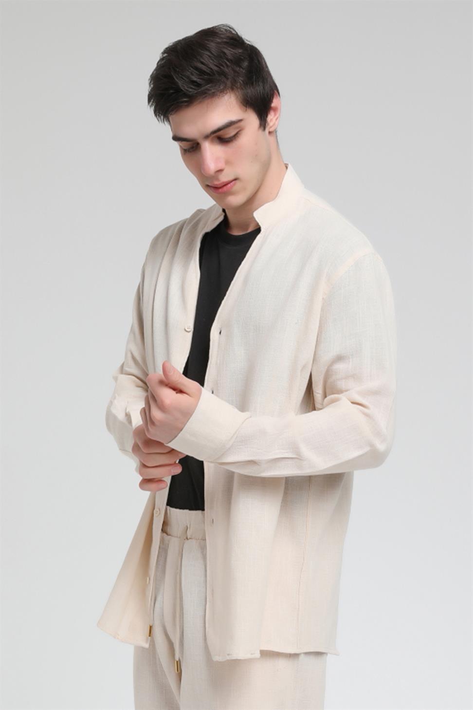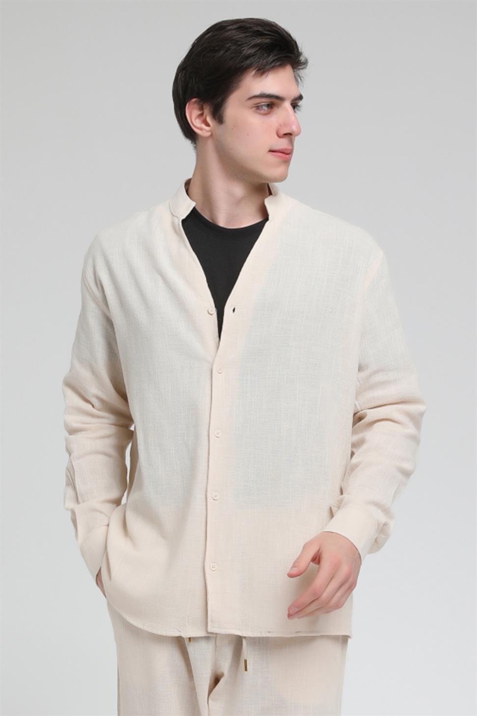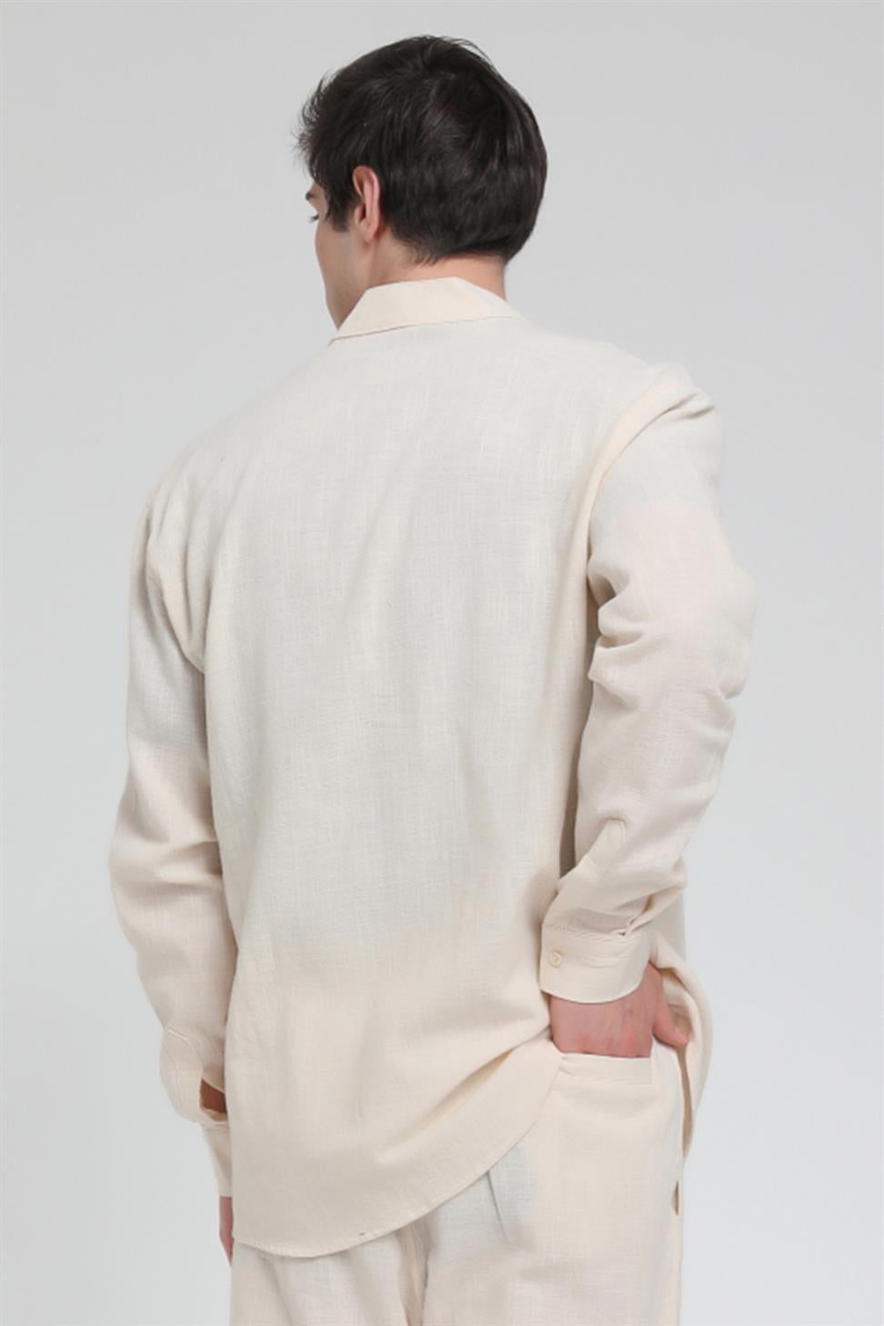 R-3608 Hakim V Yaka Uzun Kol Oversize Keten Karışımlı Gömlek