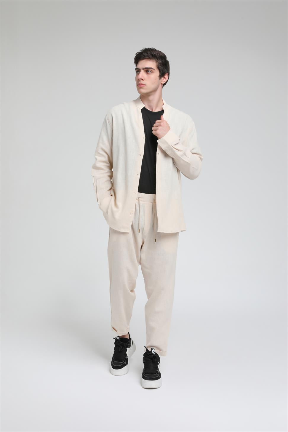 Hakim V Yaka Uzun Kol Oversize Keten Karışımlı Gömlek