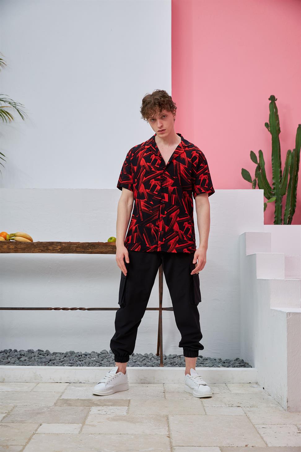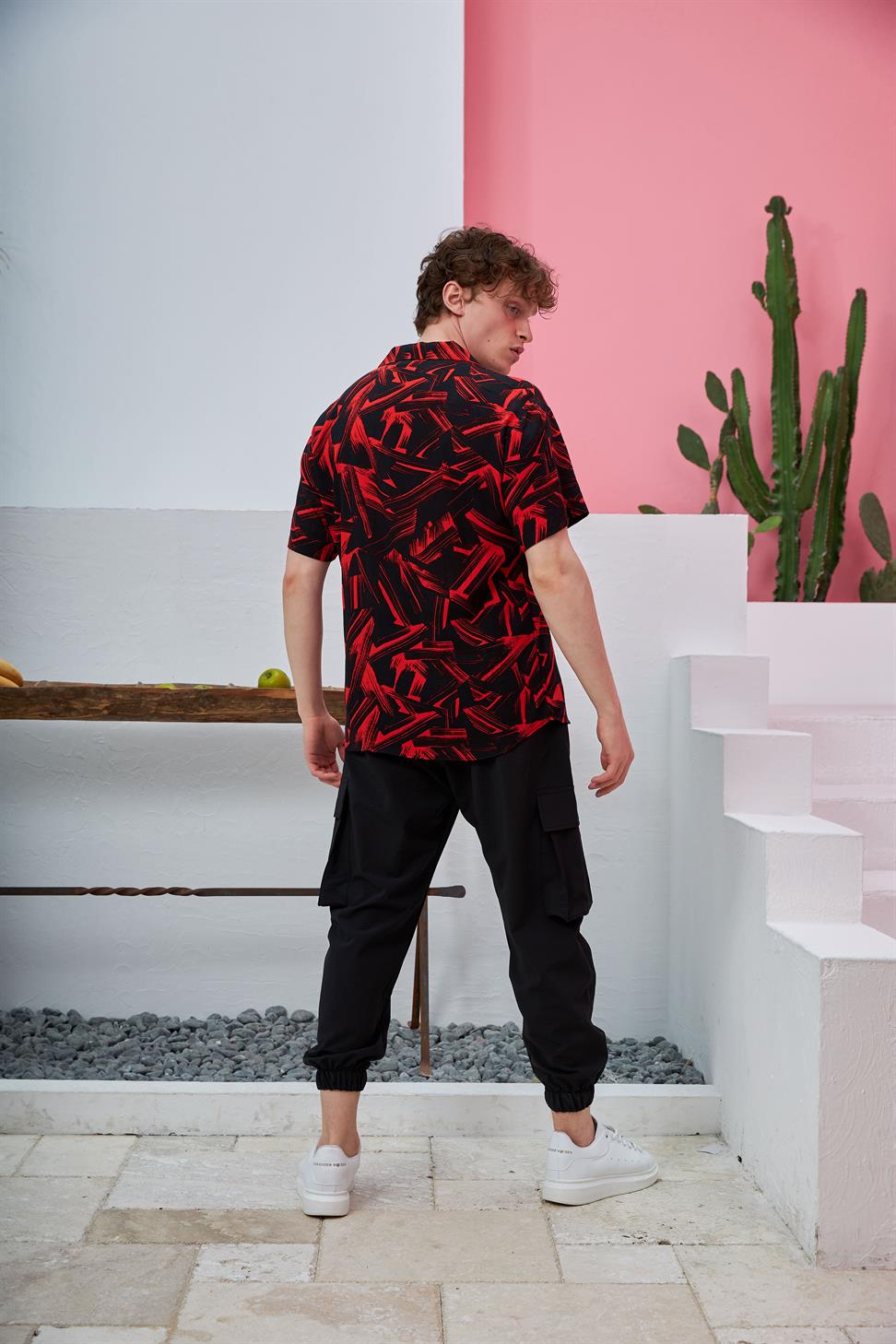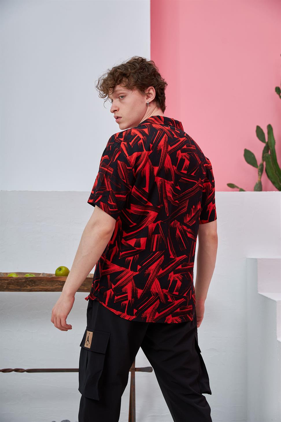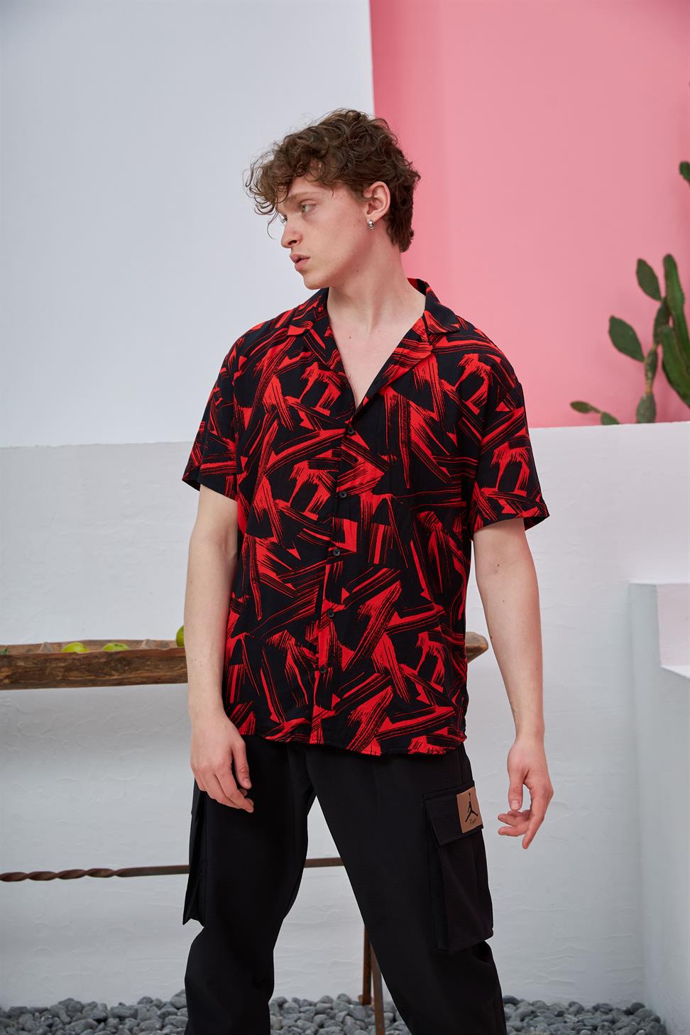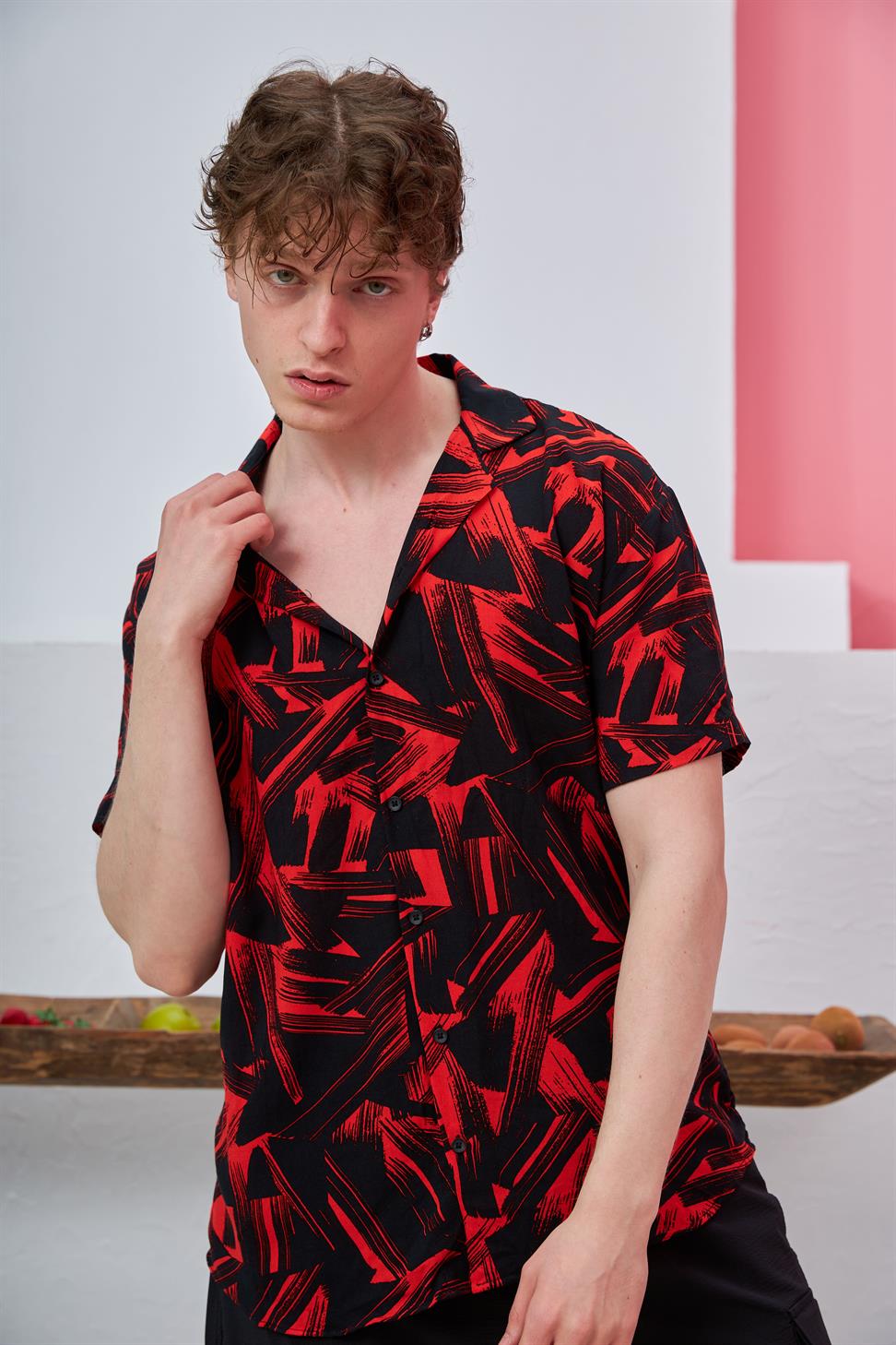 Fırça Desenli Apaş Yaka Kısa Kol Gömlek