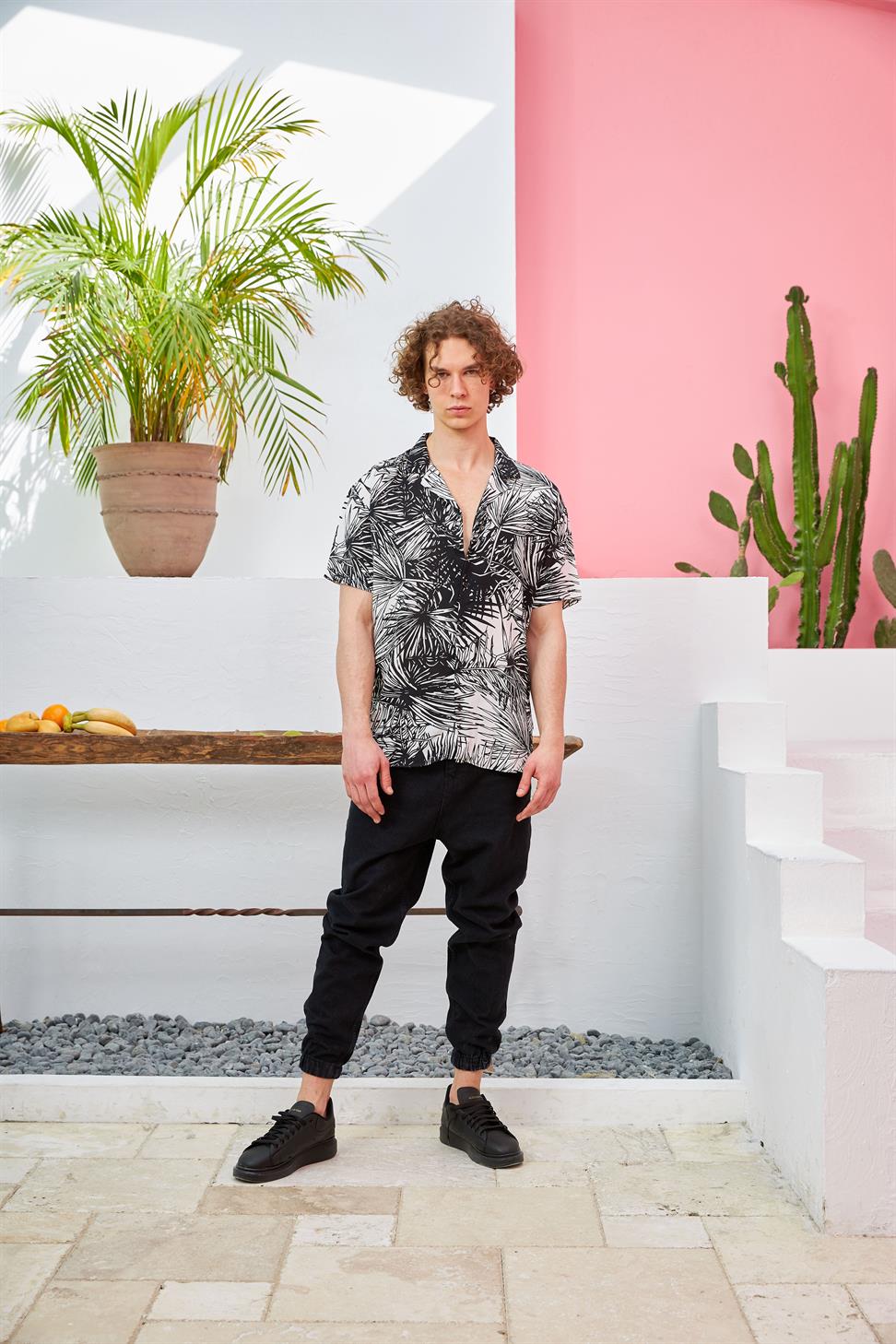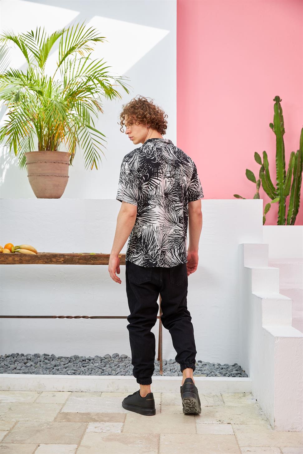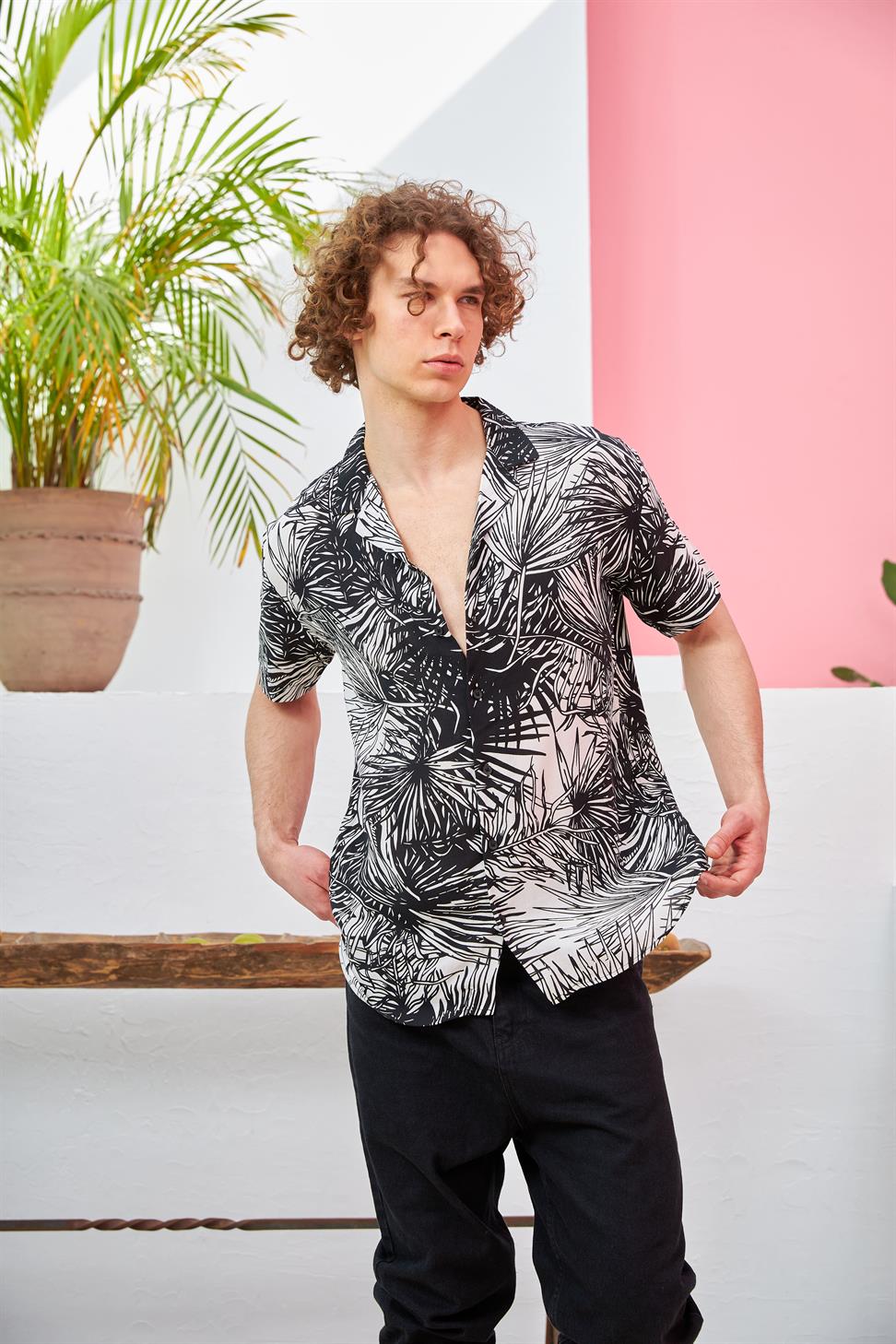 Apaş Yaka Palmiye Desenli Kısa Kol Gömlek