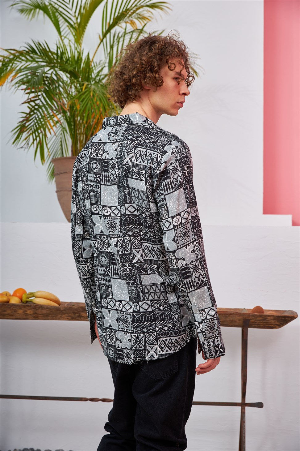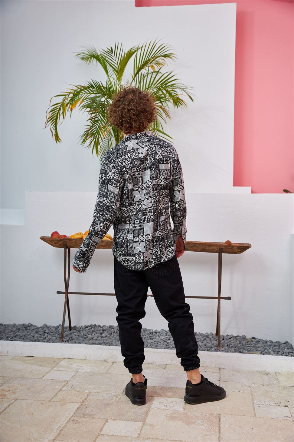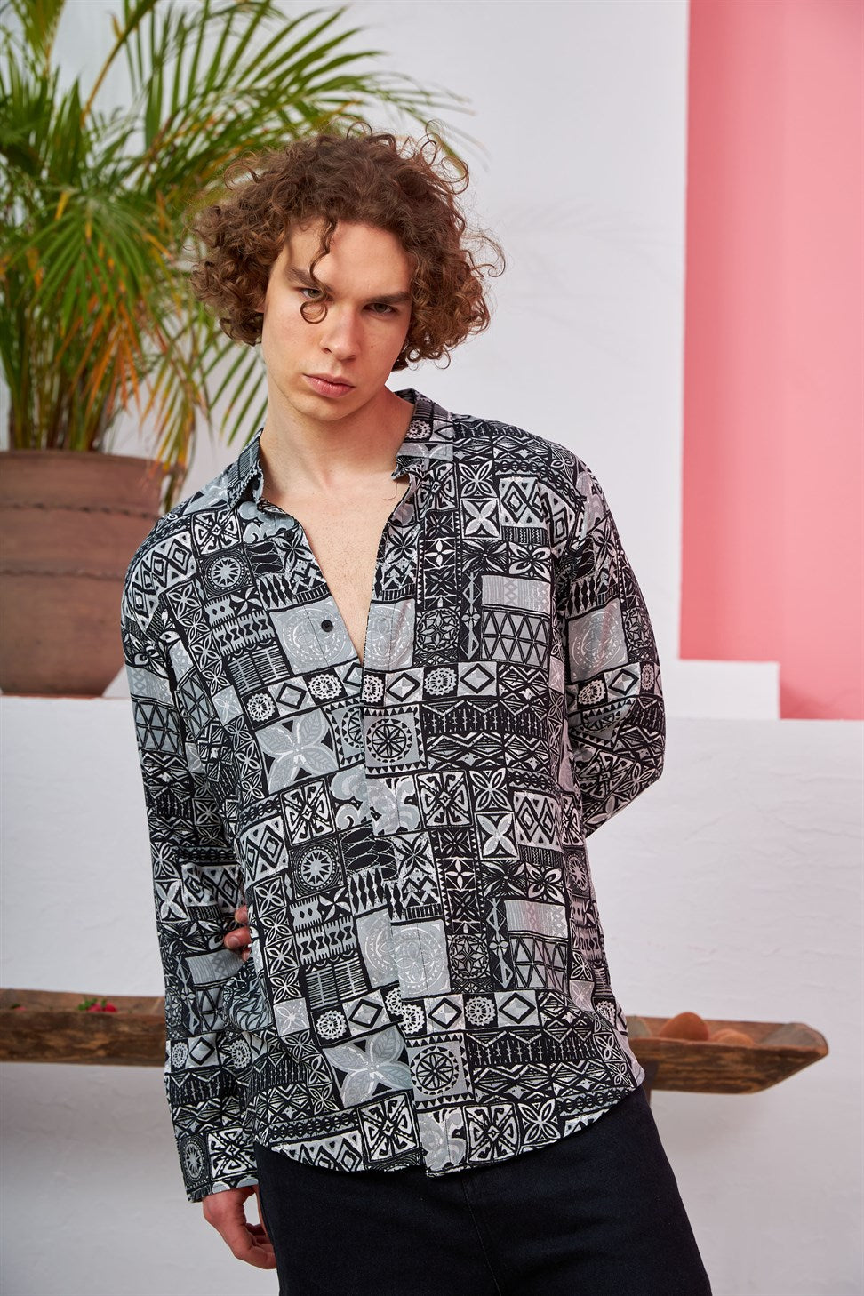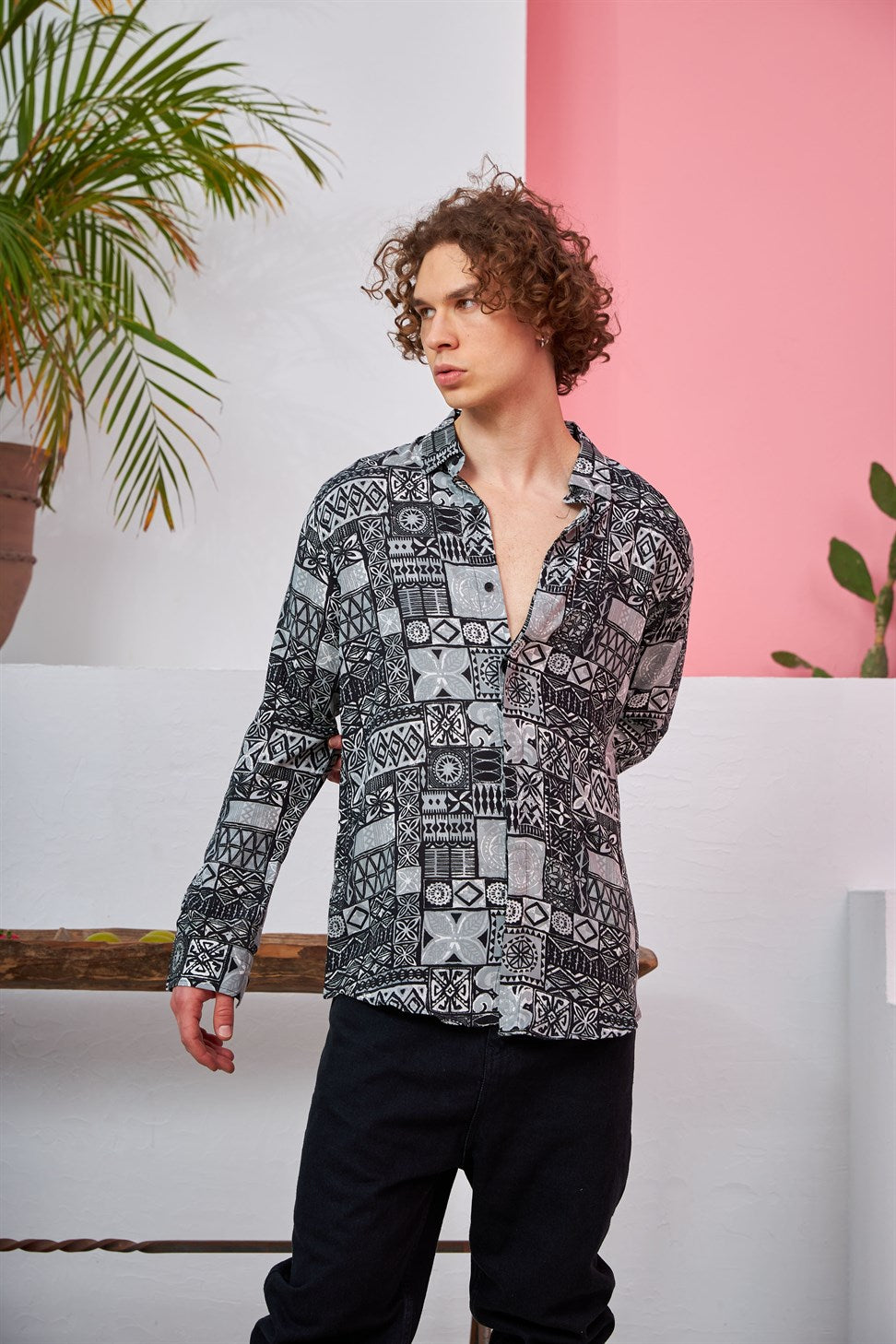 A refined long-sleeve shirt featuring an all-over ethnic pattern and a hidden (concealed) placket for a clean, modern look. Cut in a smooth, drapey 100% poly-viscose (polyester–viscose) fabric that’s breathable, wrinkle-resistant, and easy to style from desk to dinner.