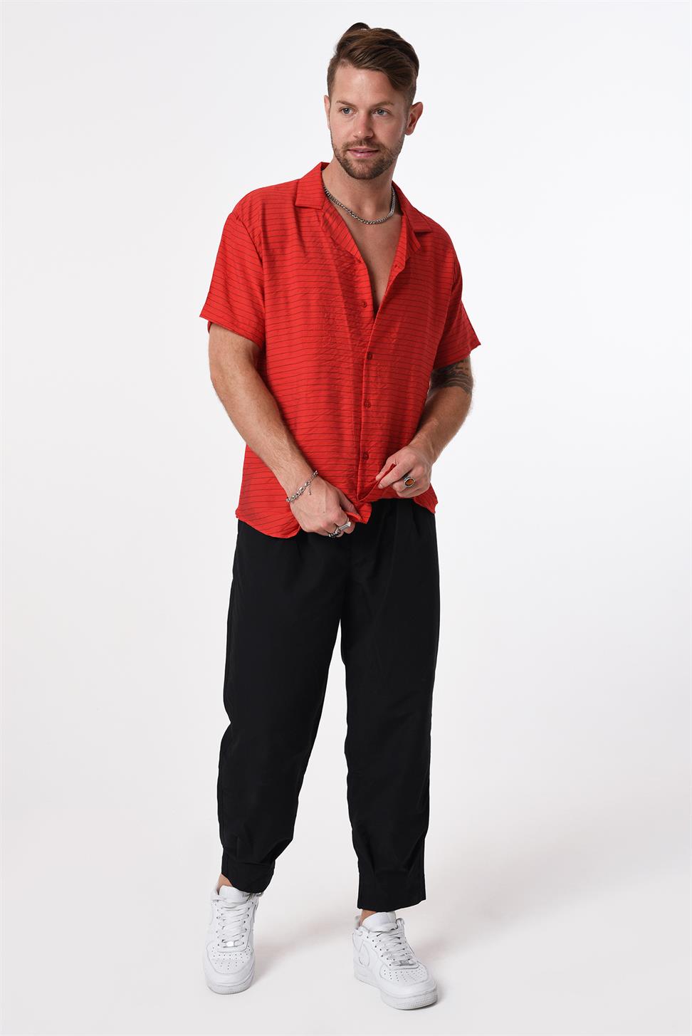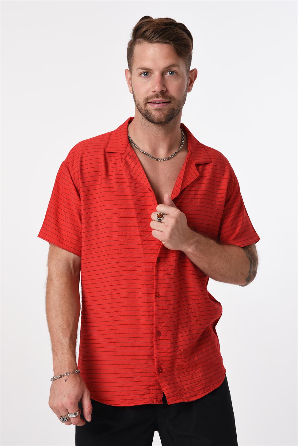 A breezy, resort-inspired striped shirt with a clean camp (Cuban) collar and short sleeves. Crafted from 100% polyester for a smooth touch, wrinkle resistance, and easy care—smart enough for evenings out, relaxed enough for everyday wear.
