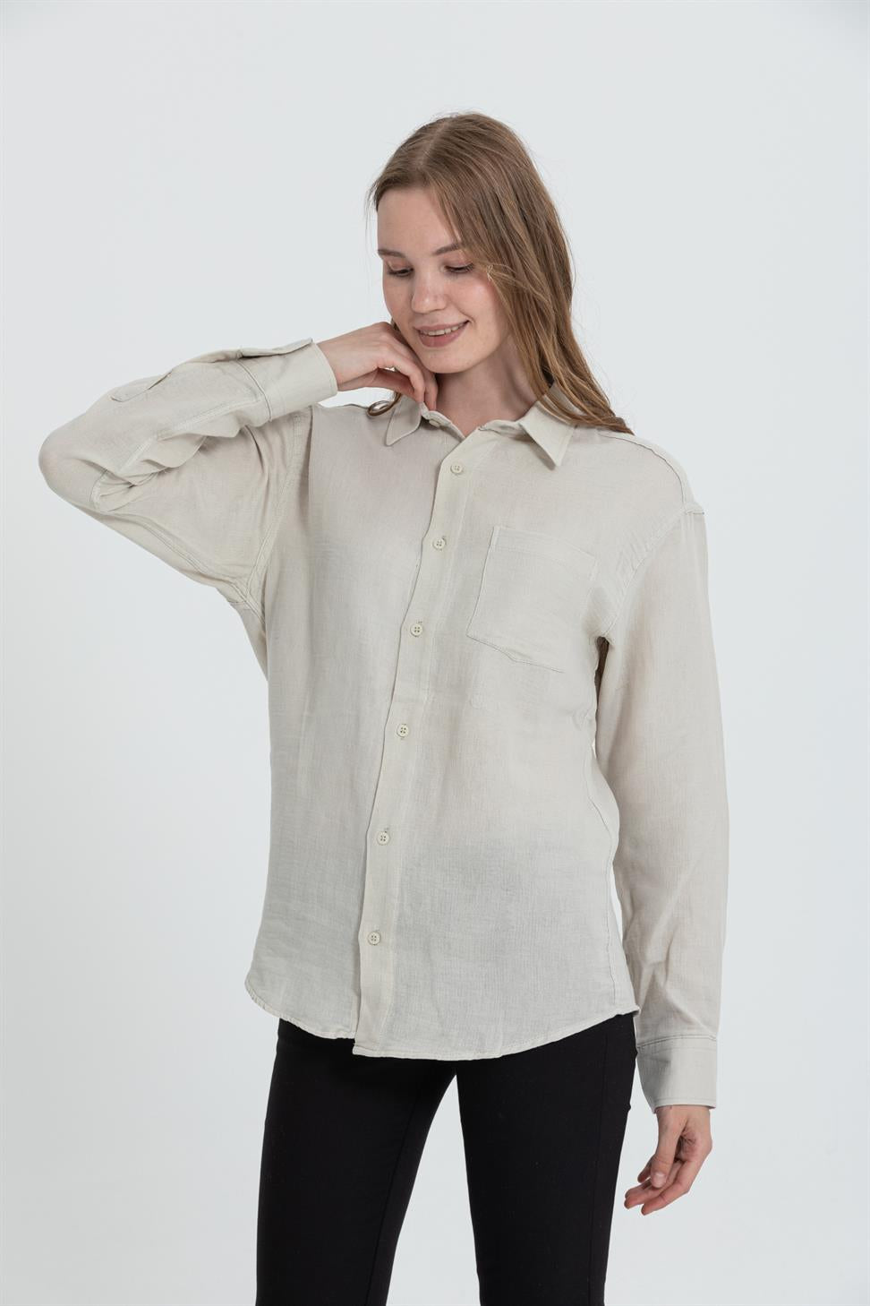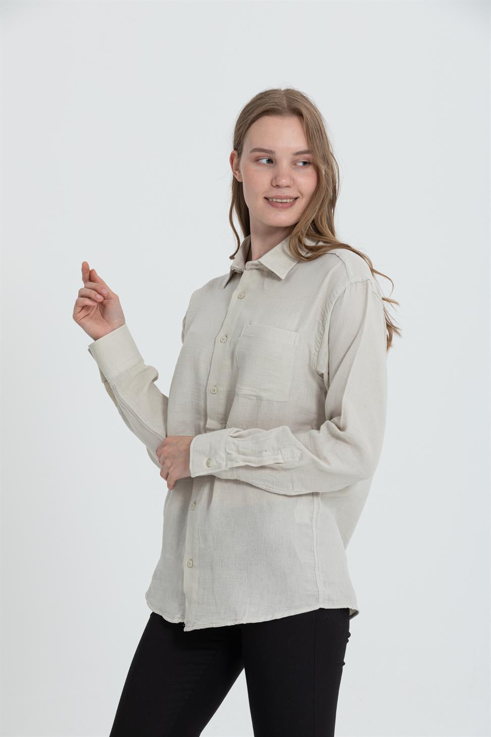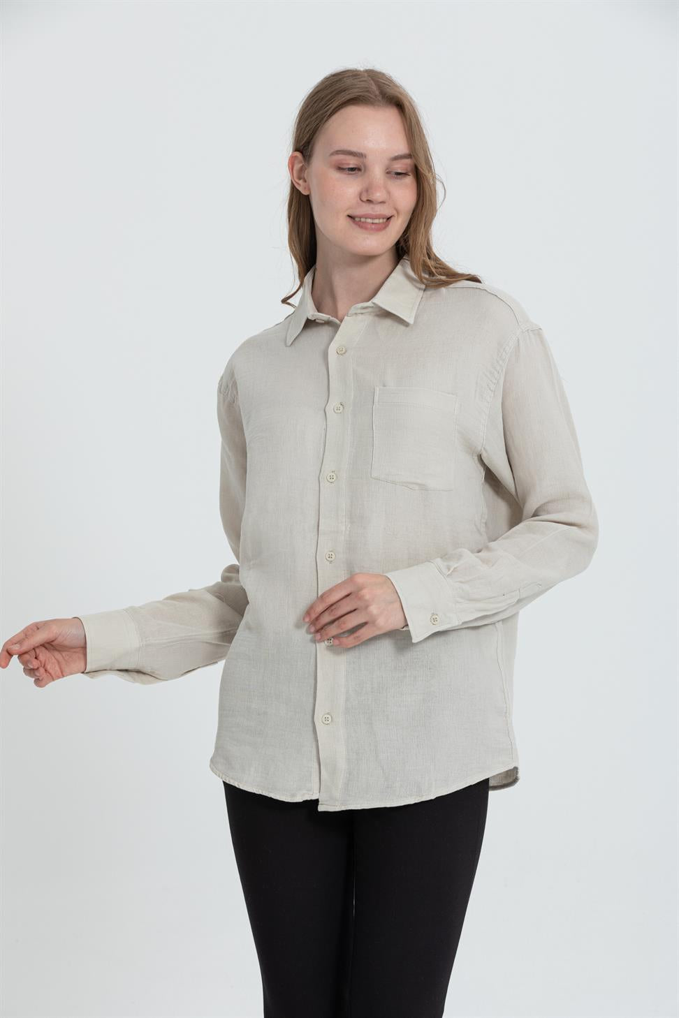 A clean, modern long-sleeve shirt in beige with a grandad (stand) collar and a single chest pocket. Made from 100% polyester for a smooth feel, easy care, and reliable shape retention—smart enough for work, relaxed enough for every day.