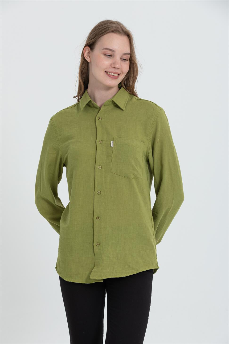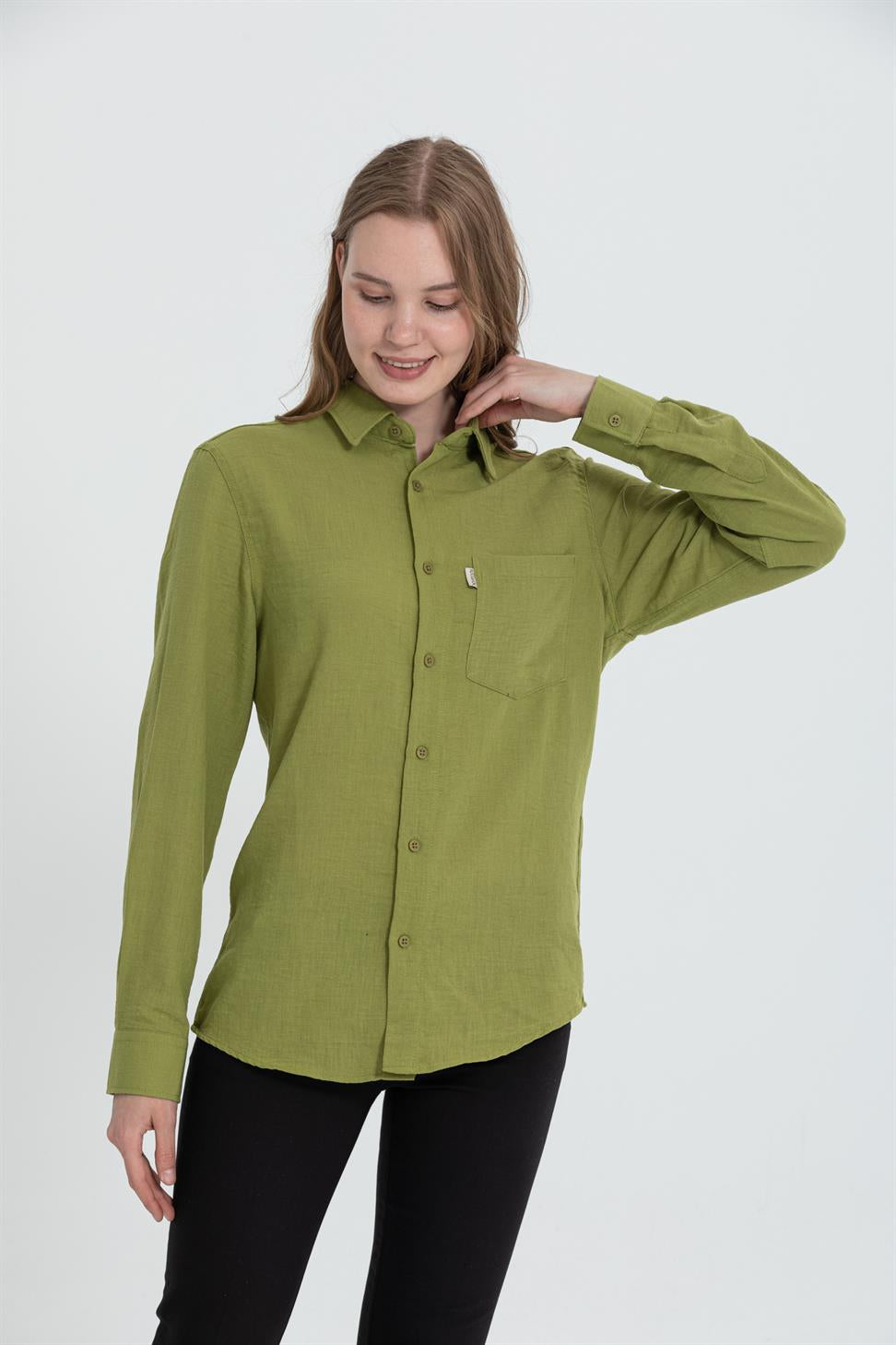 A clean, modern long-sleeve shirt in green with a grandad (stand) collar and a single chest pocket. Made from 100% polyester for a smooth feel, easy care, and reliable shape retention—smart enough for work, relaxed enough for every day.