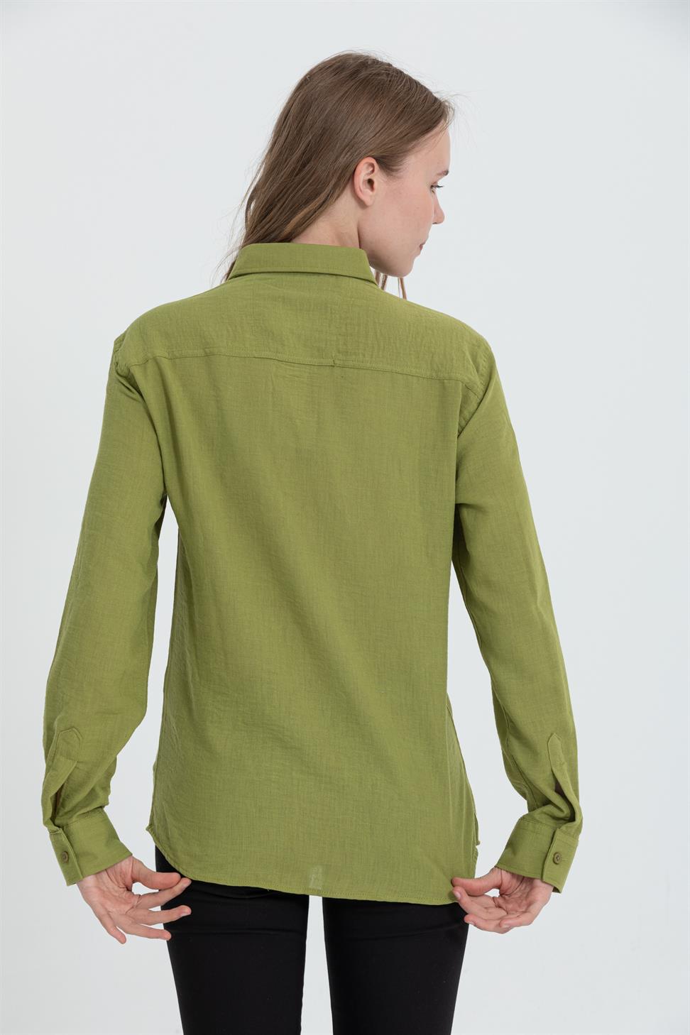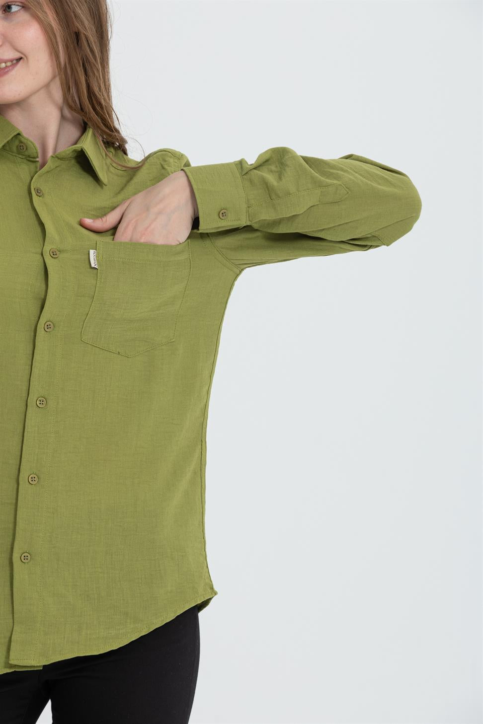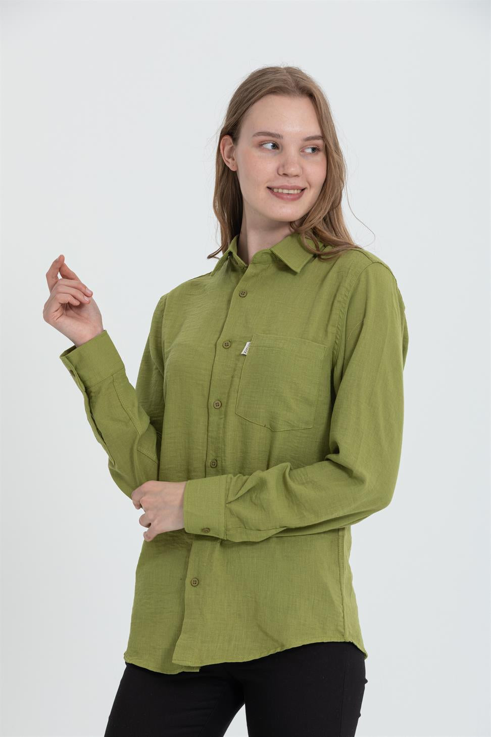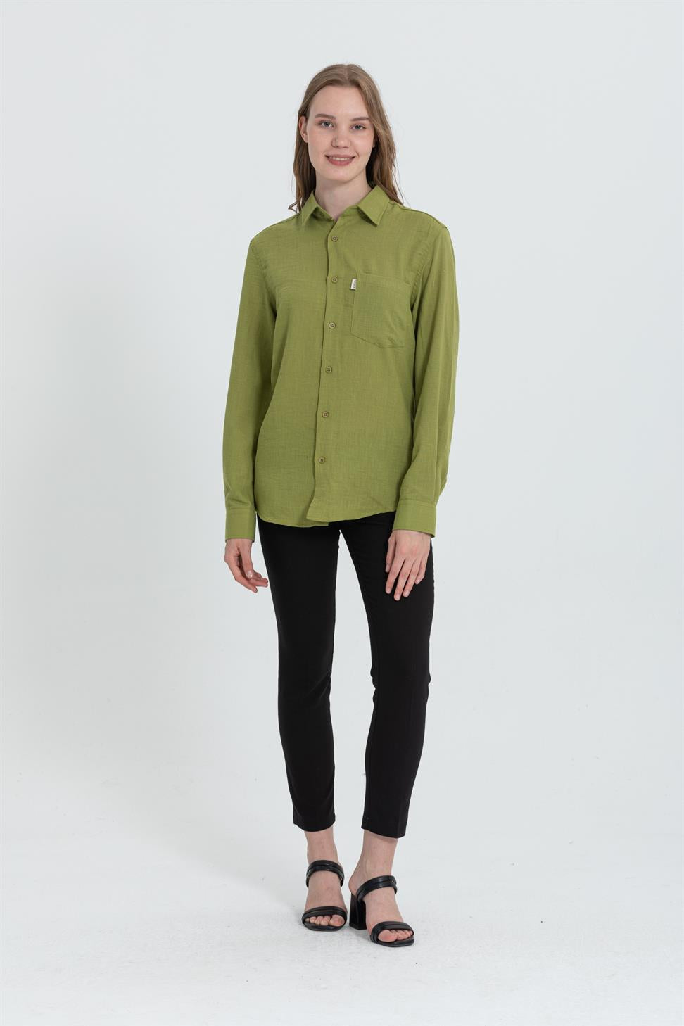 R-3935 Band Collar Long-Sleeve Shirt Green Single Chest Pocket