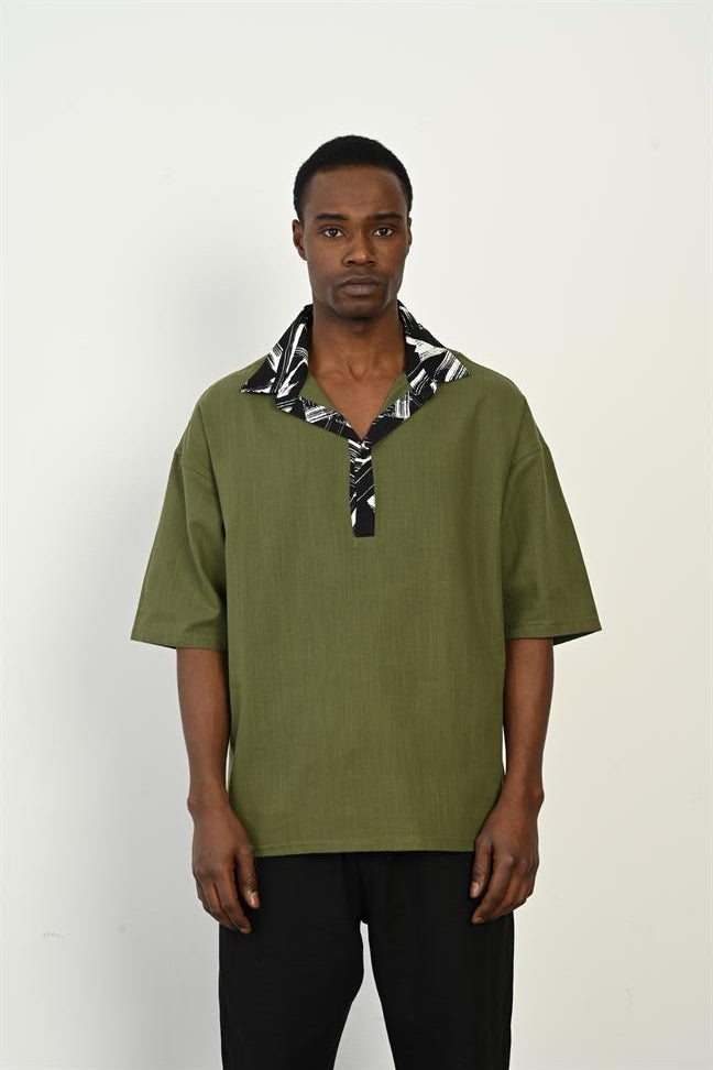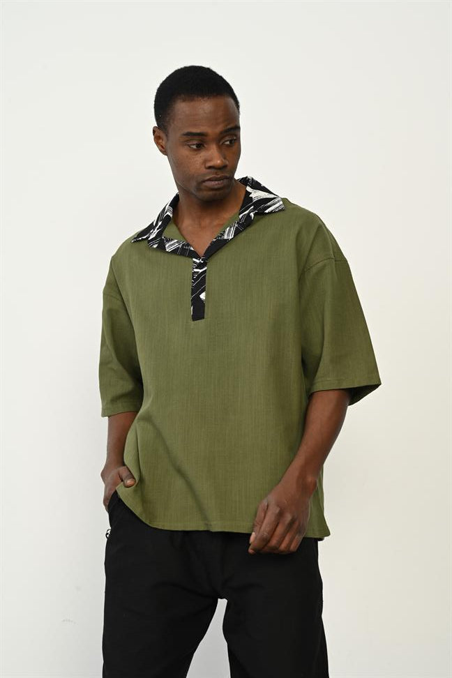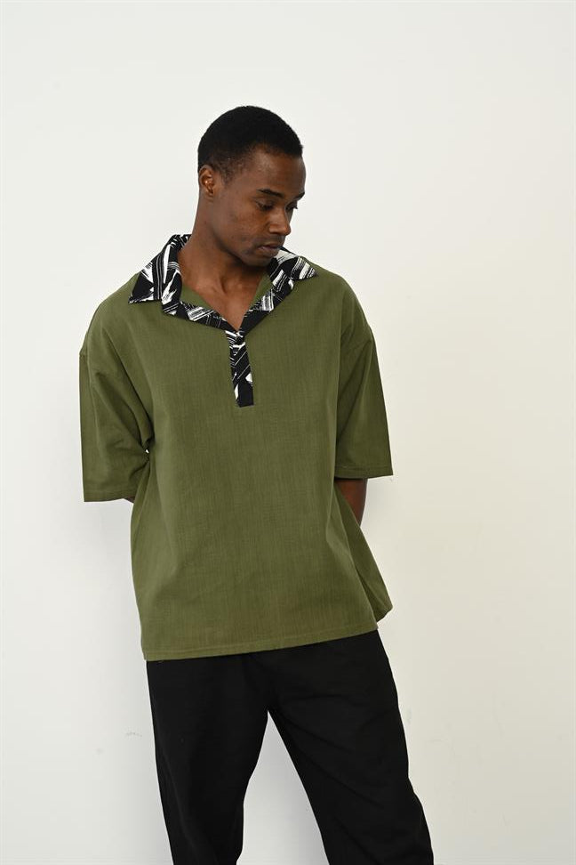 Detail: Contrast trim (garni) at the placket/collar for subtle definition