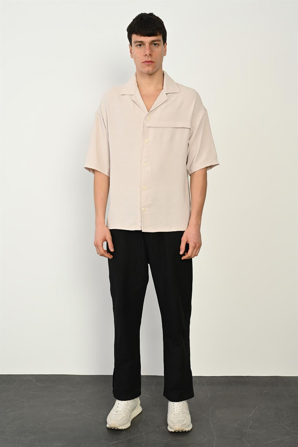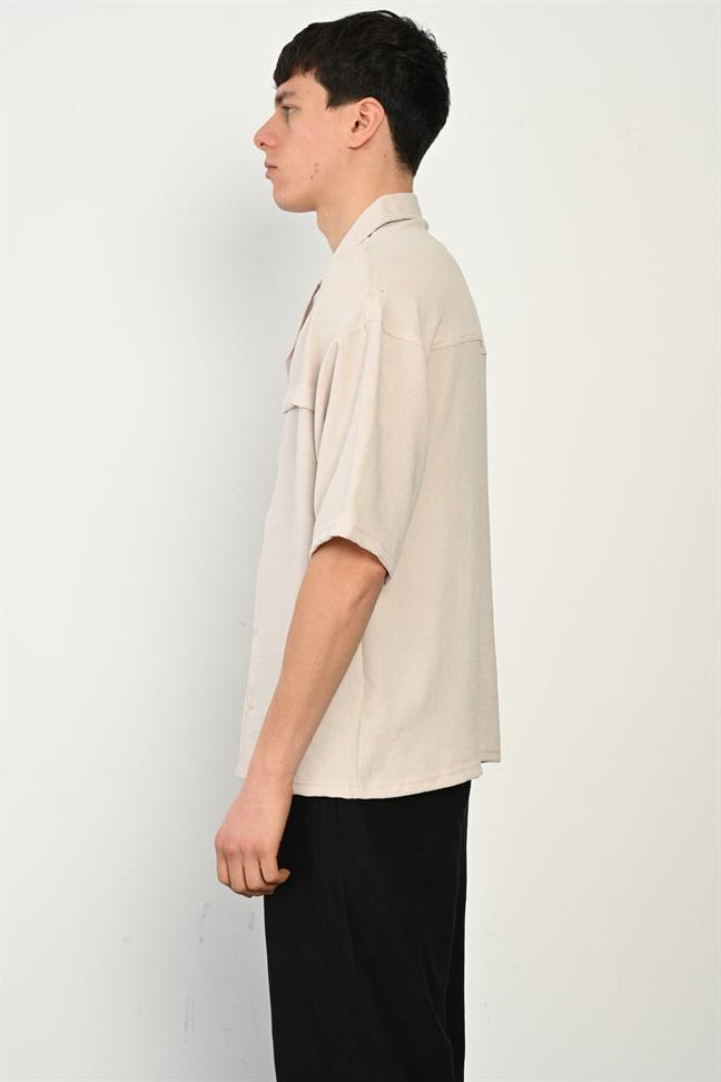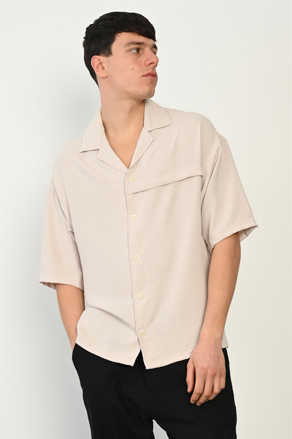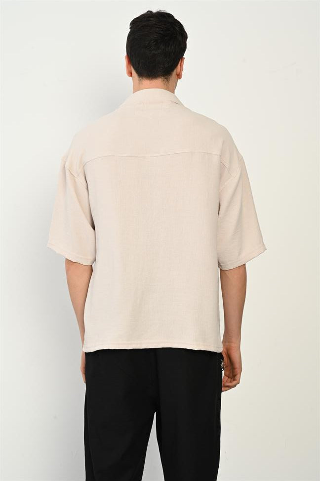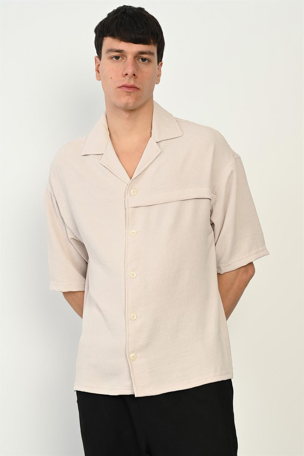 R-3960 Apach Collar Short Sleeve Shirt with Front Placket – Stone