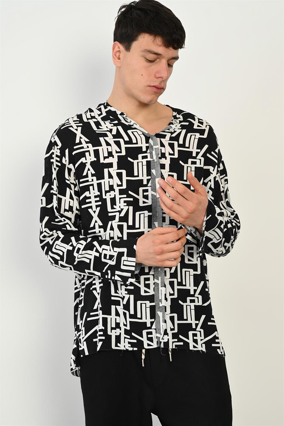 R-3976 Men’s Raw Stitch Detail Long Sleeve Digital Print Buttonless Shirt