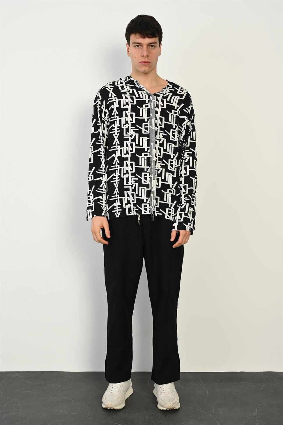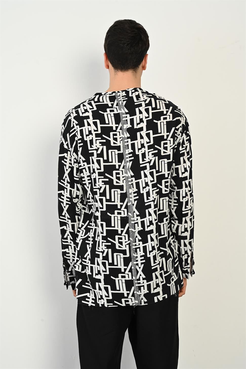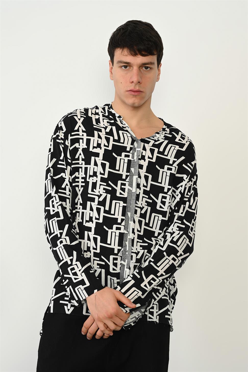 A unique men’s long sleeve buttonless shirt with raw stitch details and eye-catching digital prints. Its modern cut and striking design make it perfect for those who want to stand out with style. Crafted from 100% polyester-viscose fabric, it offers a lightweight feel, softness, and comfort for all-day wear. Ideal to pair with jeans or tailored trousers, this shirt adds a bold and contemporary touch to any wardrobe.