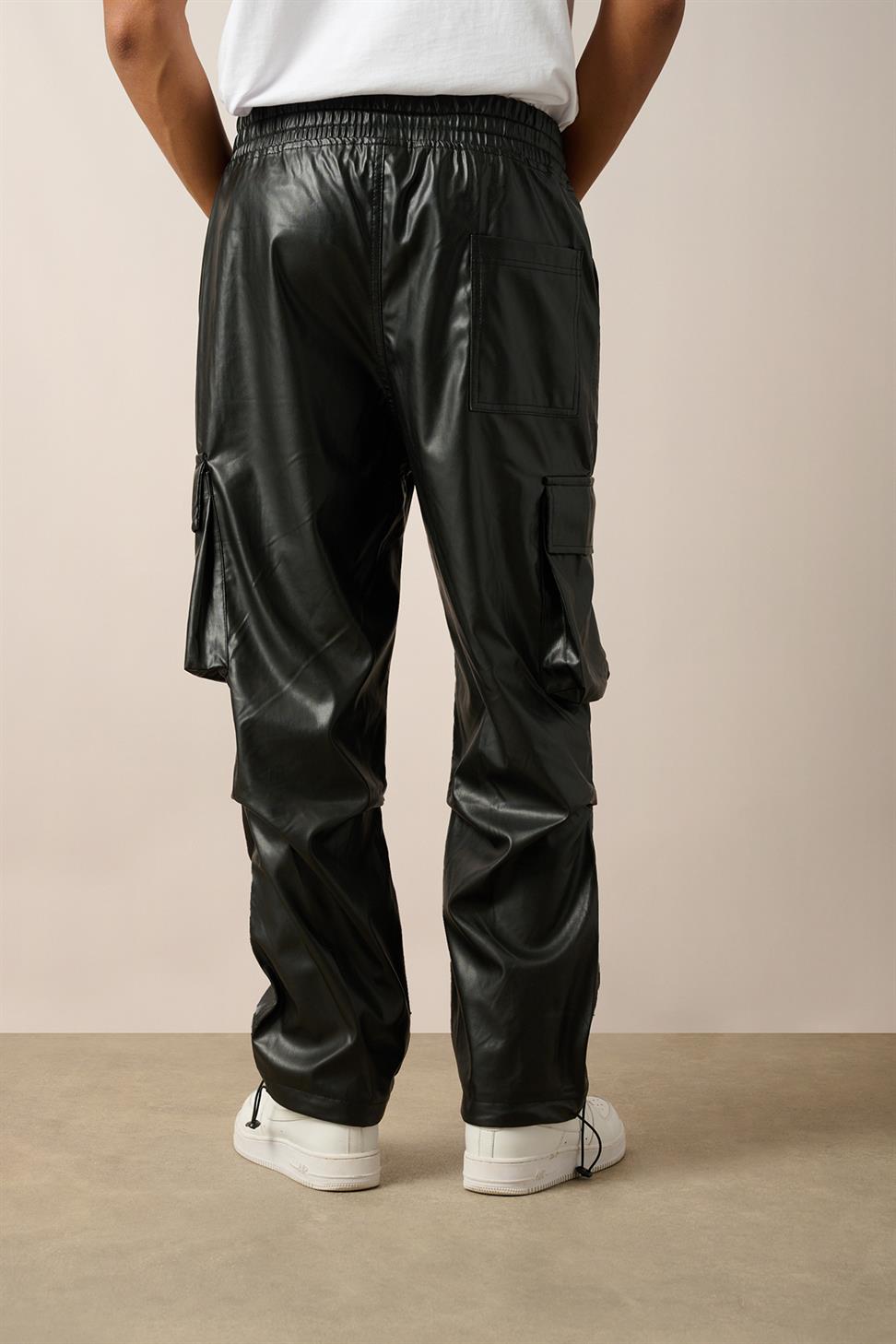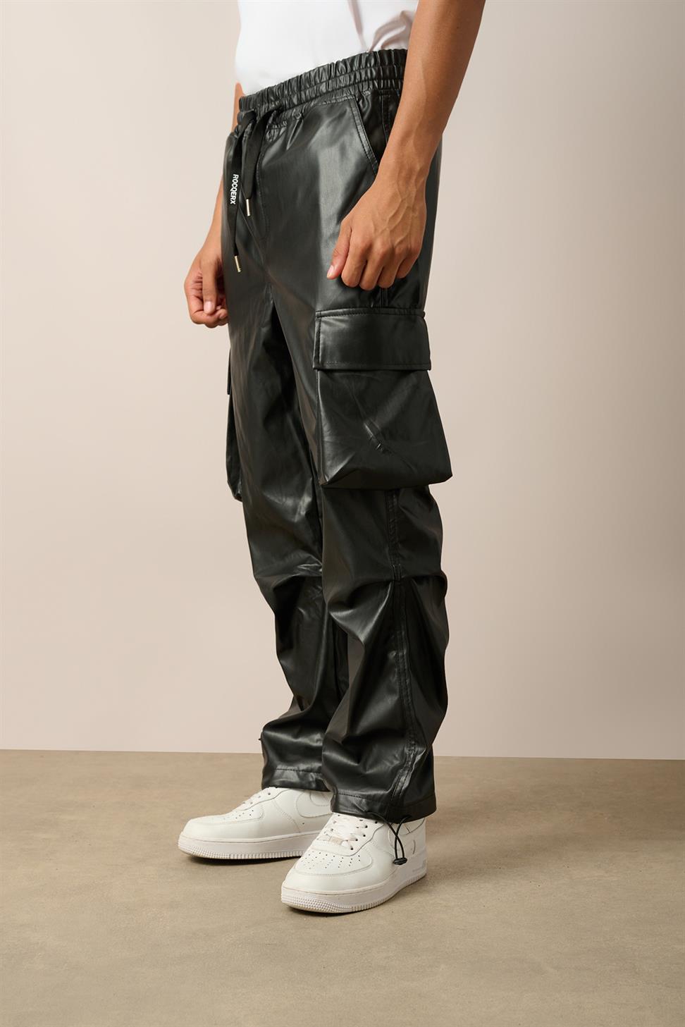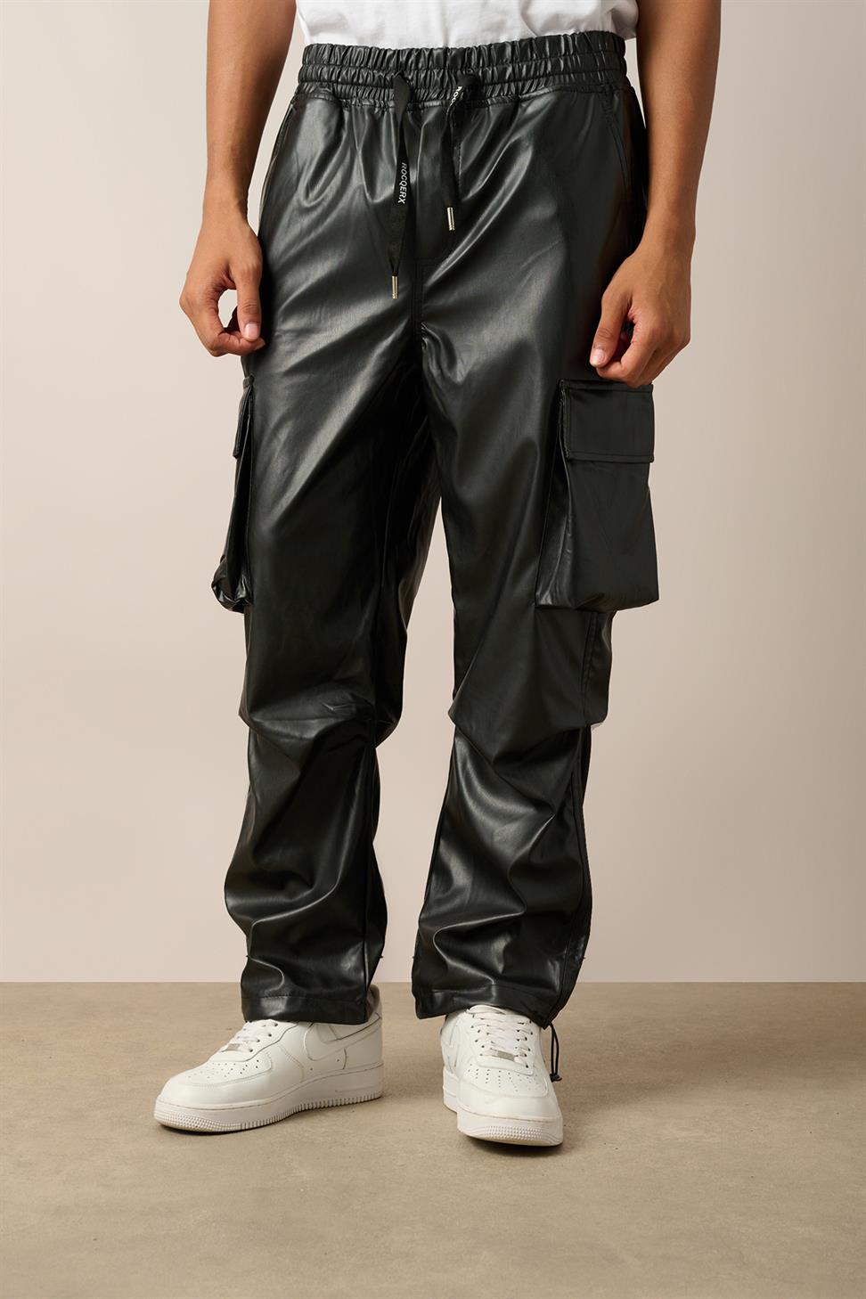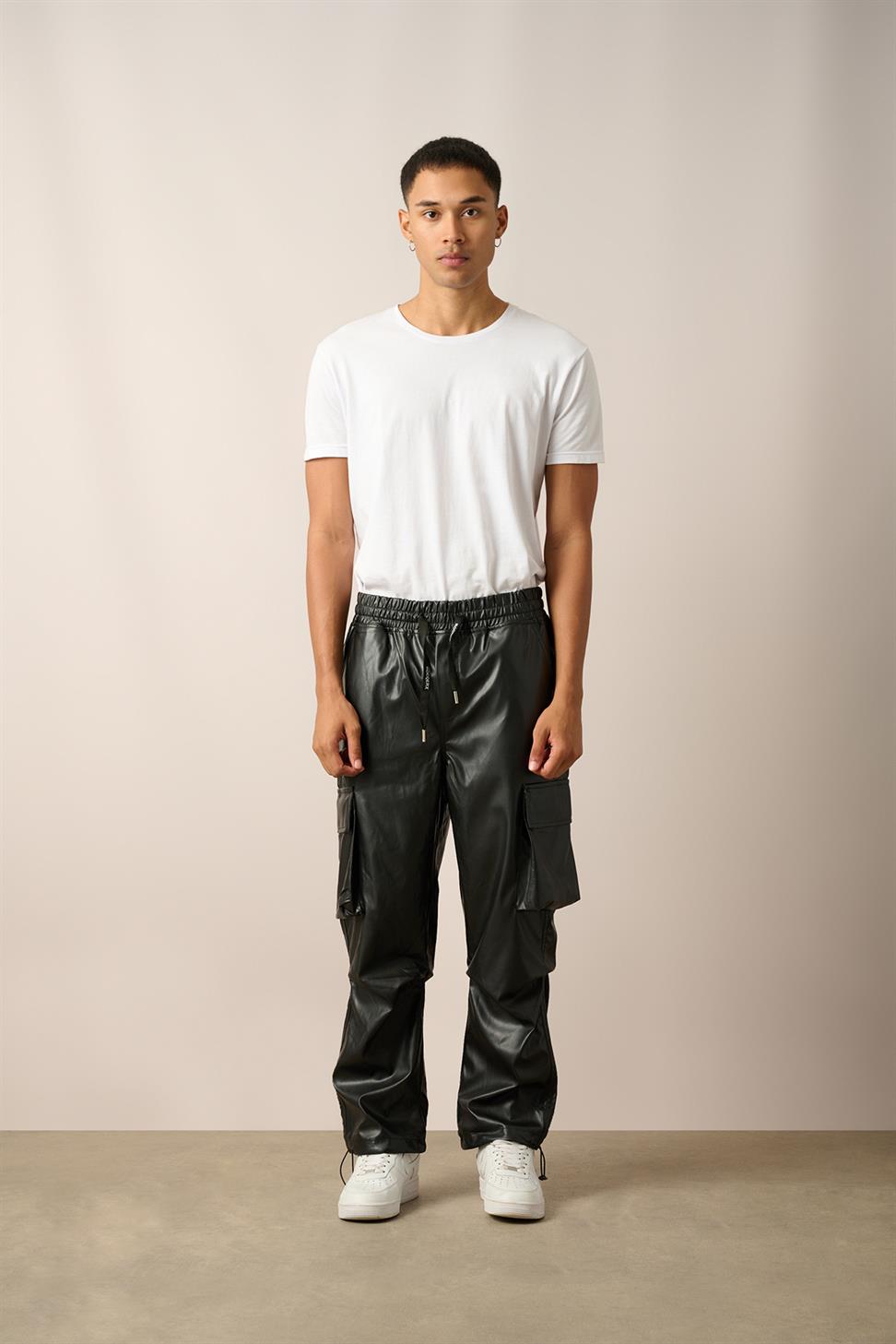 R-4348 Men’s Cargo Pocket Knee Detail Leather Pants – Black