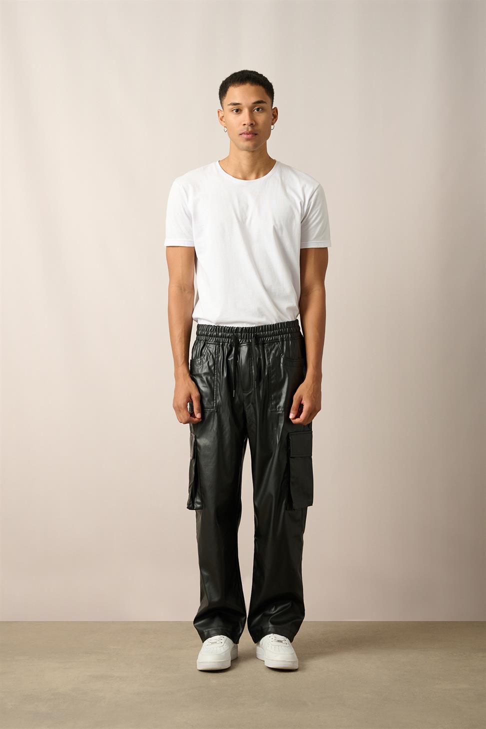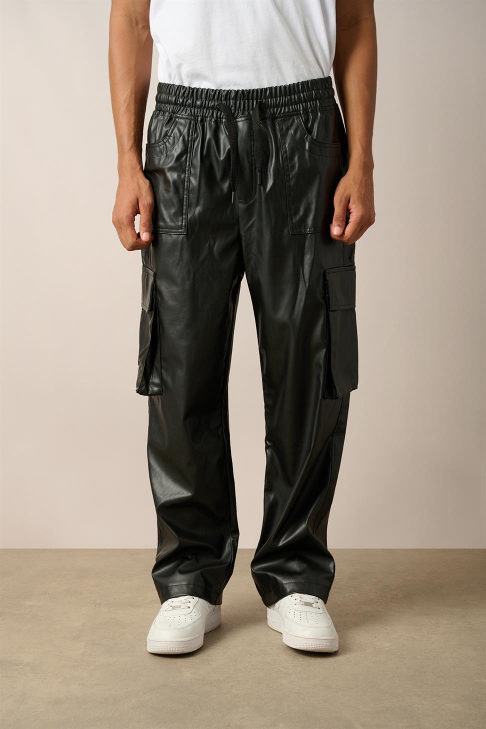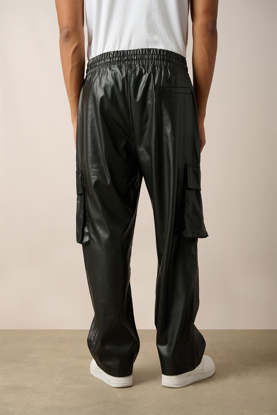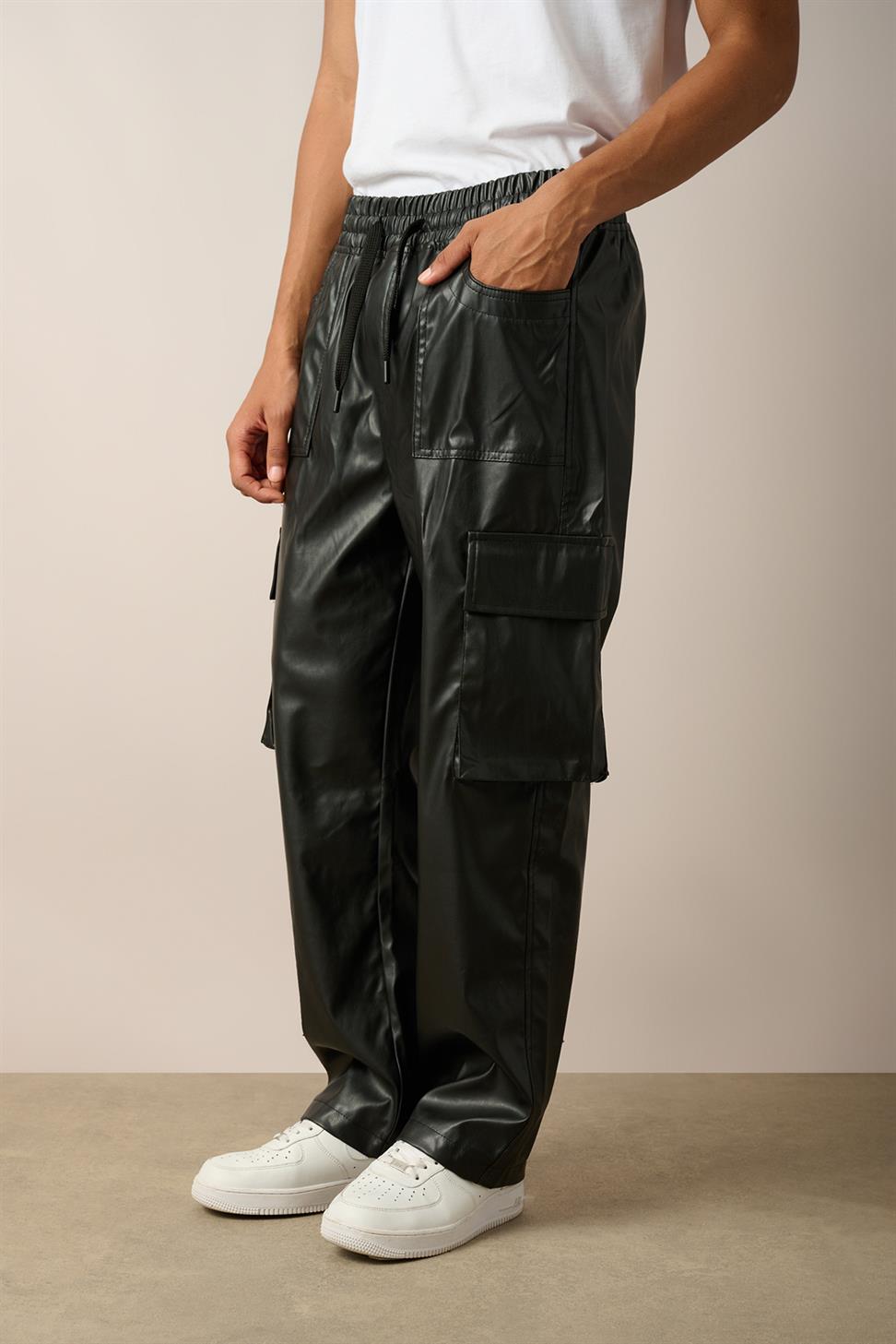 Çift Kargo Cep Bel Lastikli Deri Pantolon