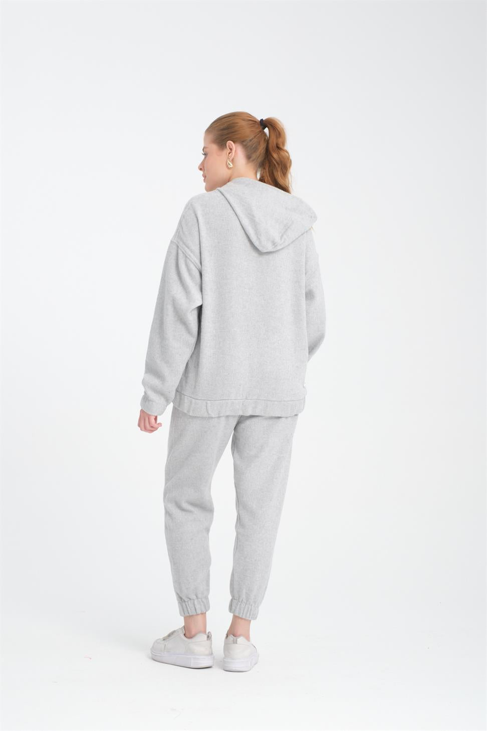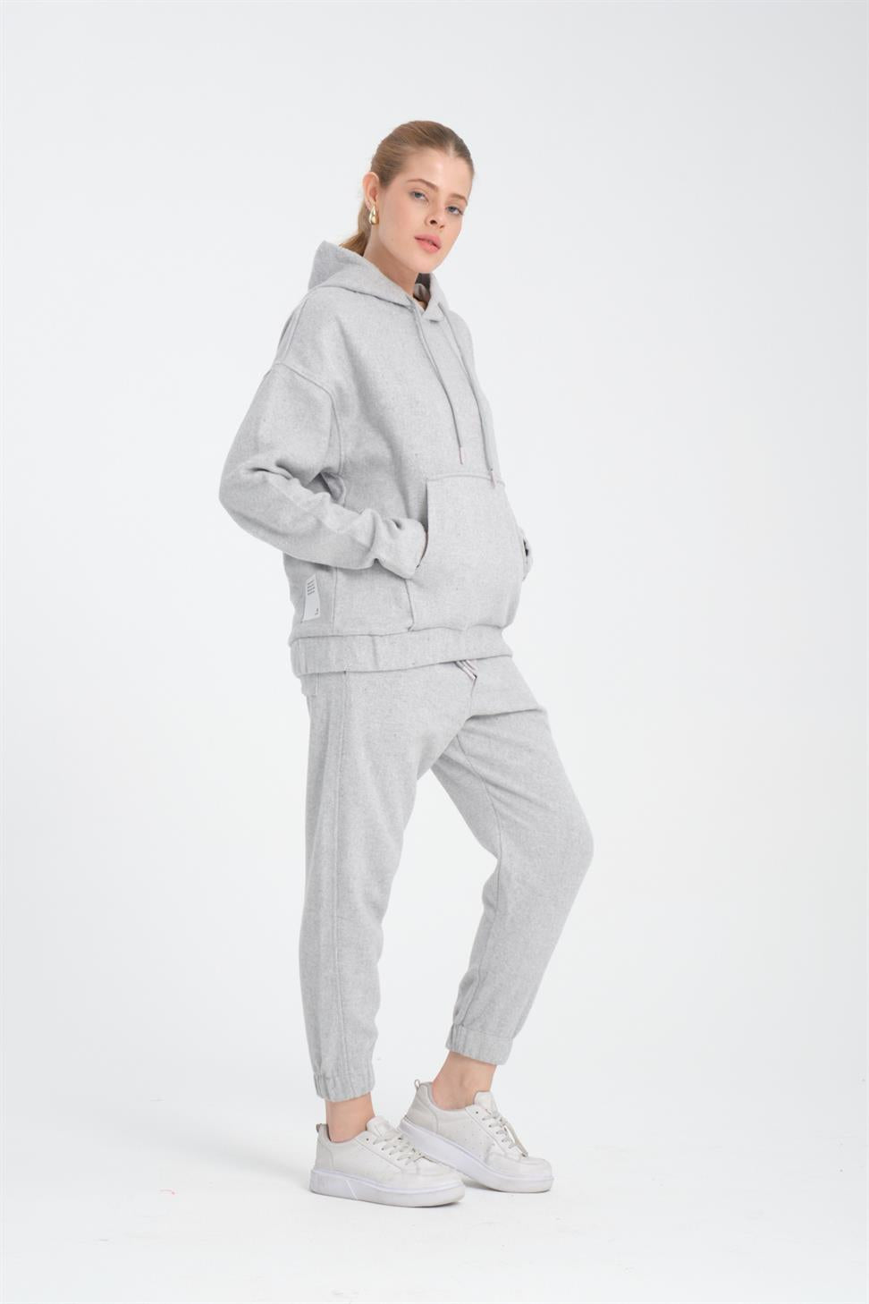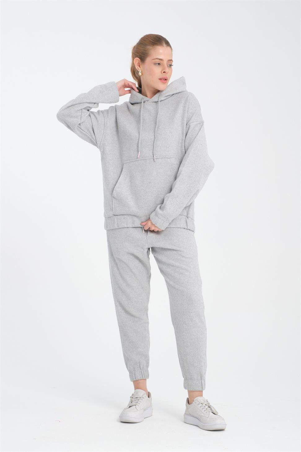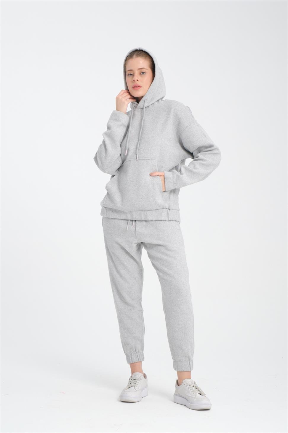 This modern two-piece fleece set in grey features a kangaroo pocket hoodie and elastic hem bottoms for a stylish yet comfortable look. Crafted from 35% cotton and 65% polyester, it offers breathability, durability, and softness — perfect for both casual wear and lounging.