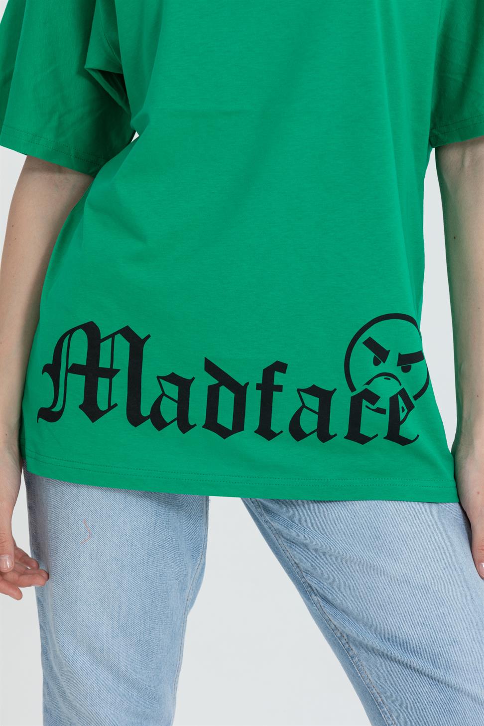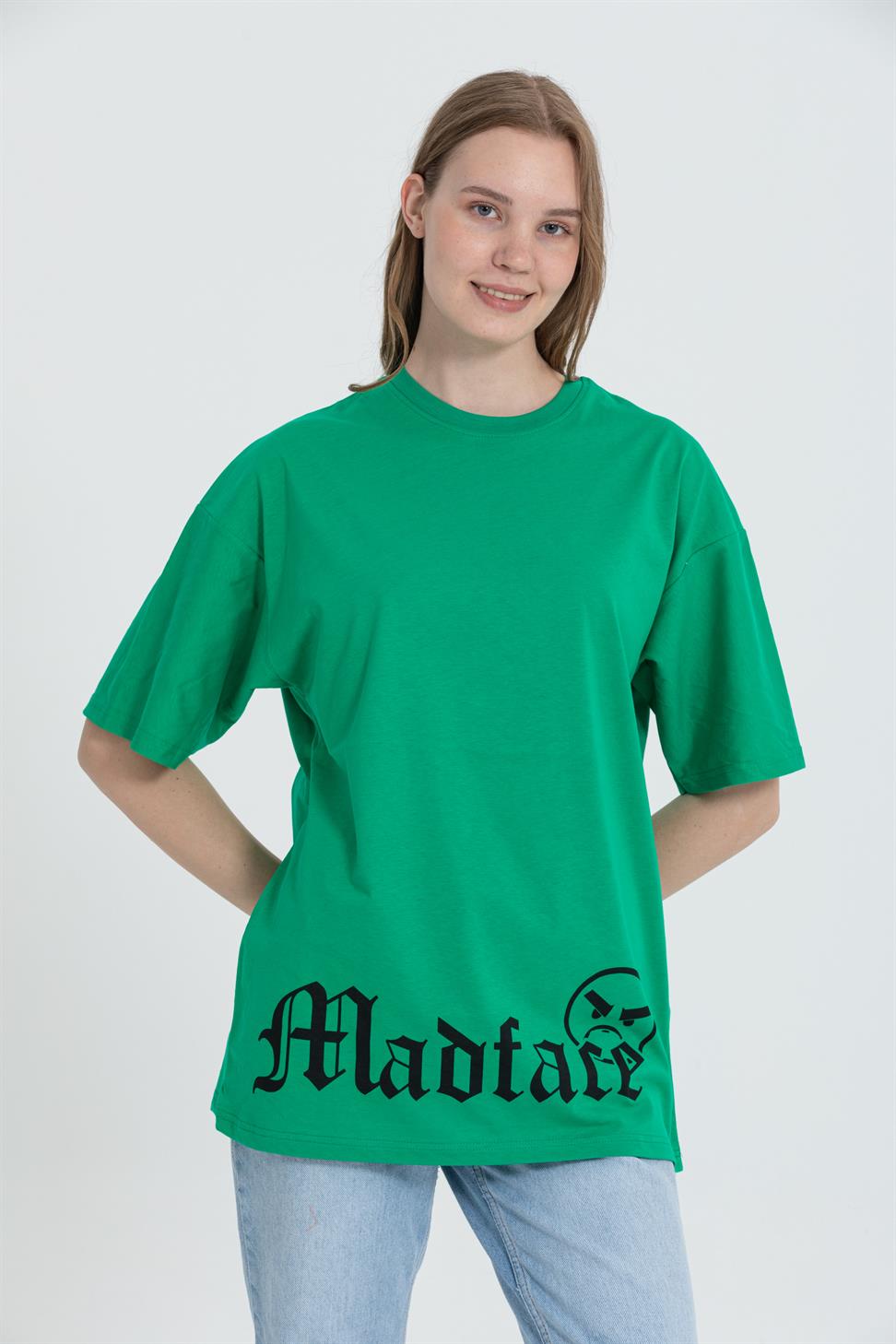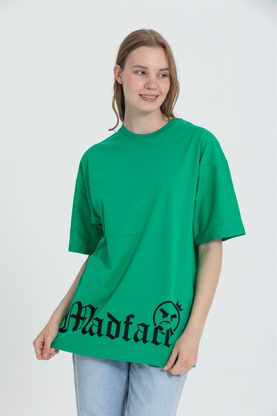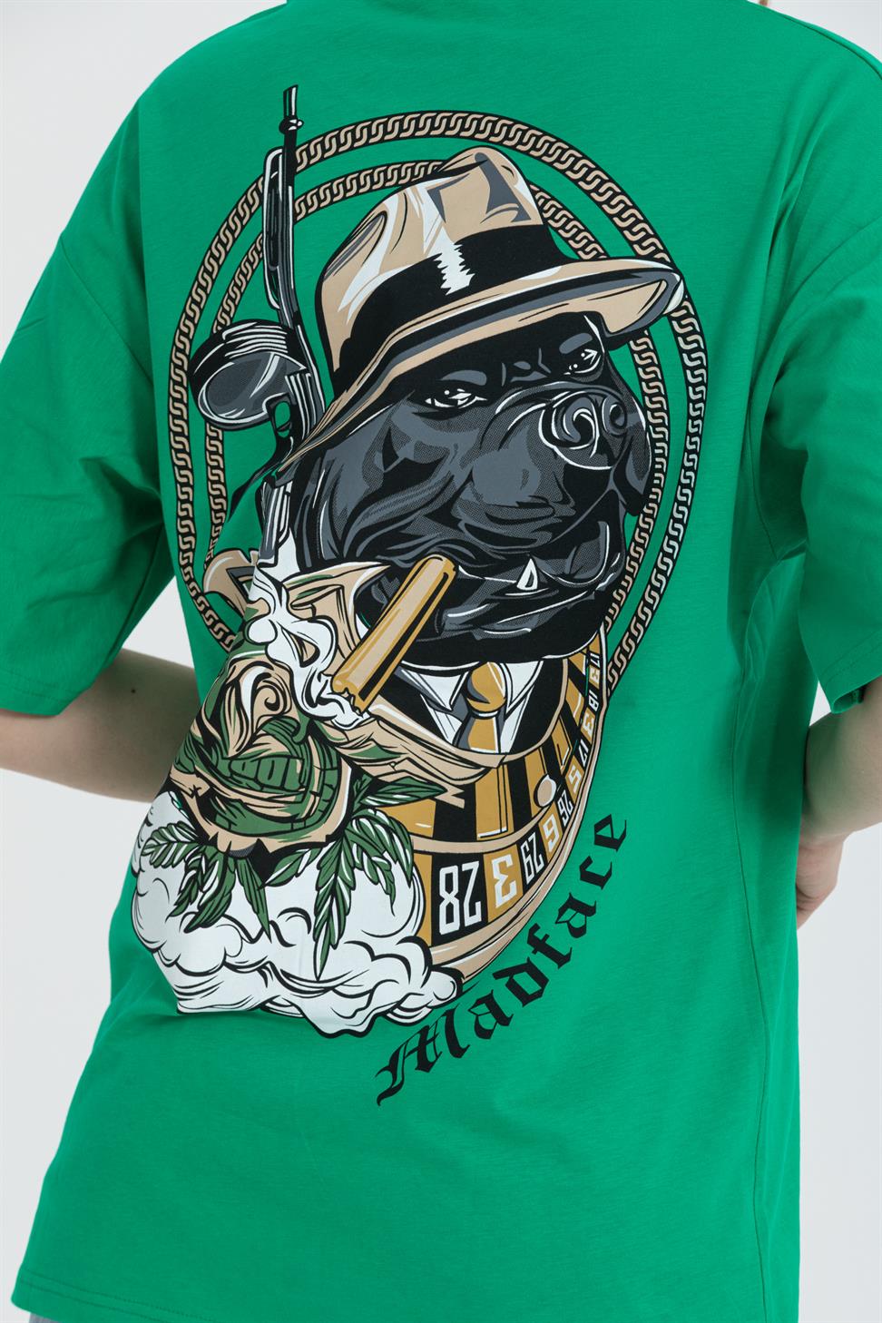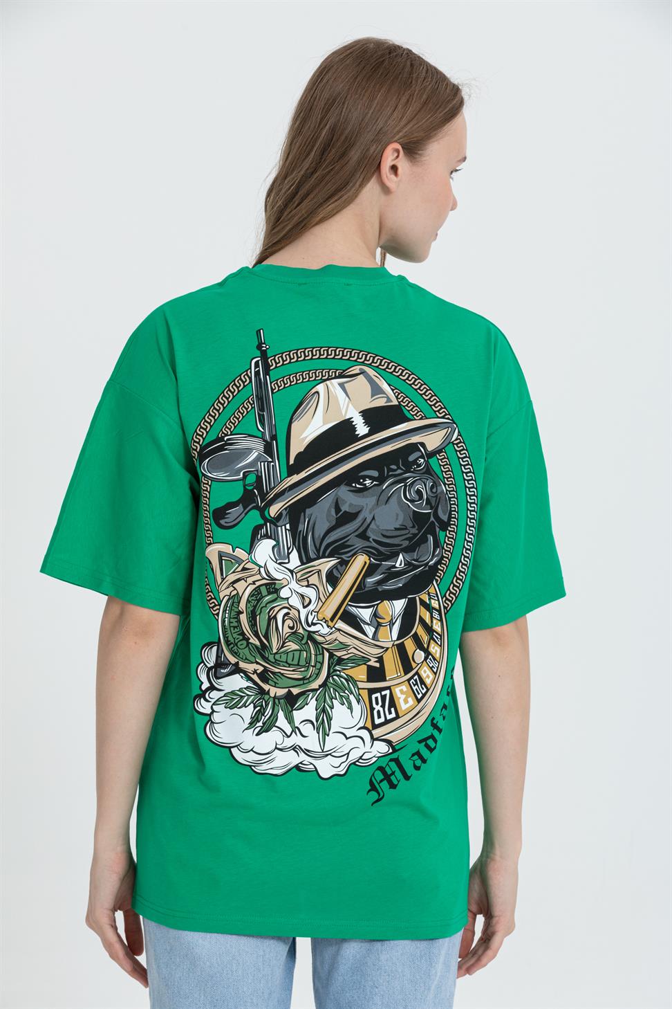 A relaxed, street-ready oversized tee in green with a playful dog graphic. Cut from soft, breathable 100% cotton single-jersey with a clean crew neck and dropped shoulders for an easy drape.
