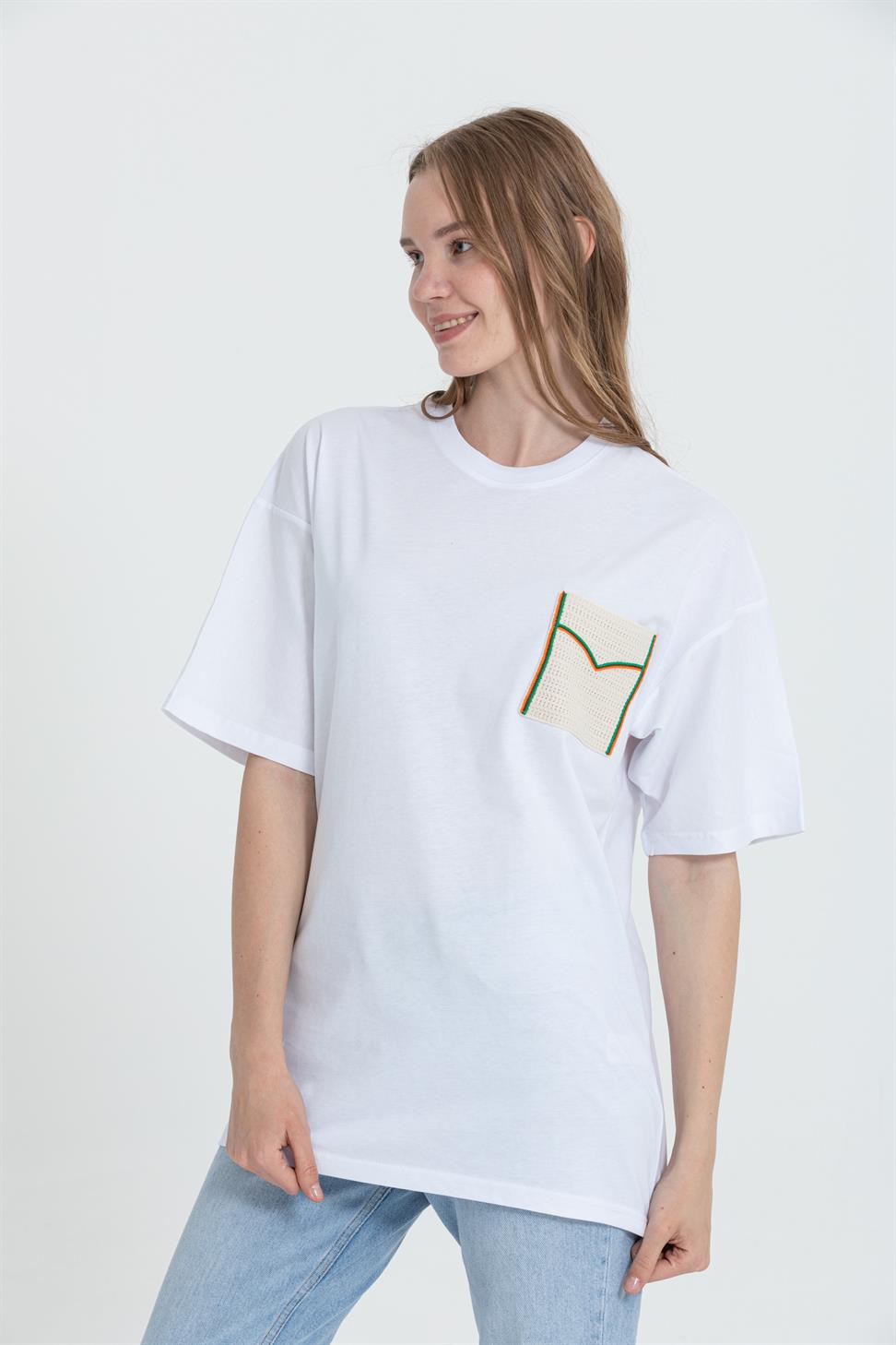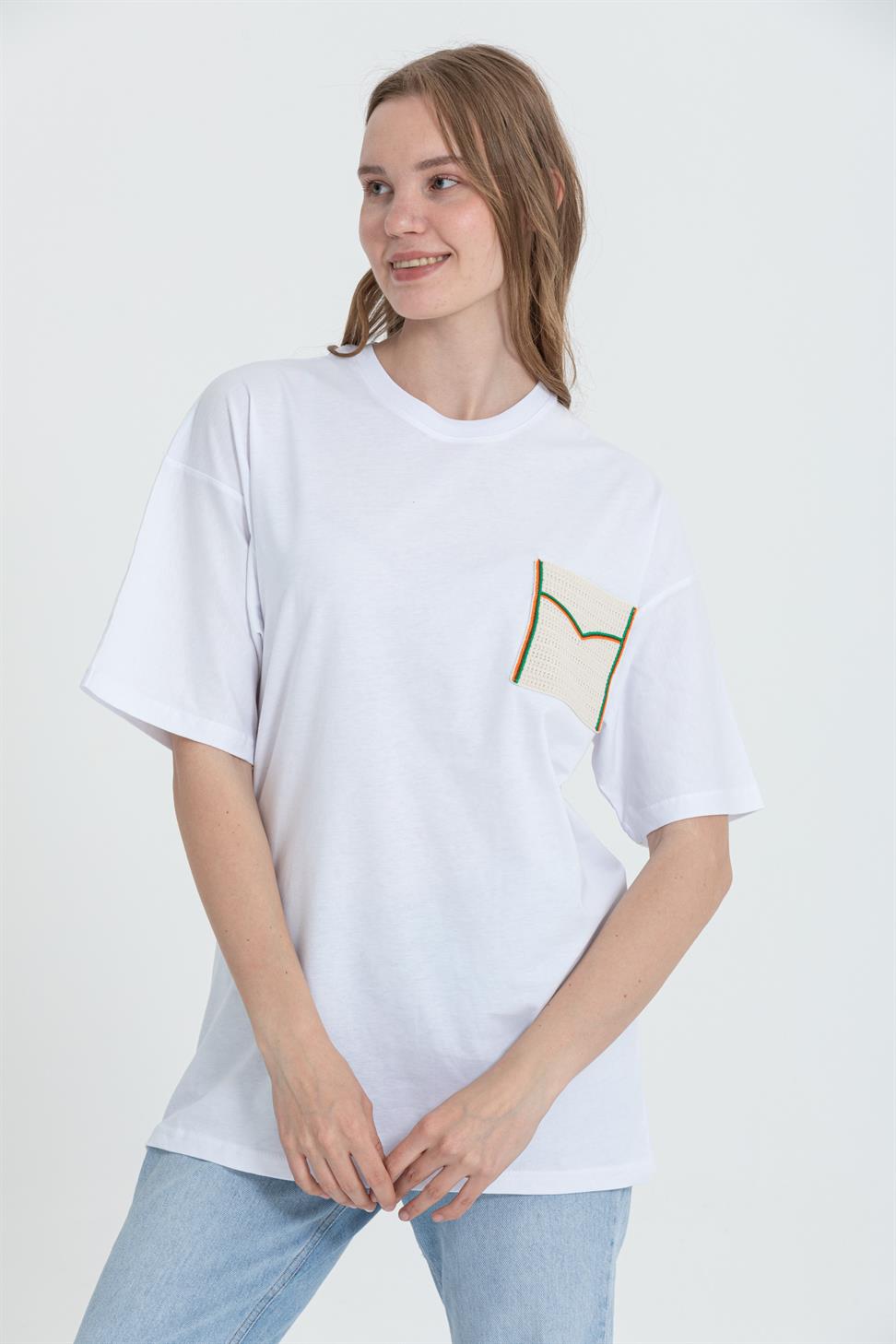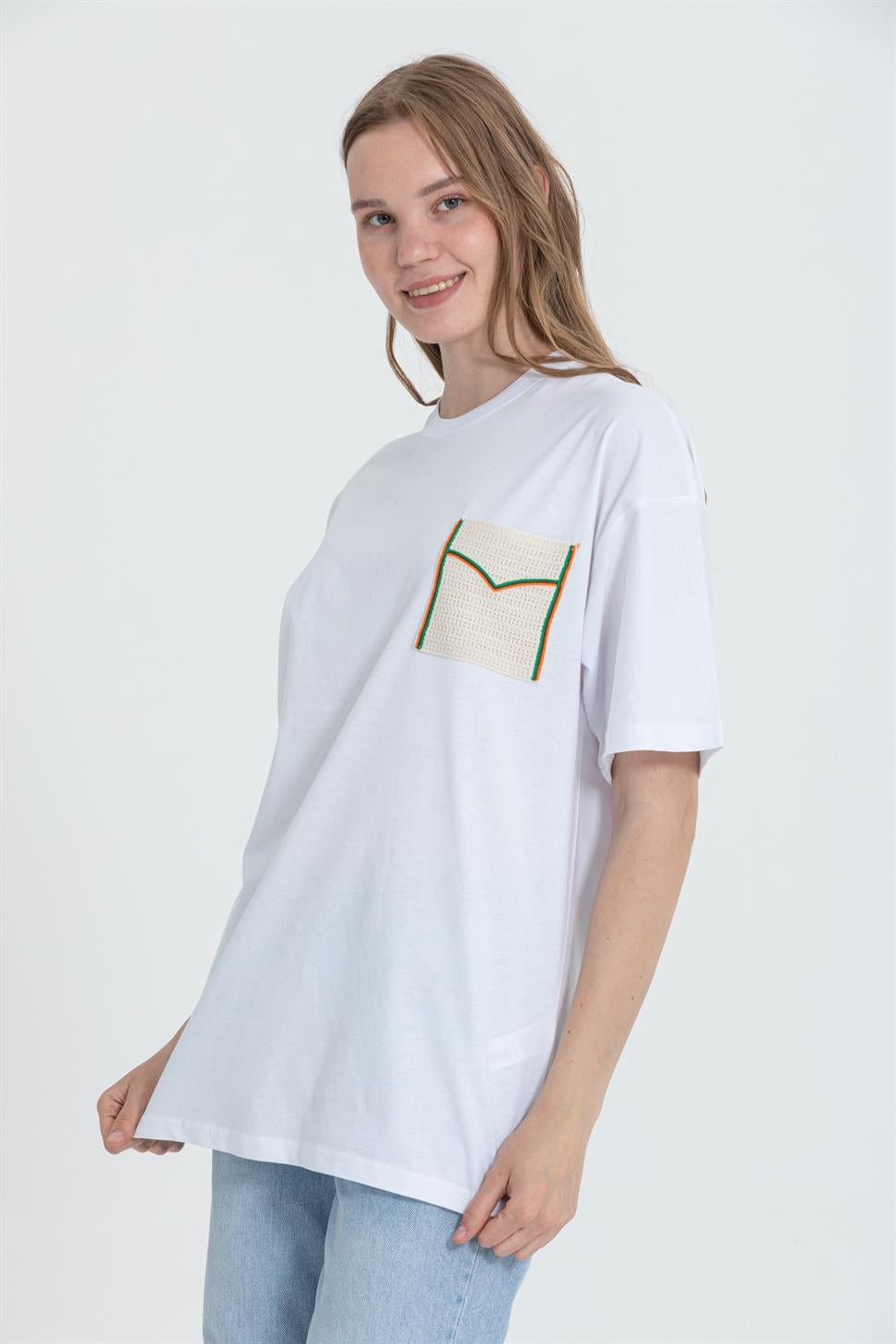 R-5729 Oversized Crew Neck T-Shirt Lace Pocket Detail, 100% Cotton