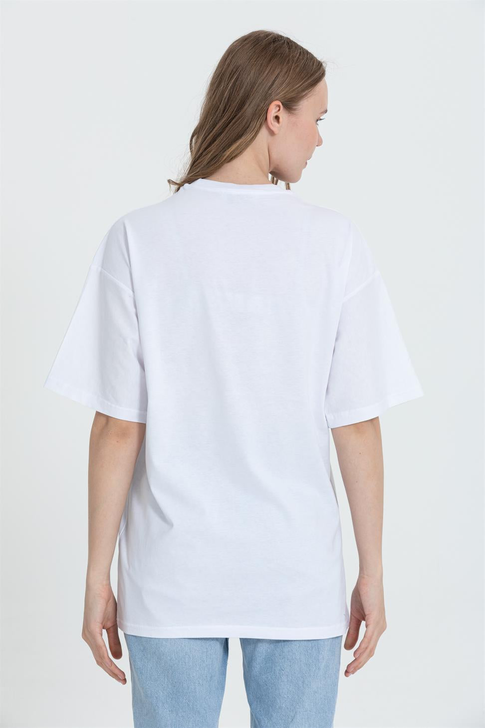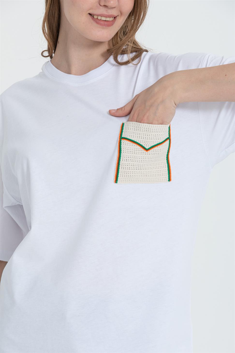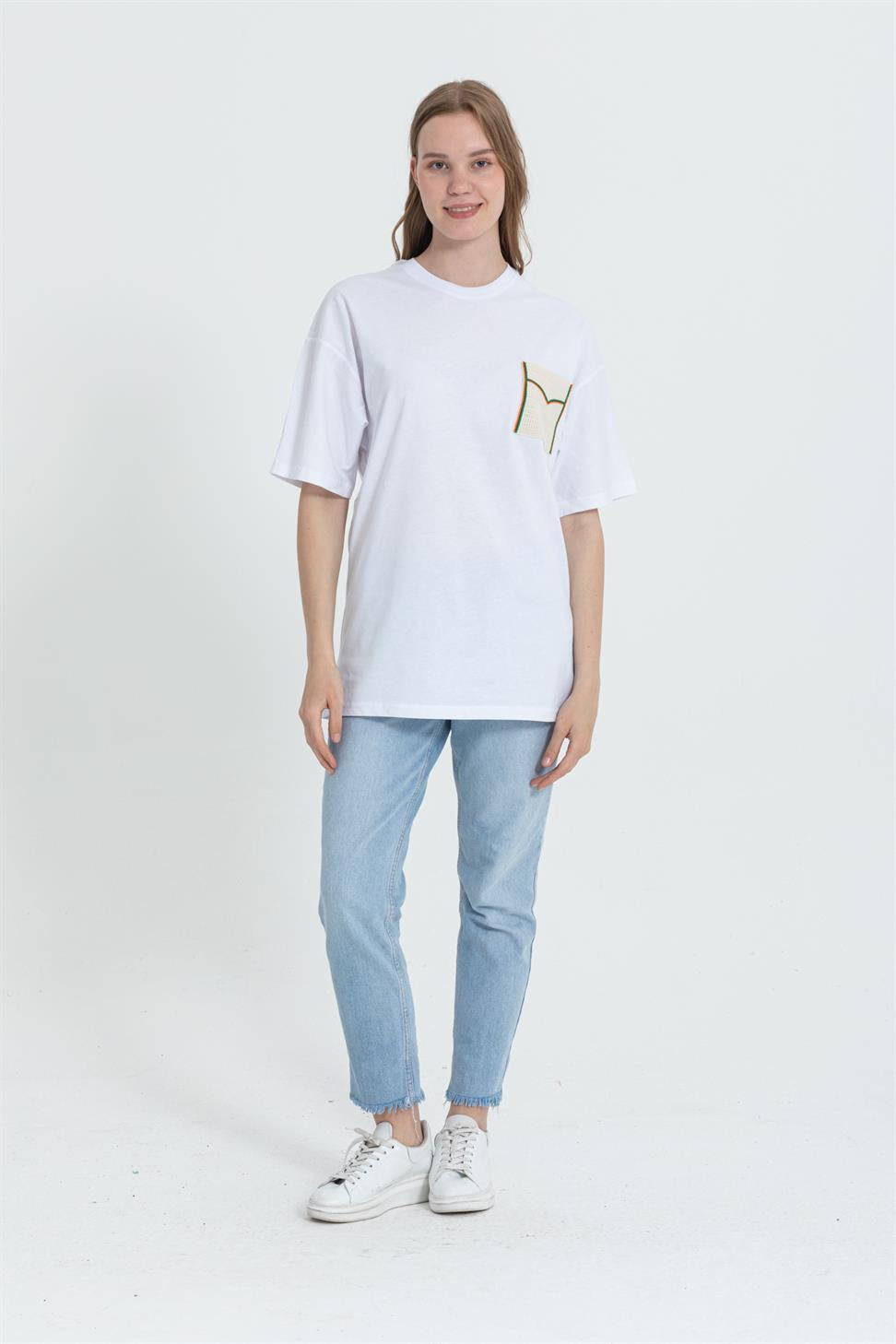 R-5729 Oversized Crew Neck T-Shirt Lace Pocket Detail, 100% Cotton
