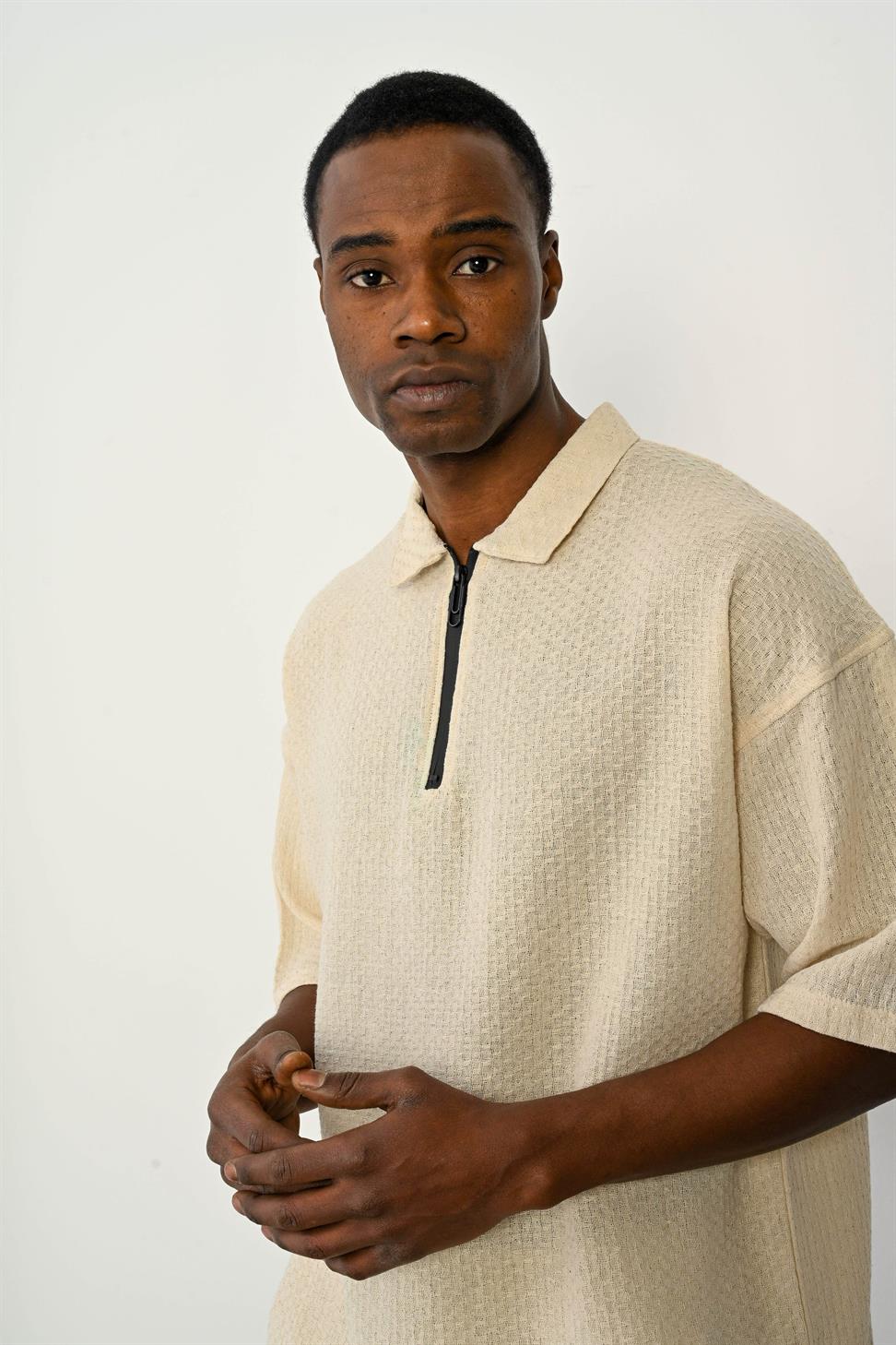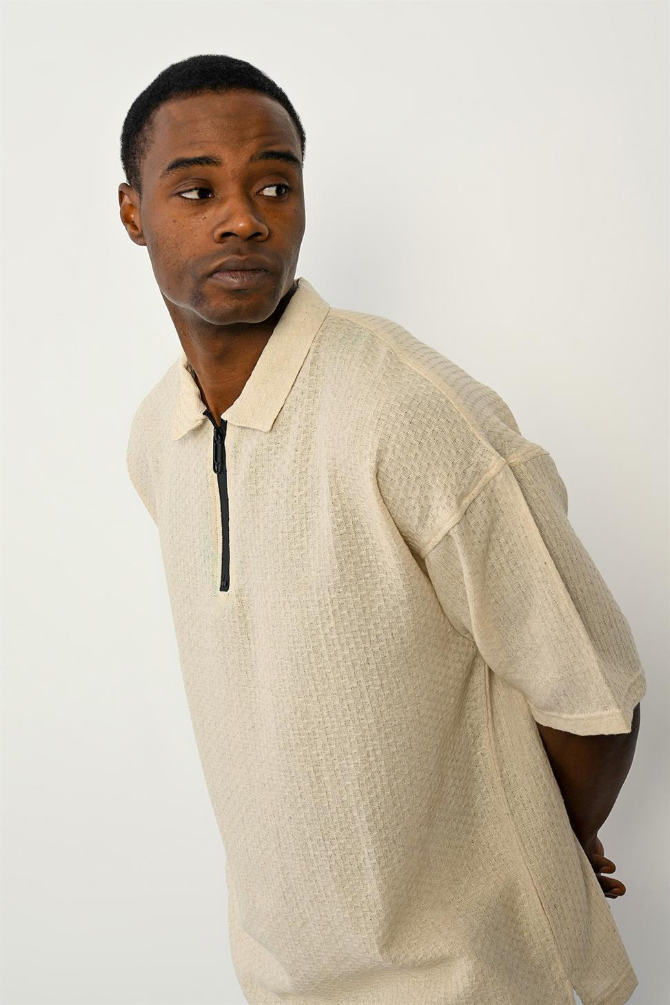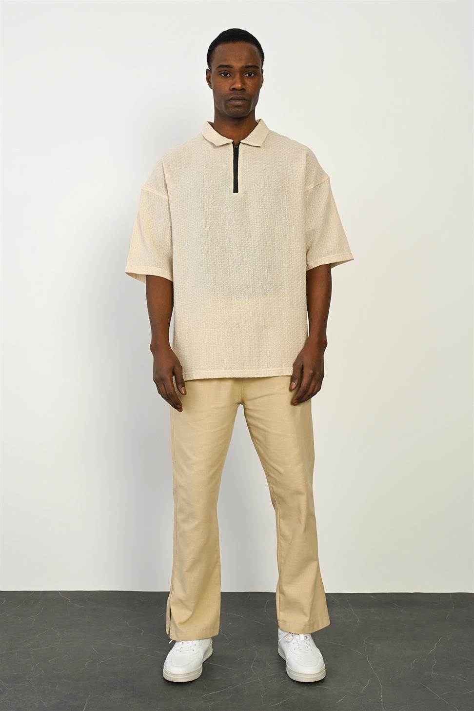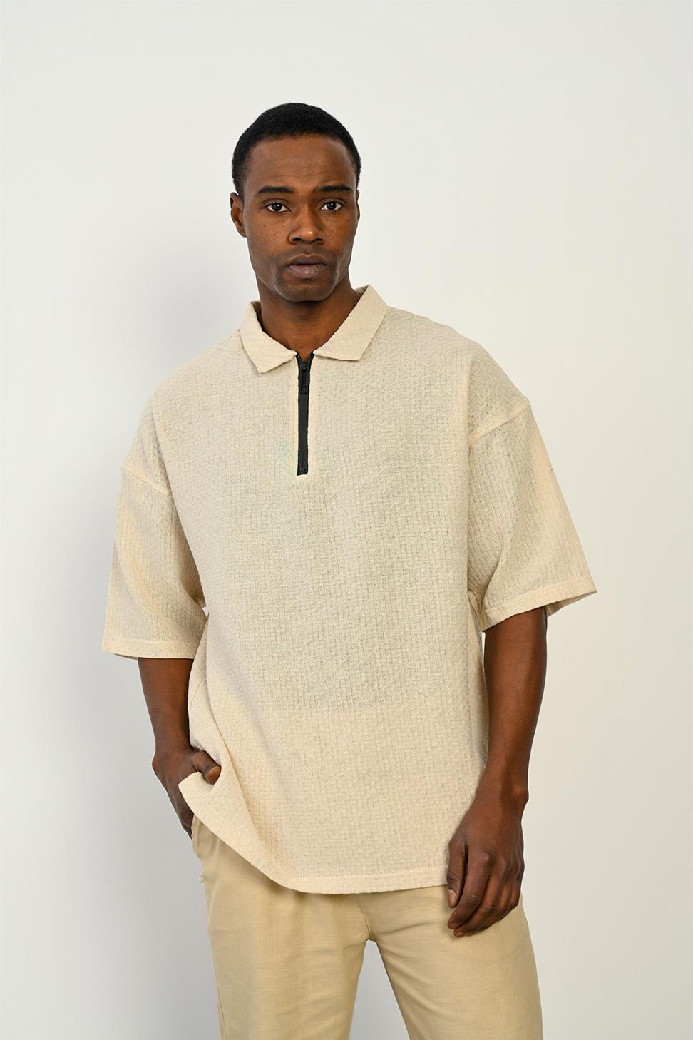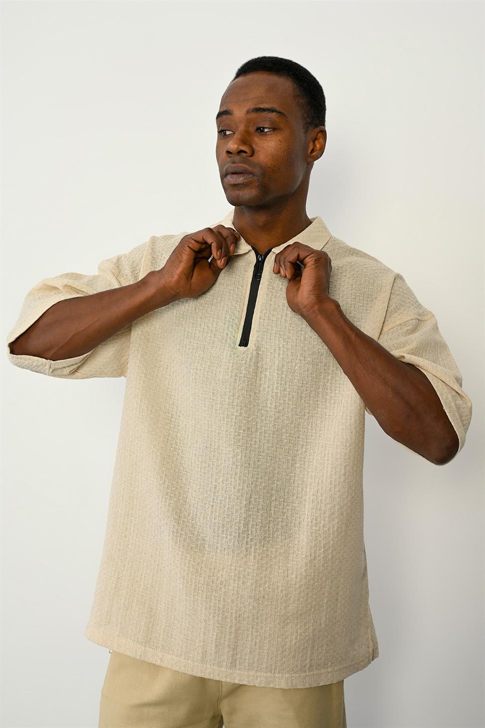 The Zipper Collar Short Sleeve T-Shirt in Stone stands out with its modern and versatile design. The zipper detail on the collar adds a sporty and stylish touch, making it perfect for both casual and smart-casual outfits.