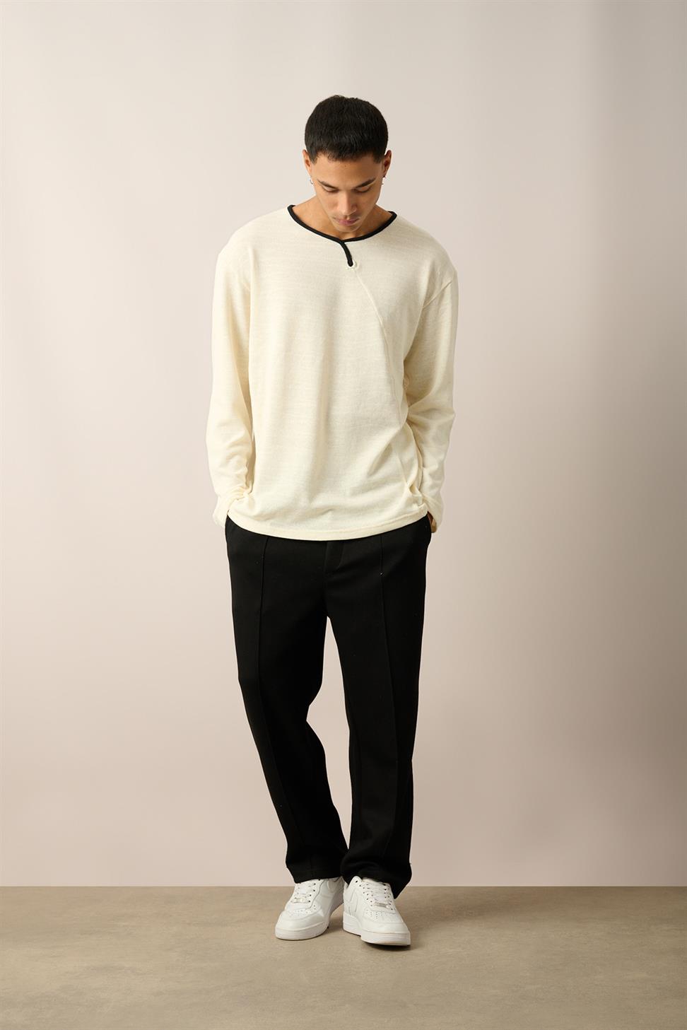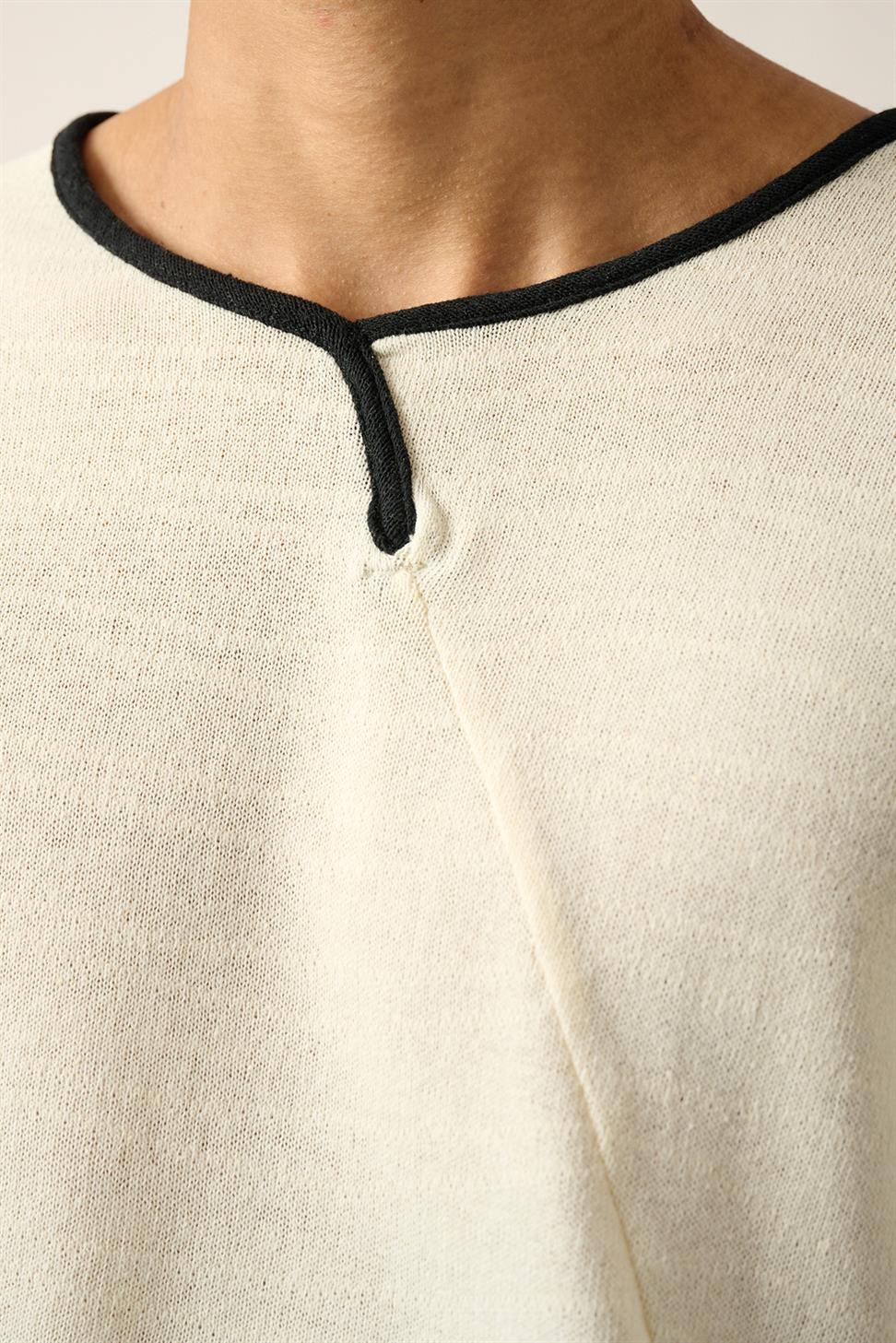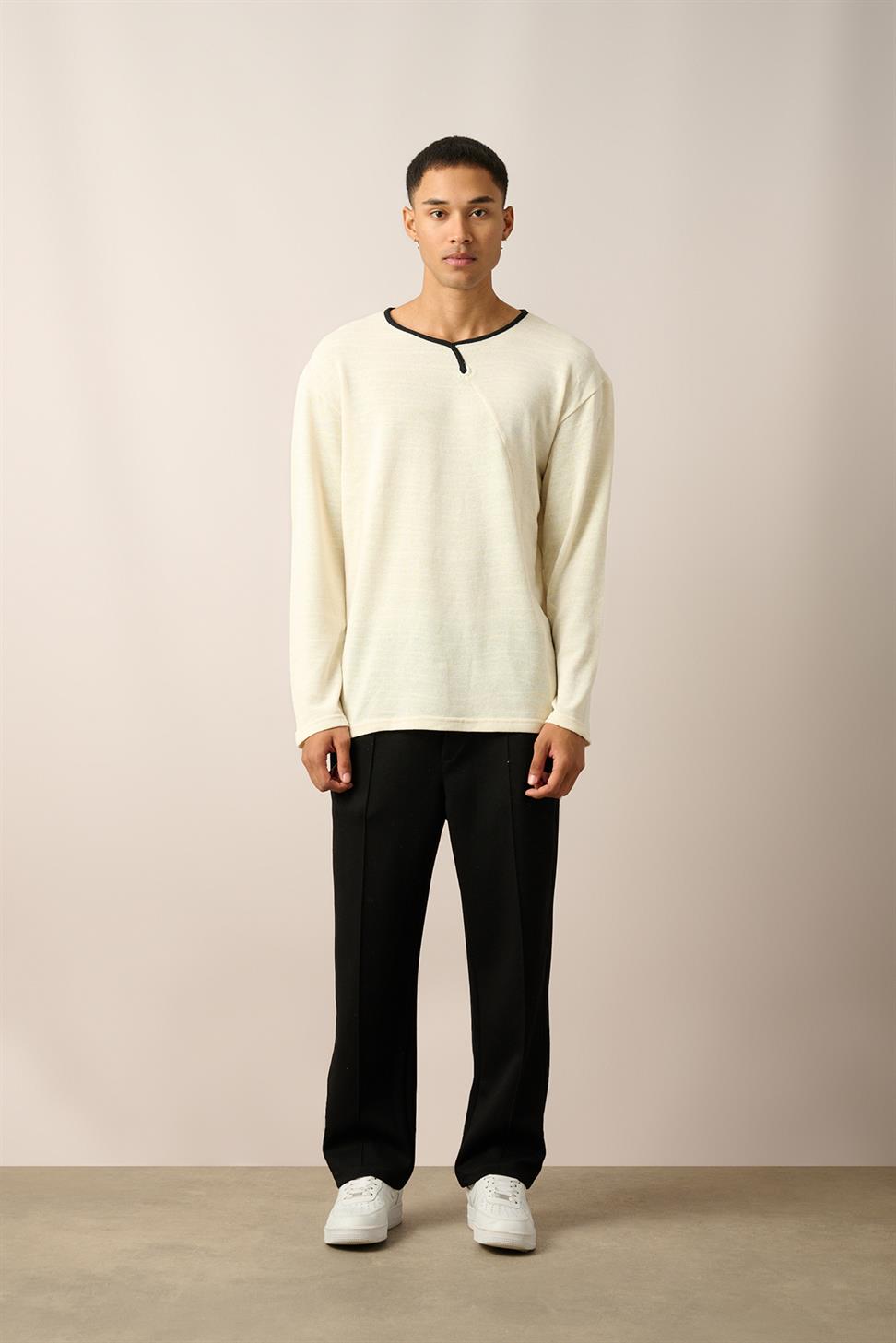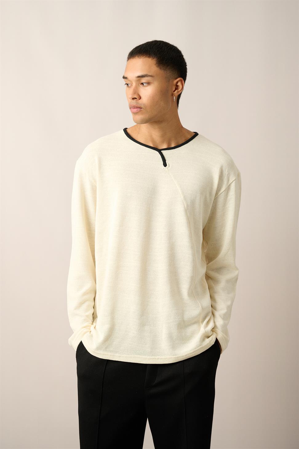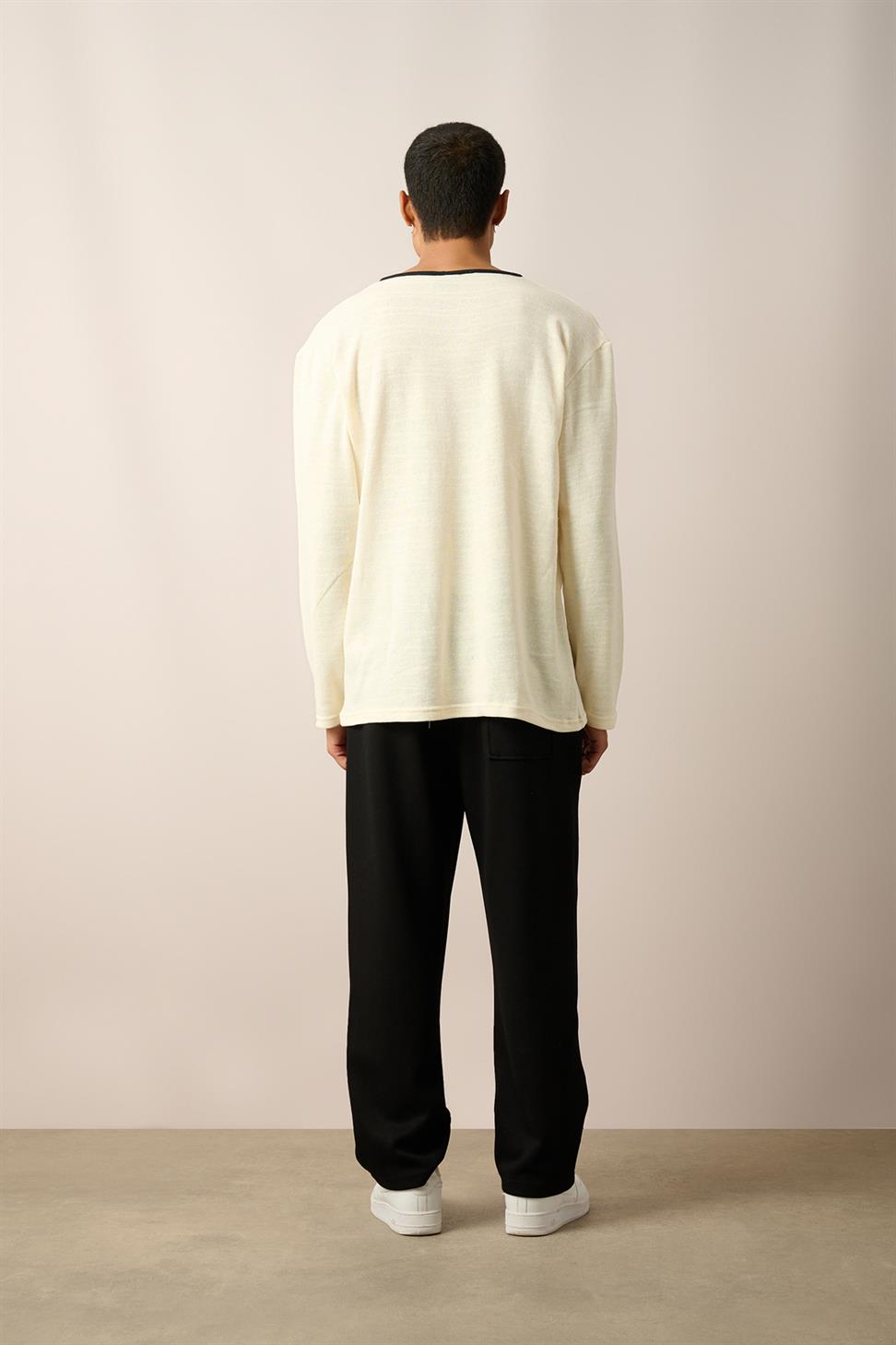 R-5798 Ecru Crew Neck Jacquard Sweatshirt with Piping Detail