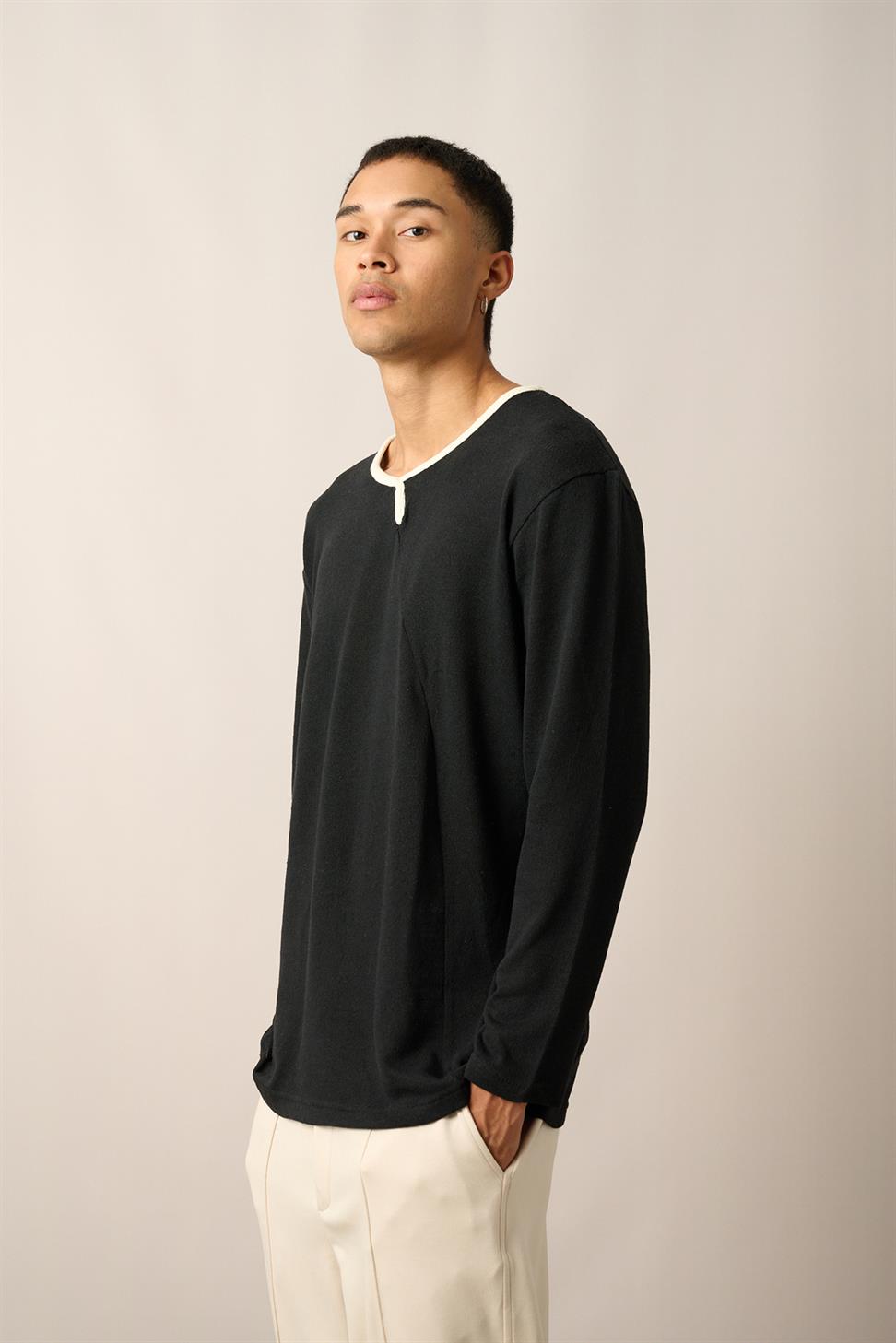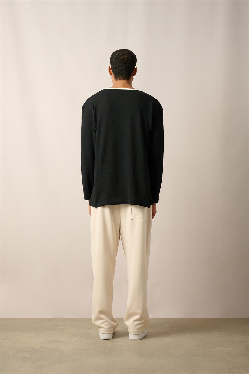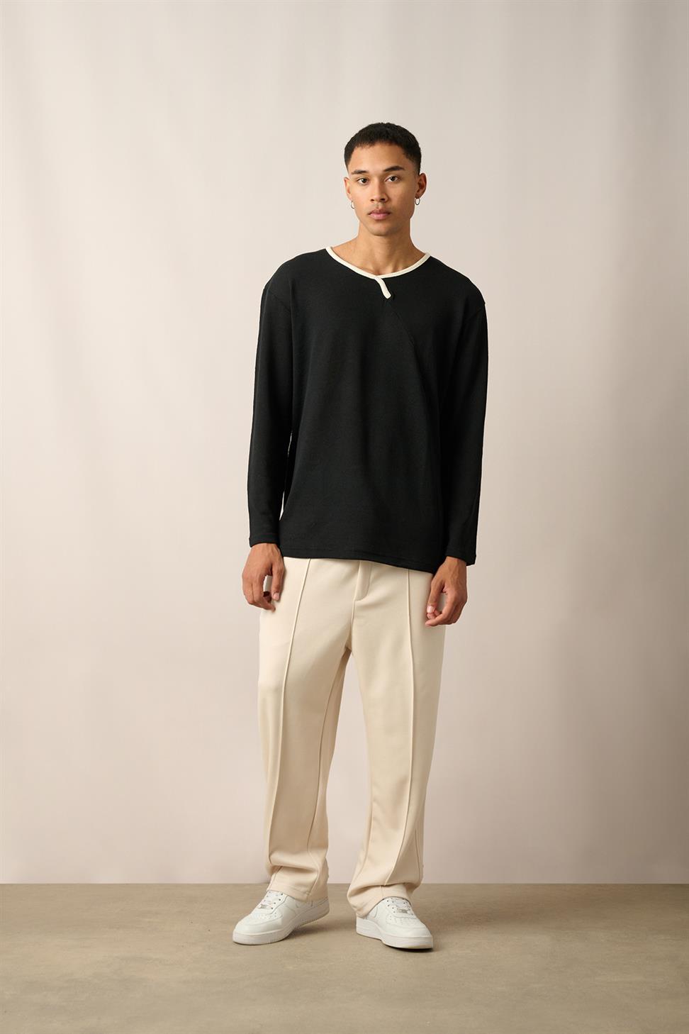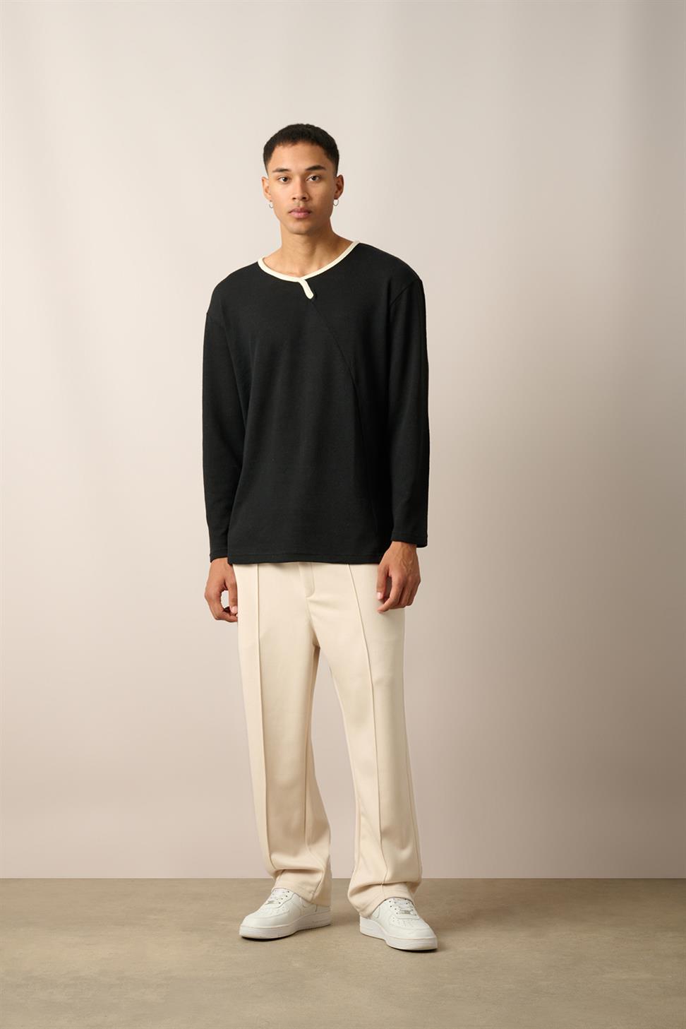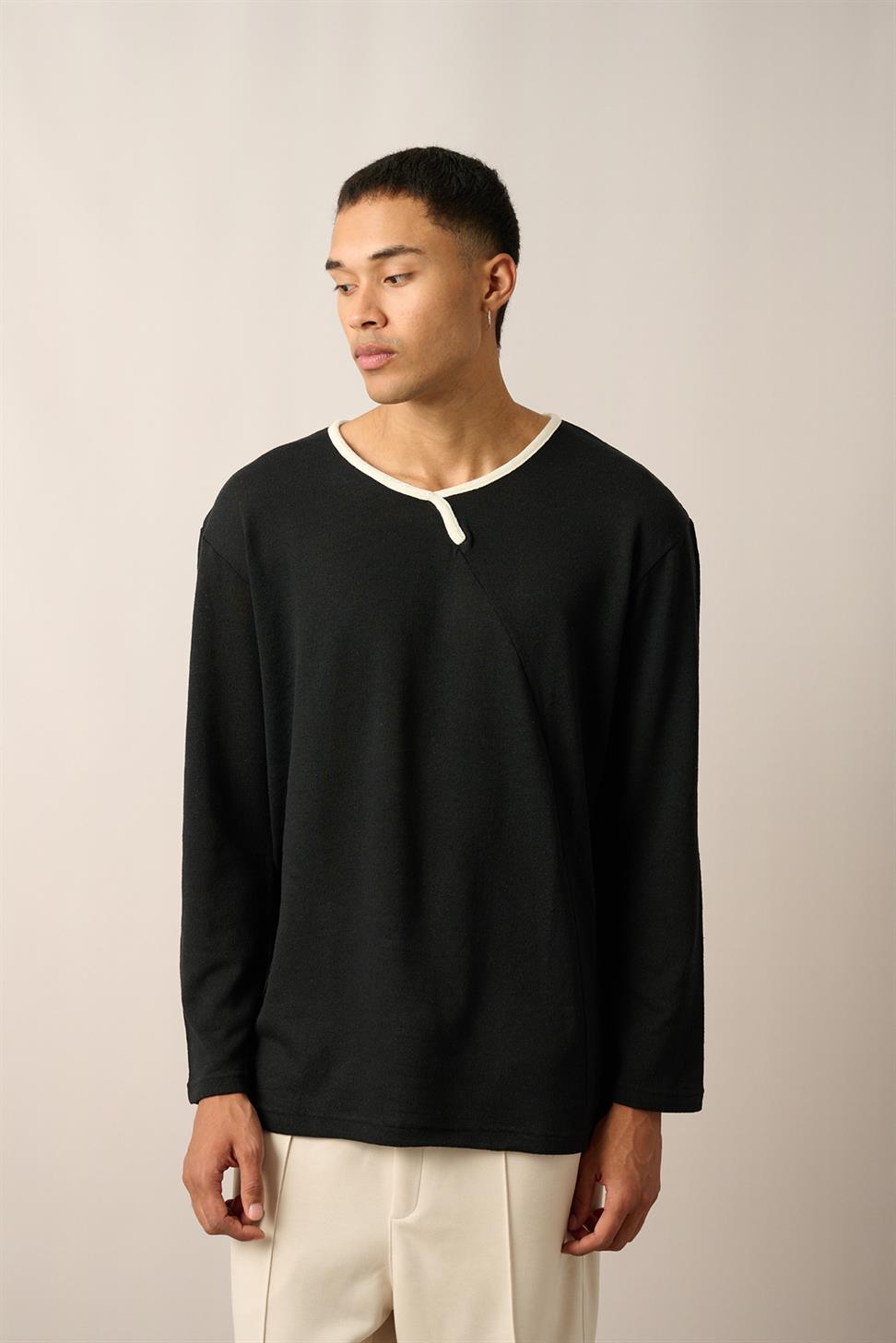 R-5798 Black Crew Neck Jacquard Sweatshirt with Piping Detail