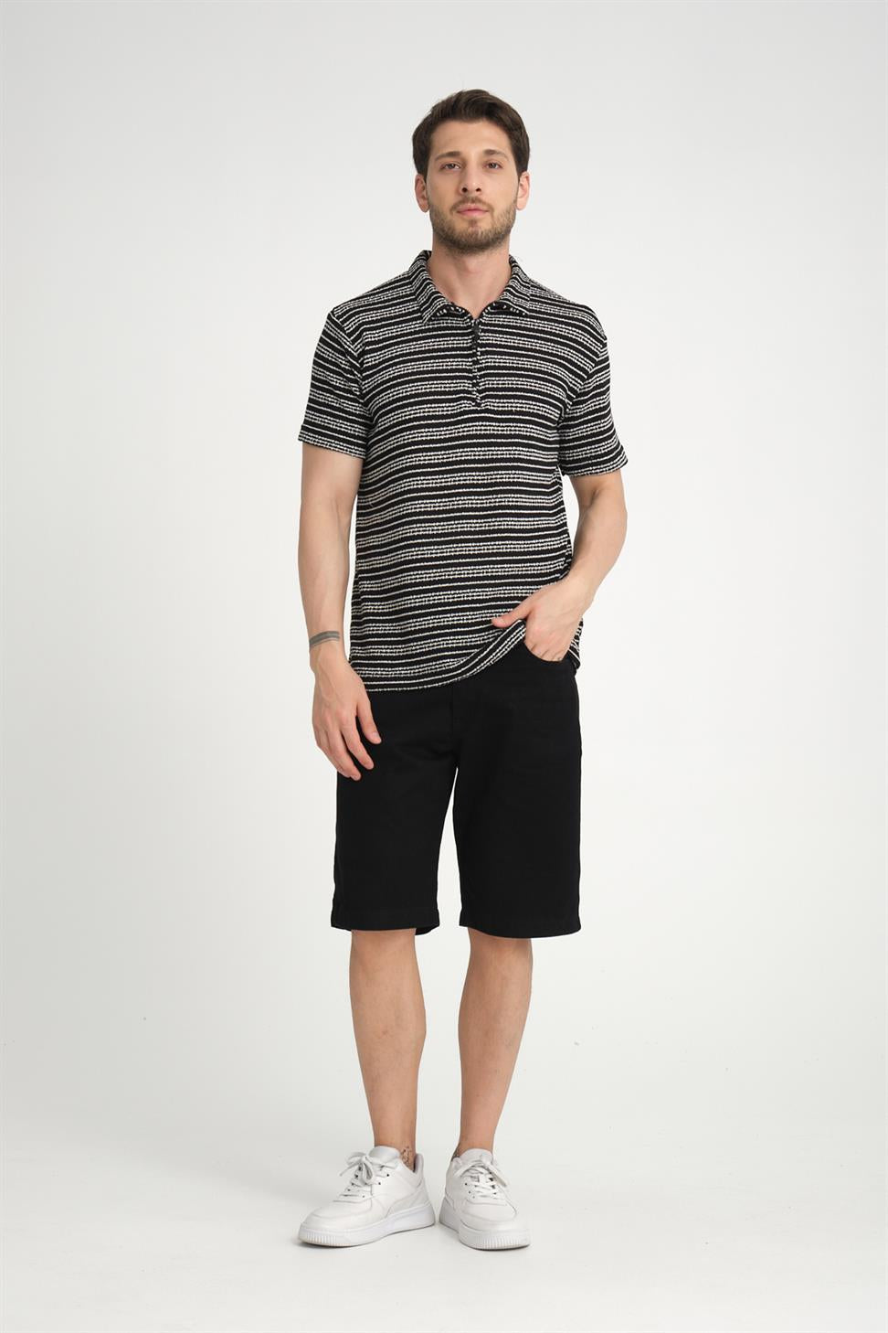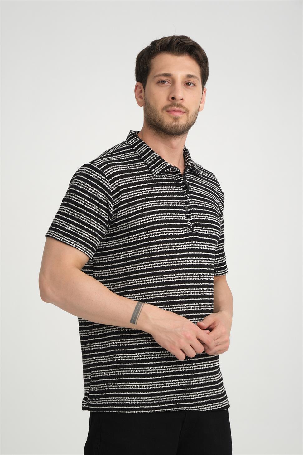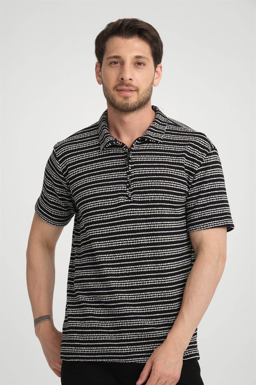 The Half-Zip Collar Striped Knit T-Shirt in Black is designed with a modern and versatile look, combining comfort with style. Made from a durable 60% polyester and 40% cotton blend, this knit fabric provides both softness and resilience, ensuring long-lasting wear.