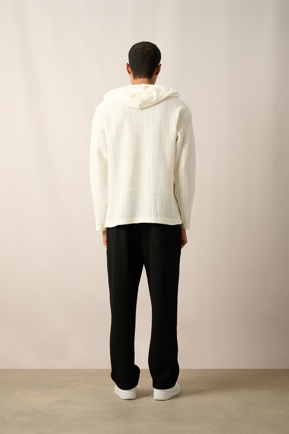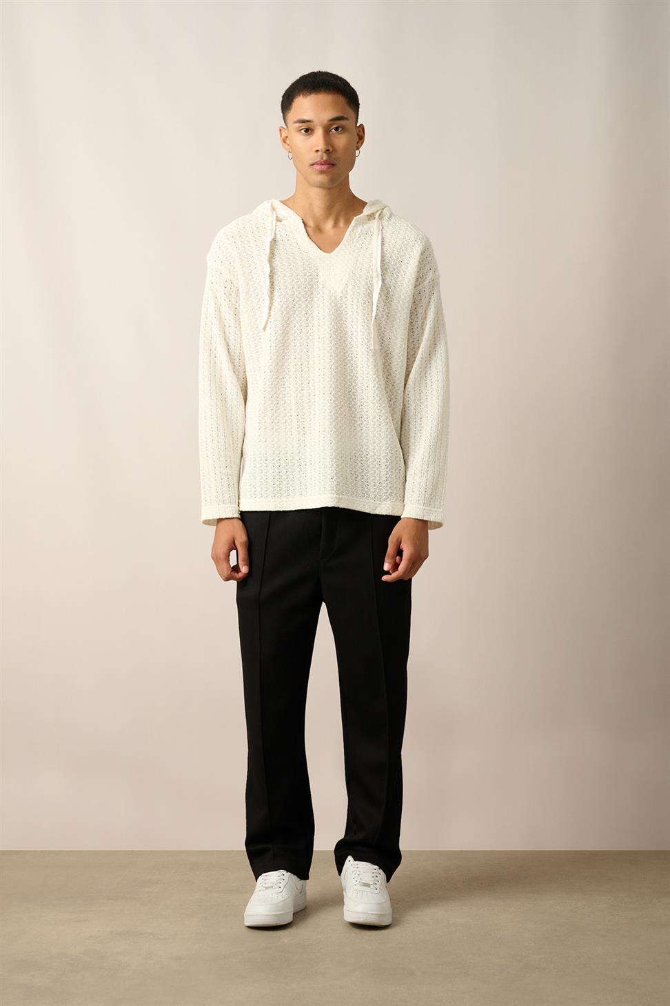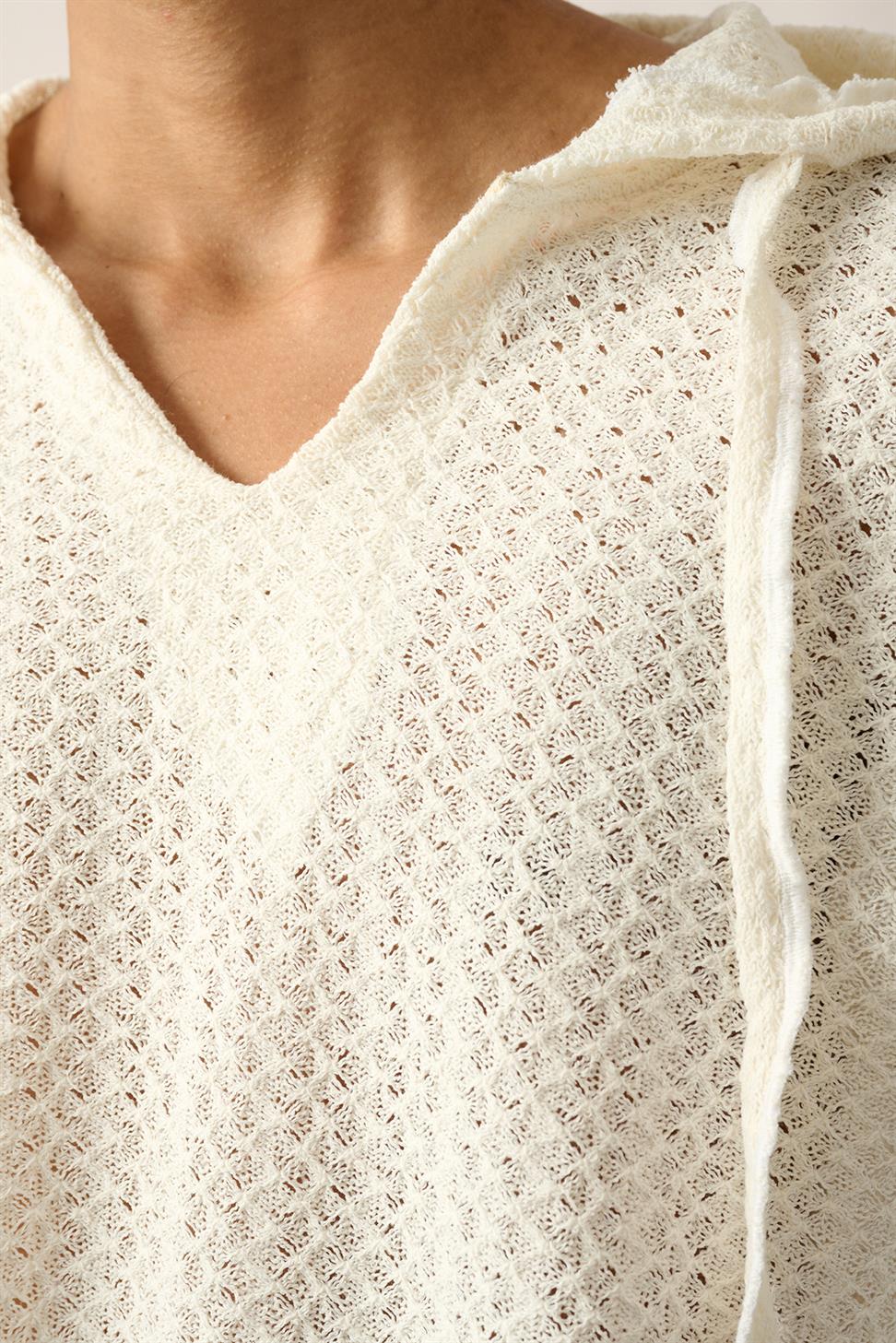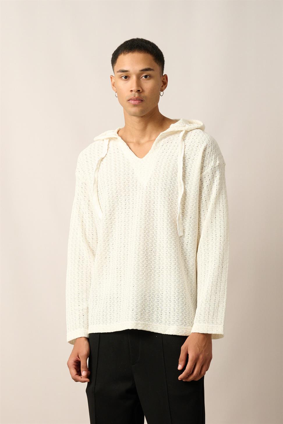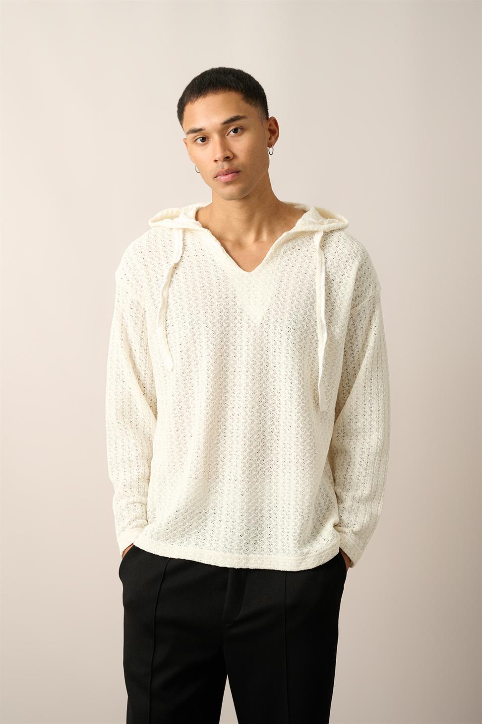 R-5840 Hooded Henley Neck Long Sleeve Spider Pattern Knit Sweatshirt – Ecru
