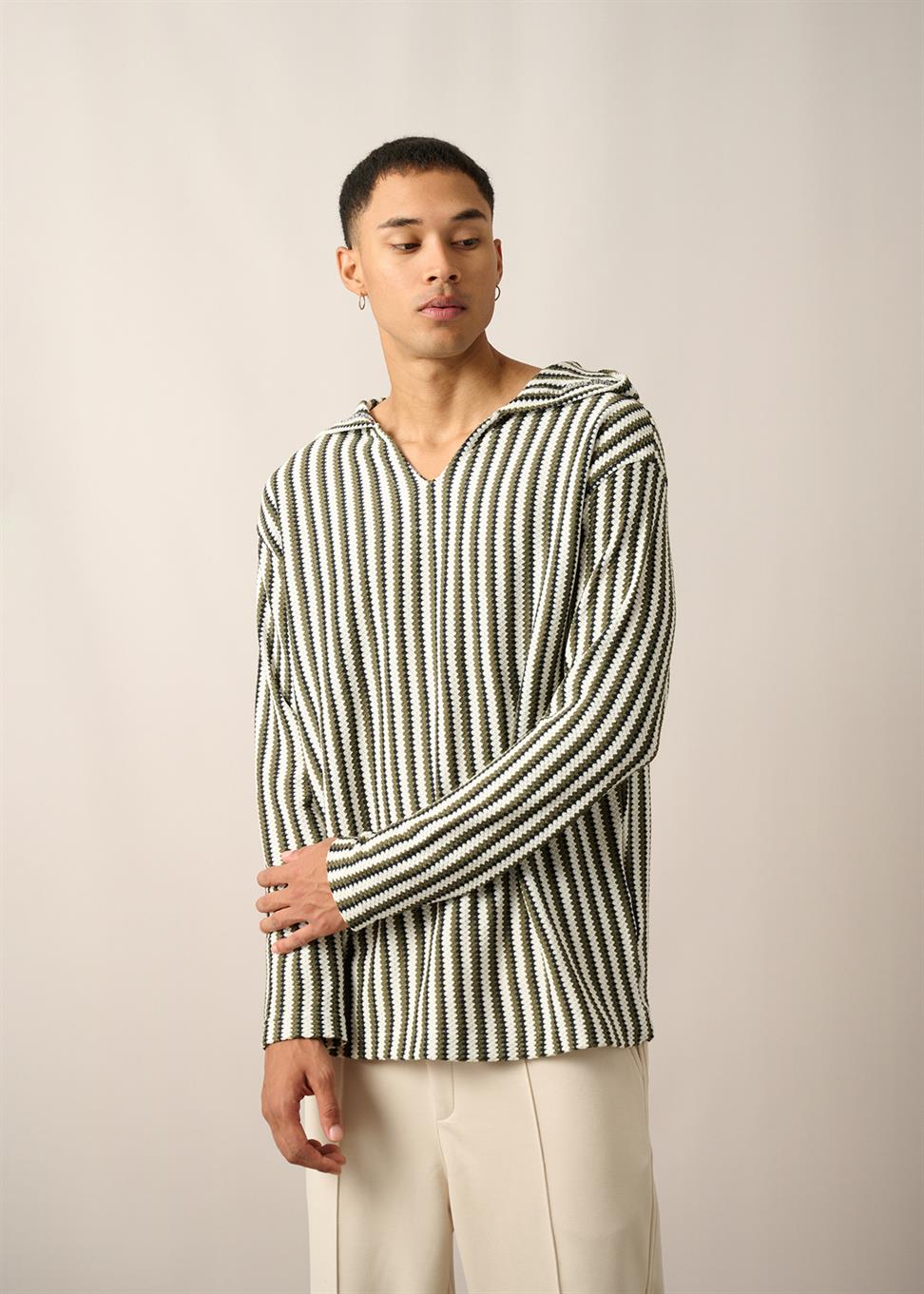 Hooded Striped Knit Sweatshirt with Kangaroo Pocket