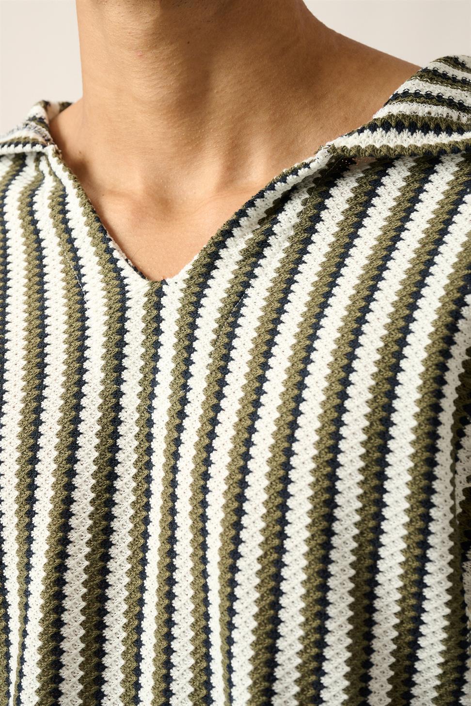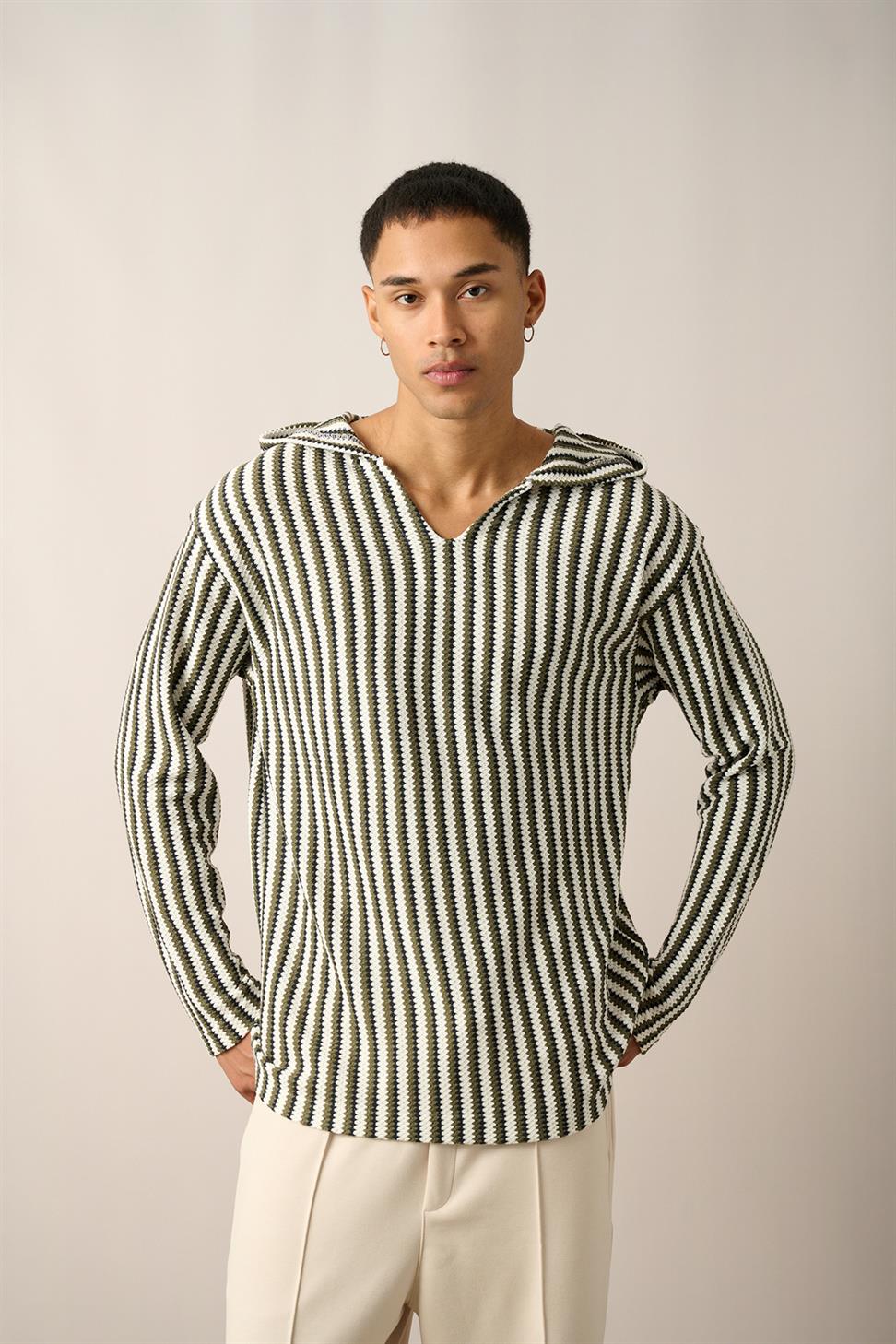 R-5842 Hooded Striped Knit Sweatshirt with Kangaroo Pocket