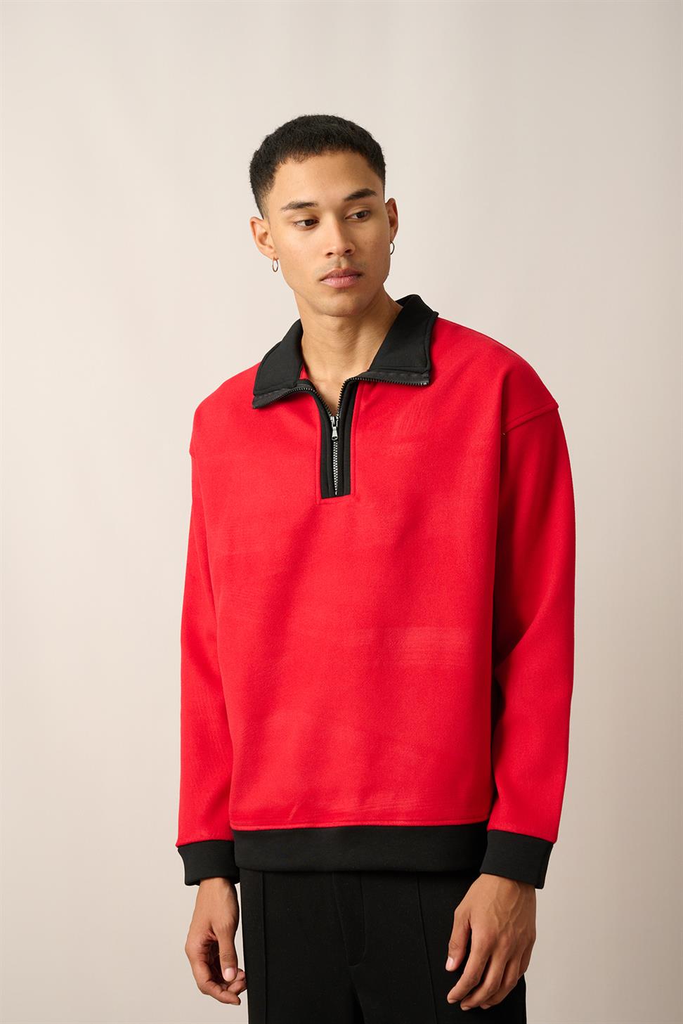 Stand out in style with this half-zip sweatshirt featuring bold contrast details, designed in an eye-catching red shade. Crafted from 65% polyester, 32% viscose, and 3% lycra fleece fabric, it offers warmth, flexibility, and lasting comfort for everyday wear.