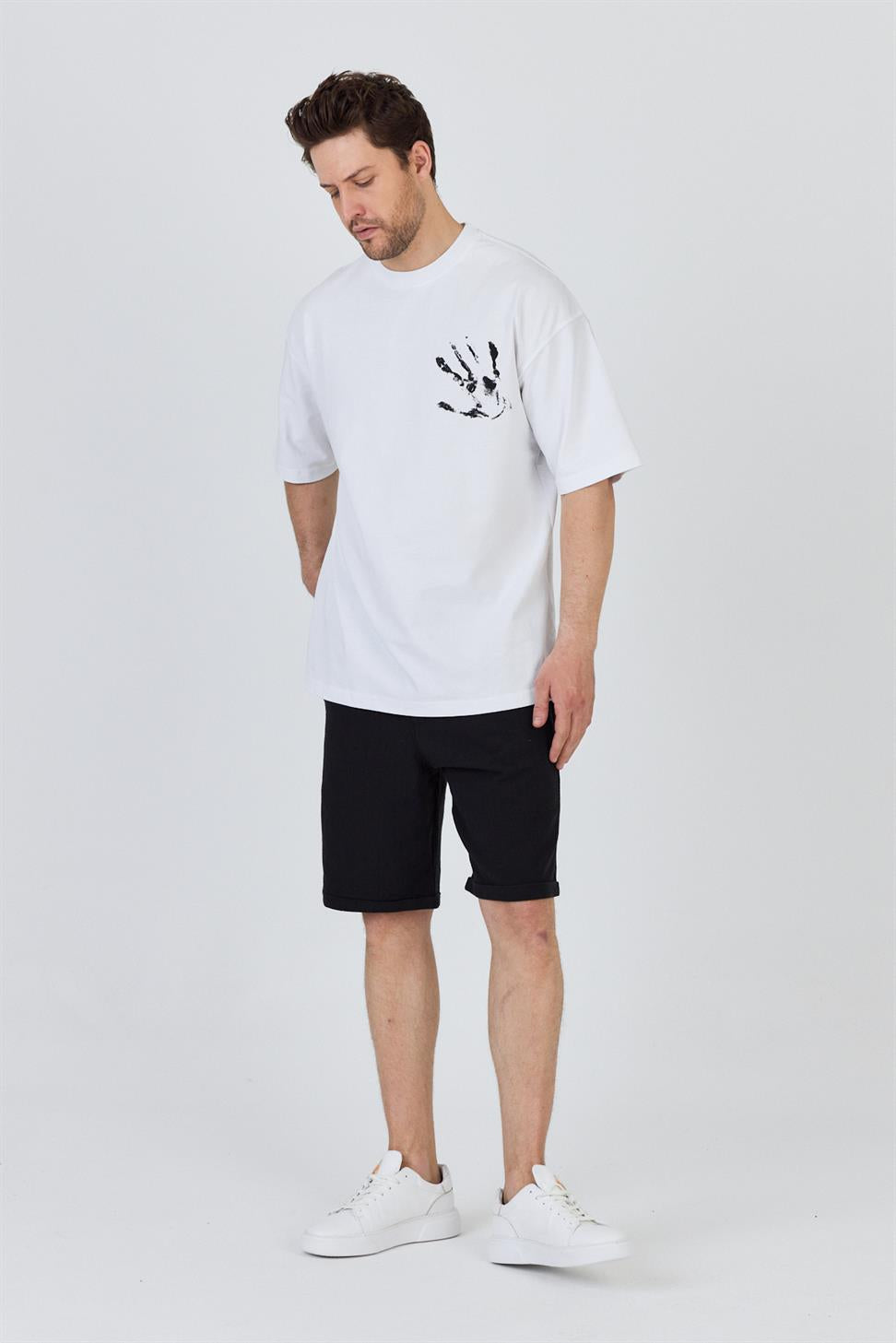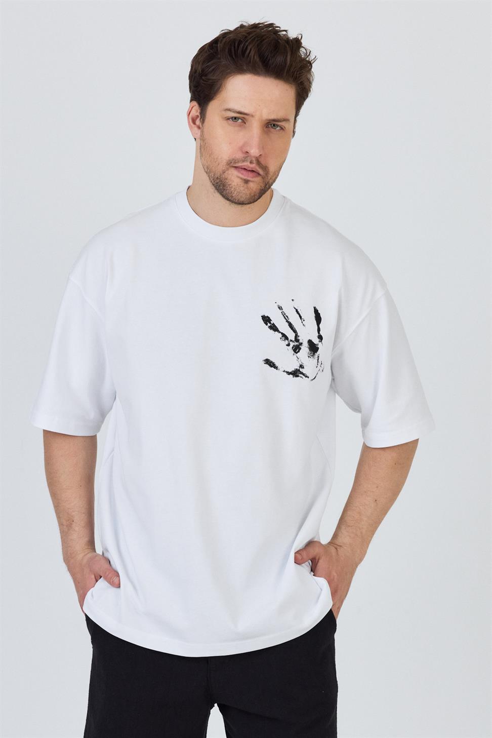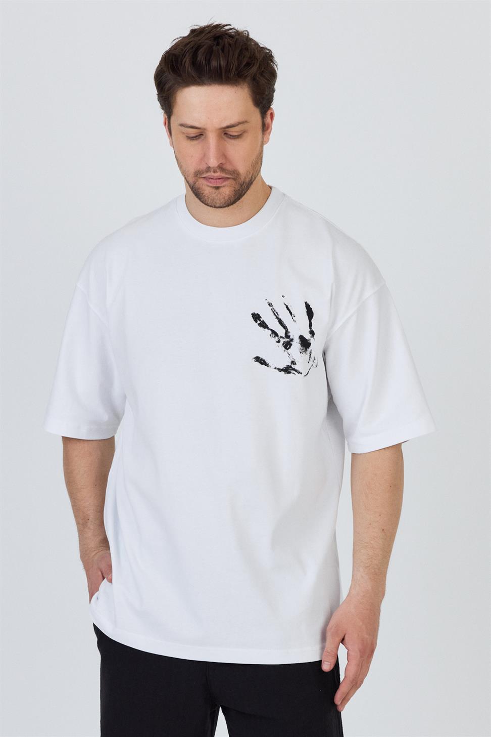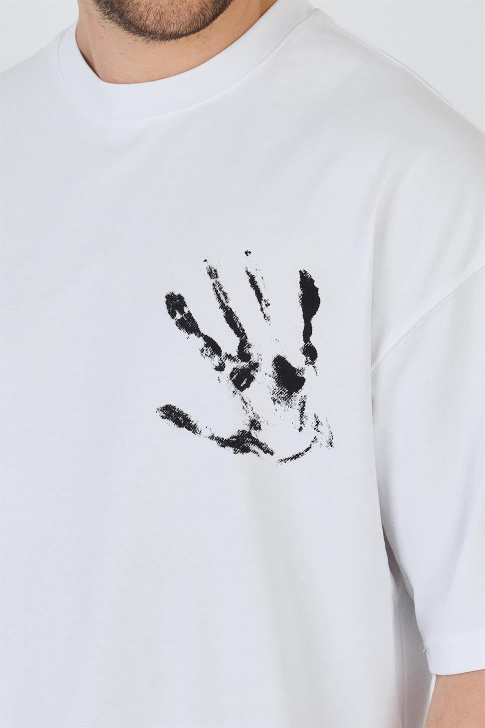 The oversize fit adds a relaxed, streetwear-inspired edge, while the front handprint graphic and back print detail bring a bold and artistic touch. Versatile and stylish, this t-shirt pairs easily with jeans, shorts, or joggers for an effortless everyday look.