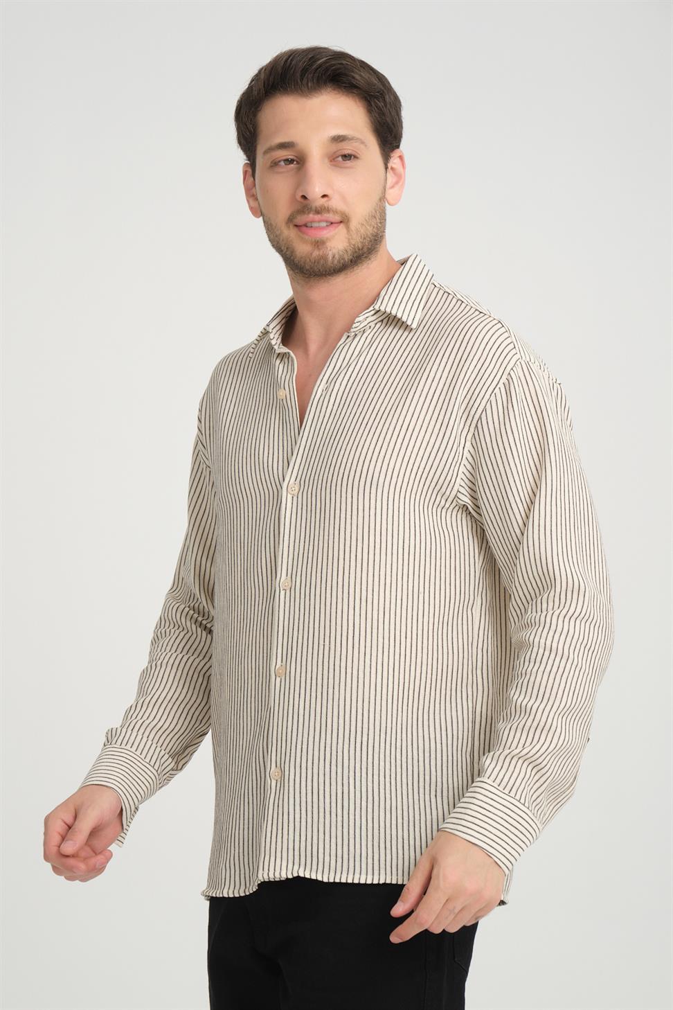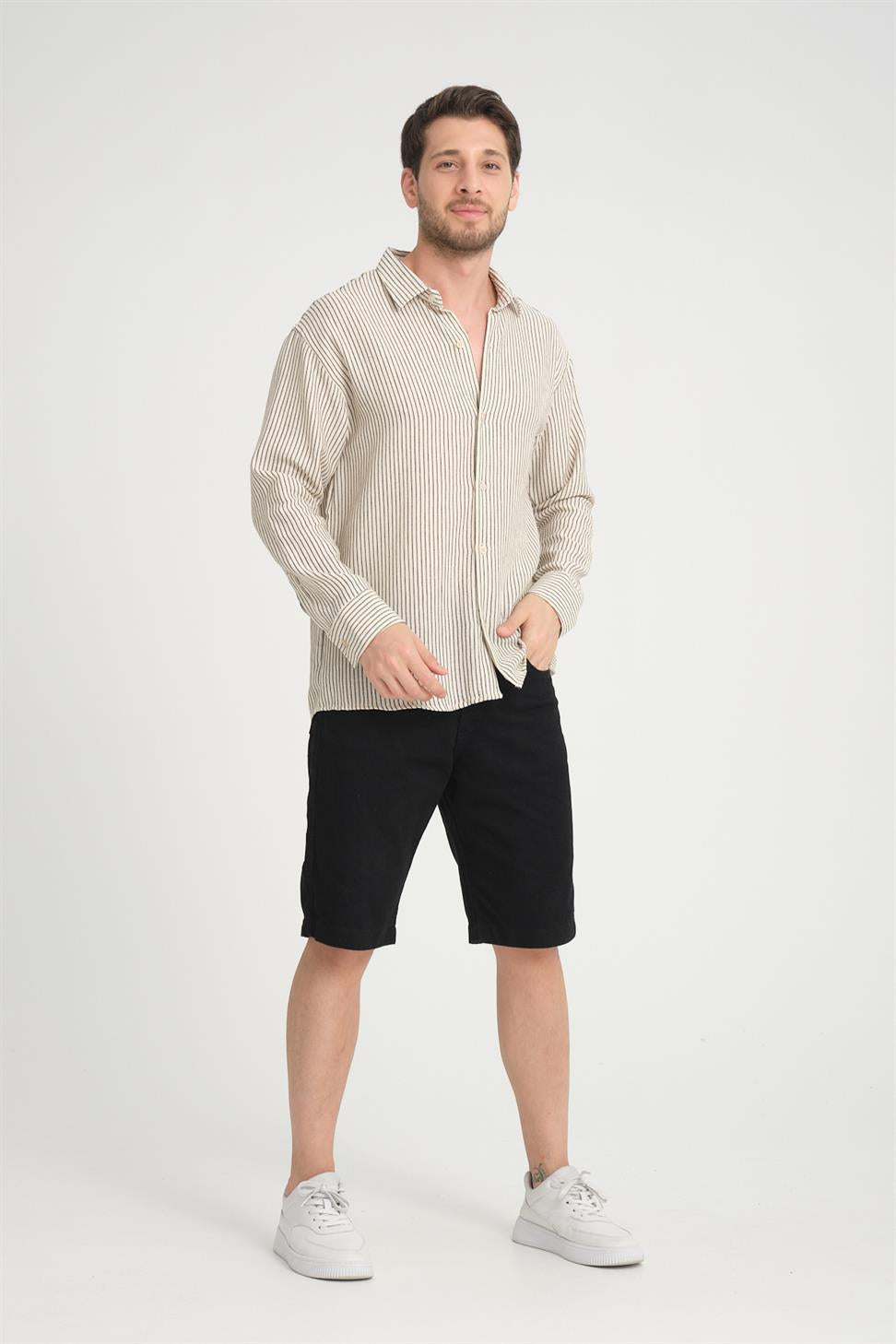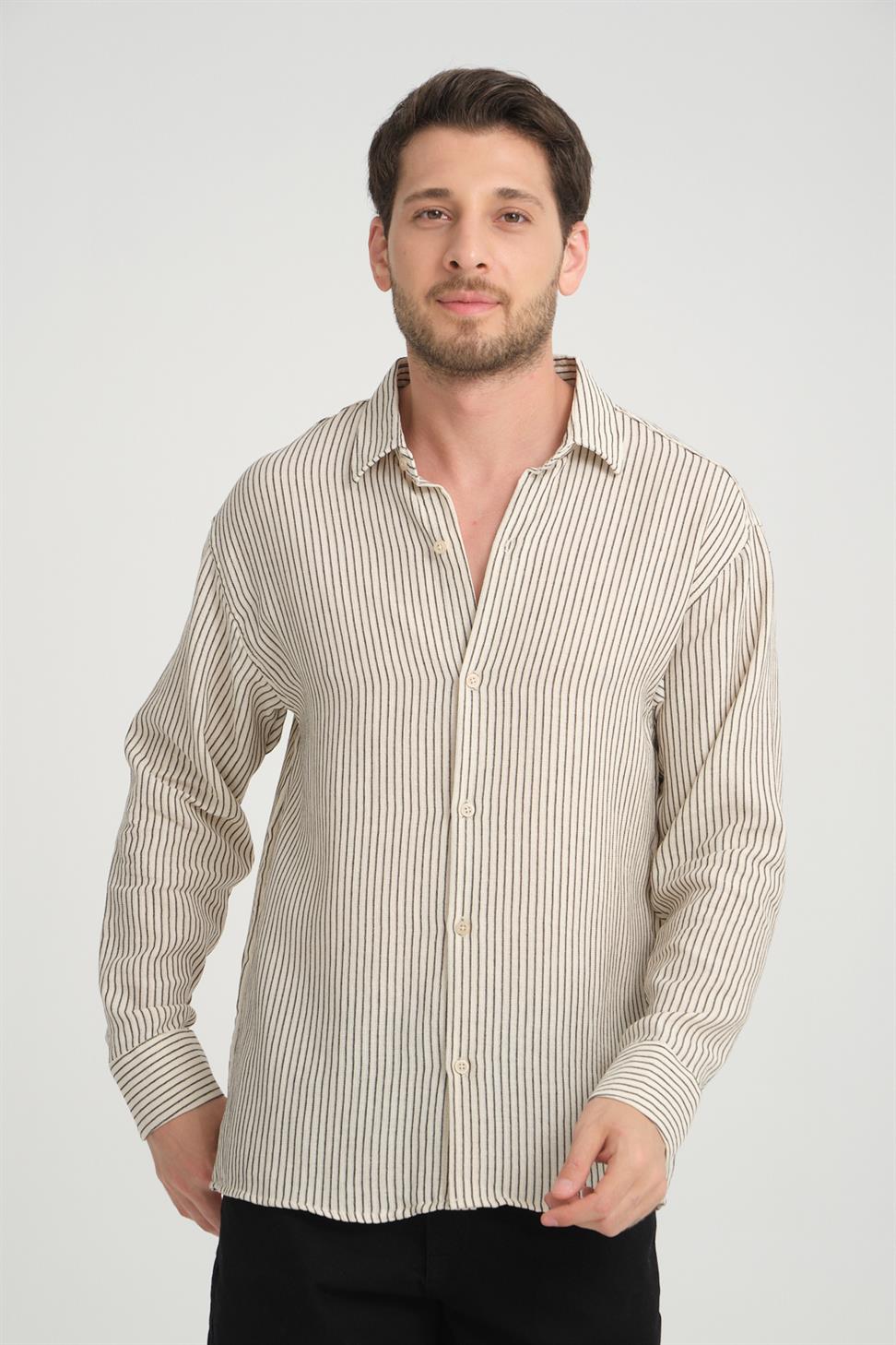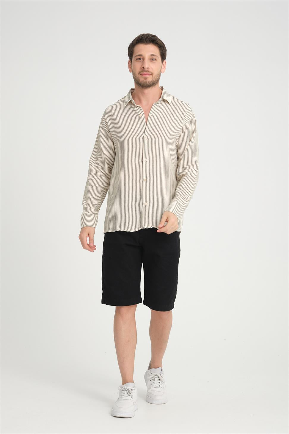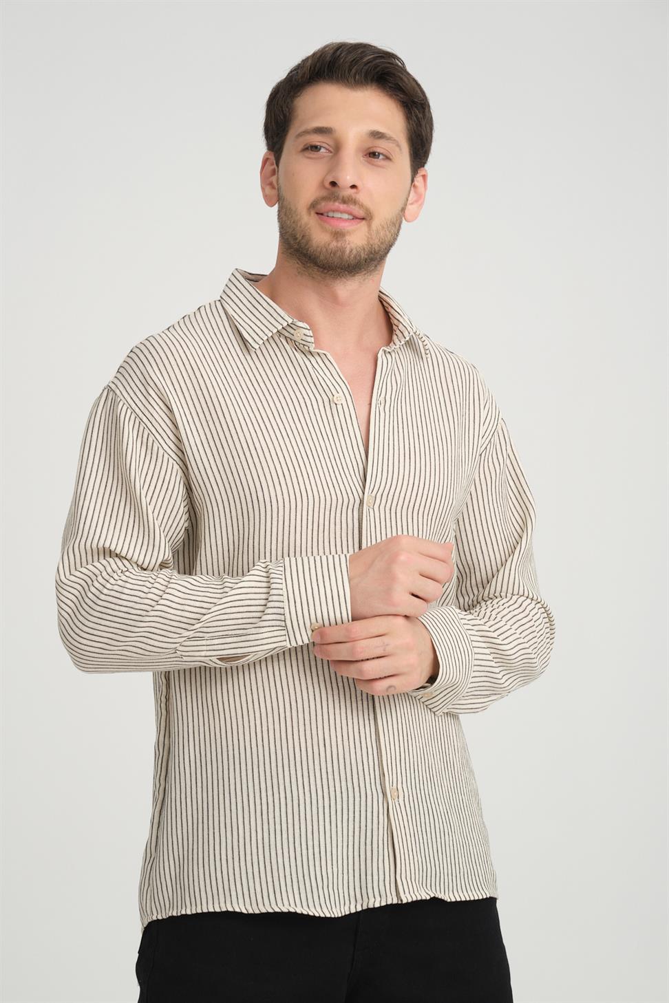 Keep your look refined and comfortable with the Stand Collar Long Sleeve Striped Shirt in Beige. Made from 100% Cotton Linen fabric, it offers breathability, softness, and durability, making it perfect for all-day wear. The stand collar design adds a modern touch, while the striped pattern enhances its stylish and versatile appeal. Ideal for both casual and semi-formal occasions, this shirt pairs effortlessly with jeans, chinos, or tailored trousers.