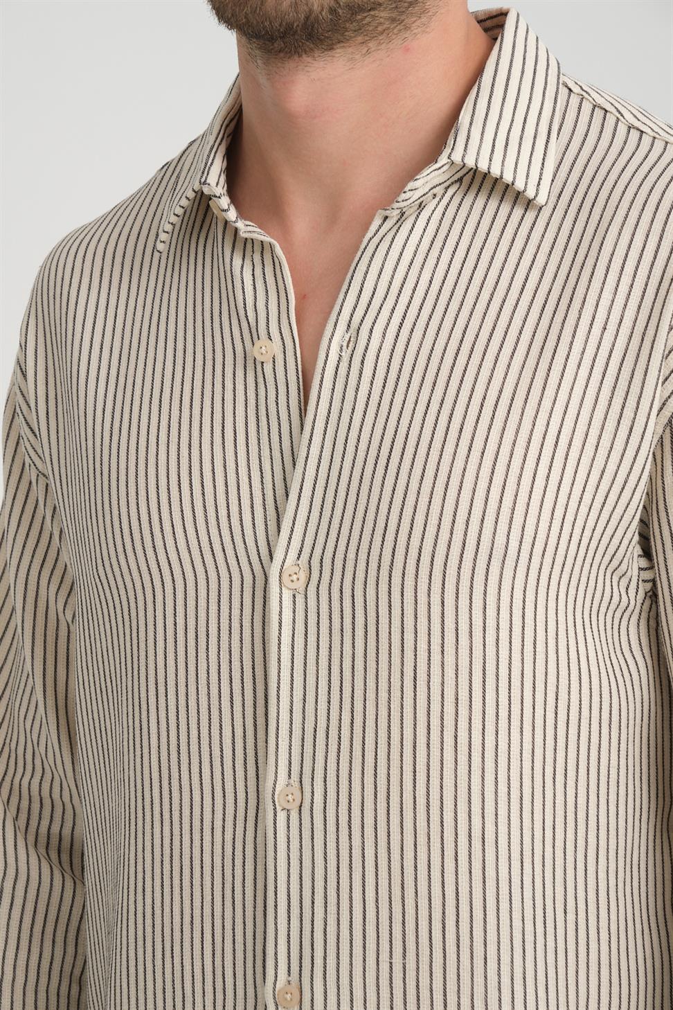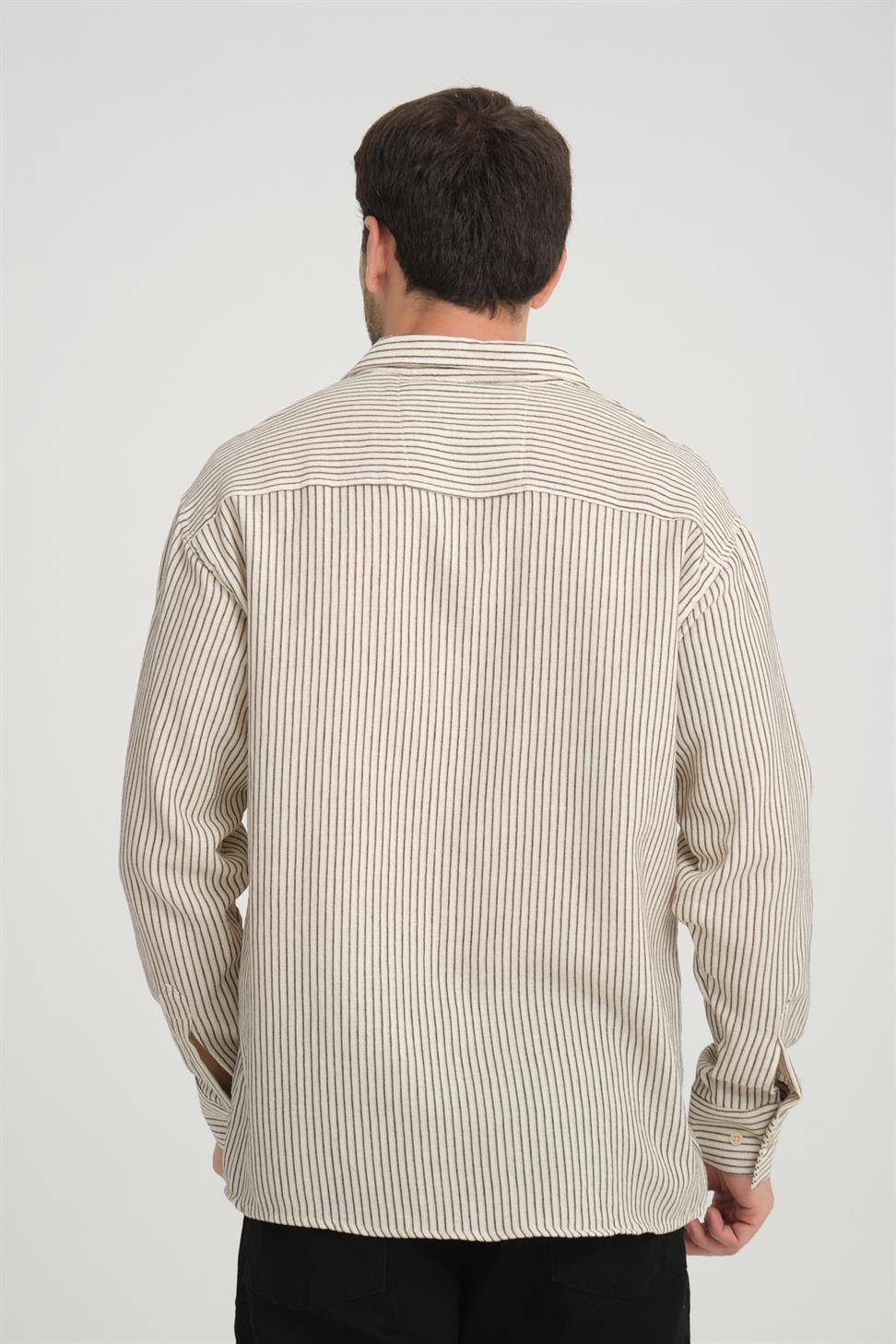 R-6034 Stand Collar Long Sleeve Striped Shirt – Beige