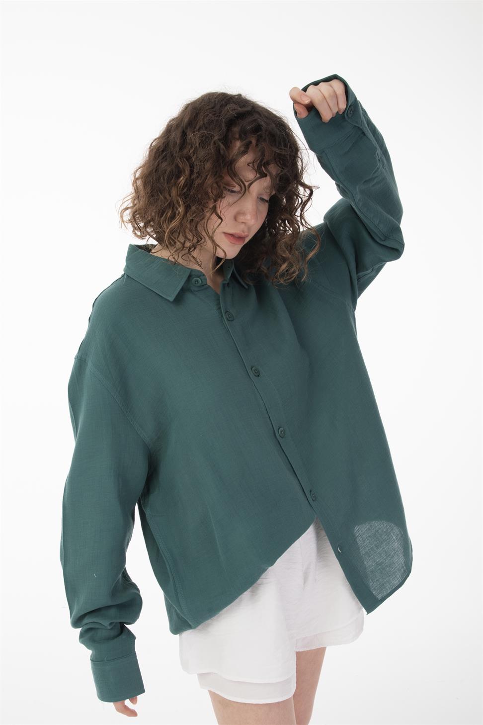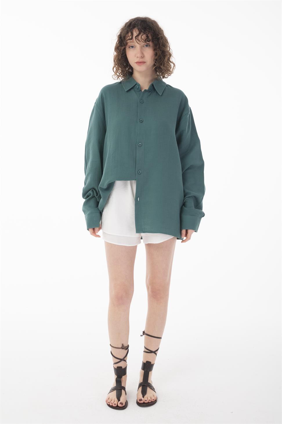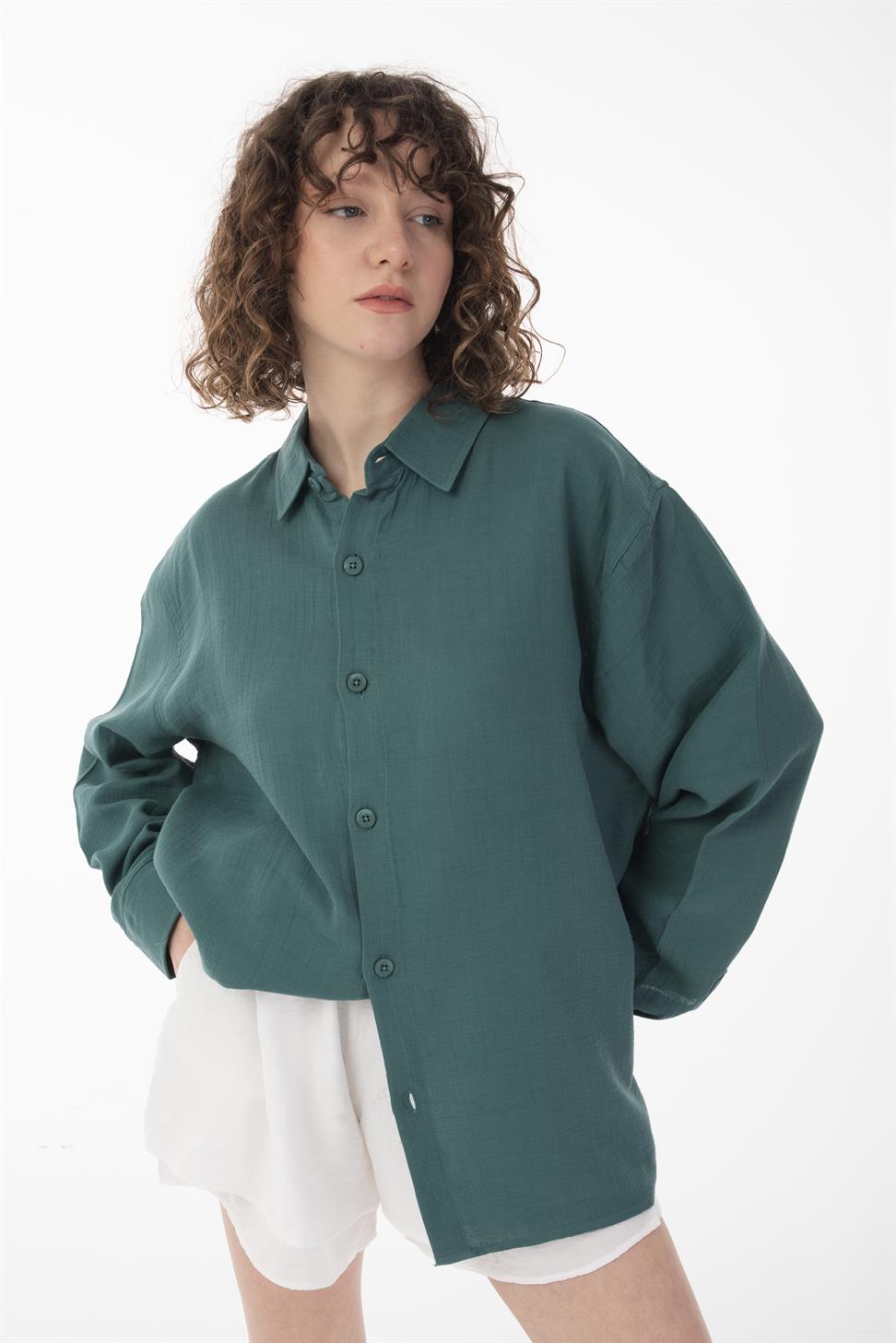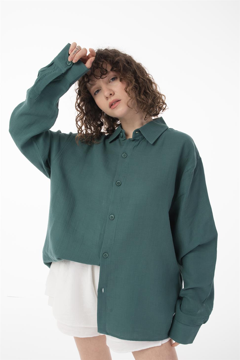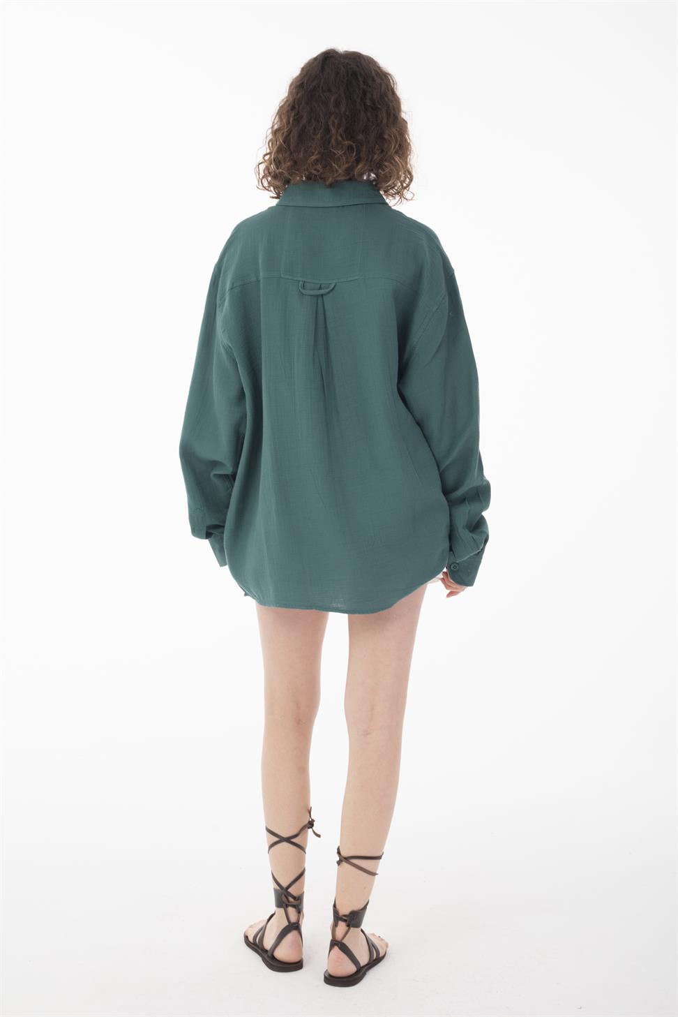 R-6048 Unisex Cotton Muslin Shirt in Petrol Green - Oversized Long Sleeve with Back Yoke Detail