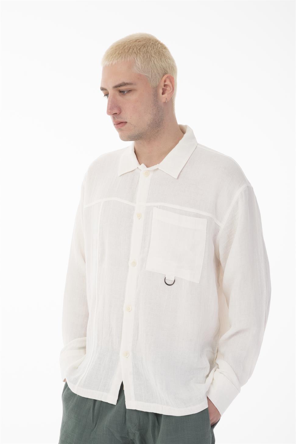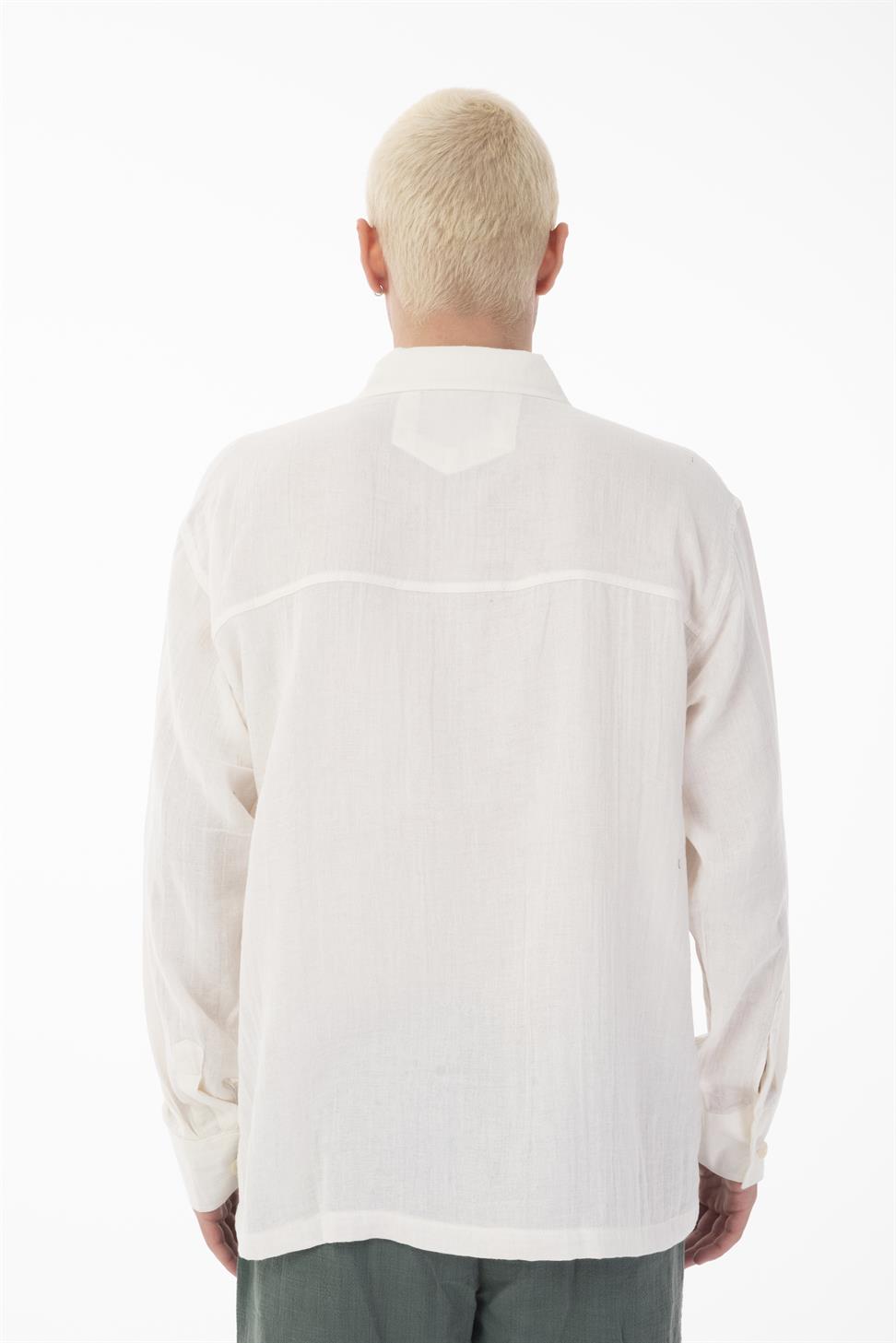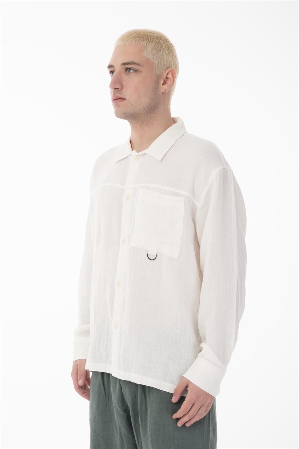 R-6052 Men’s Stand Collar Pocket Detail Long Sleeve Muslin Shirt – White