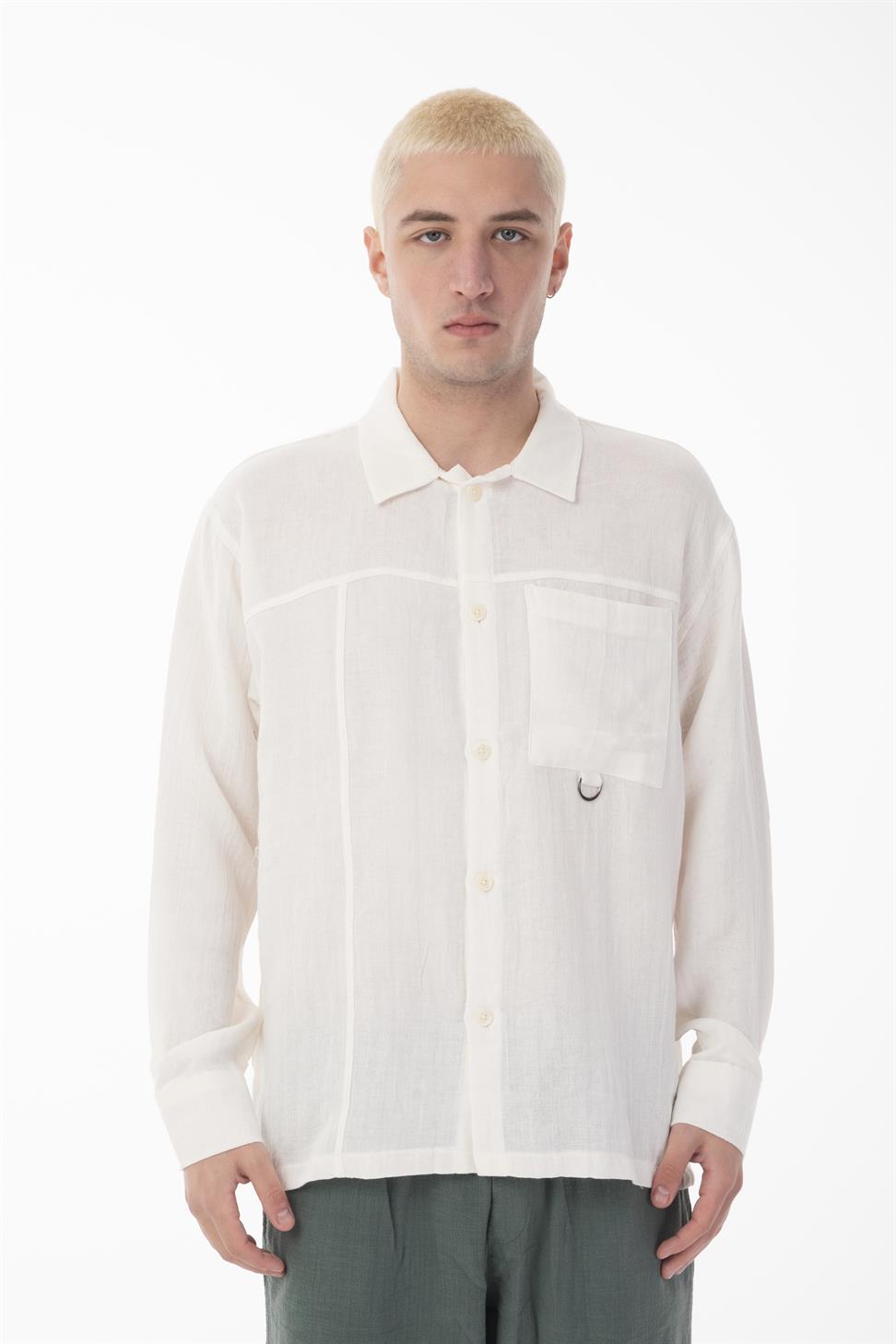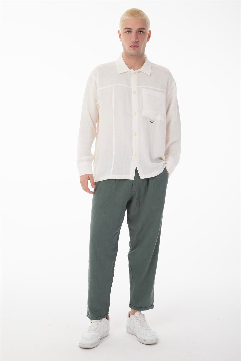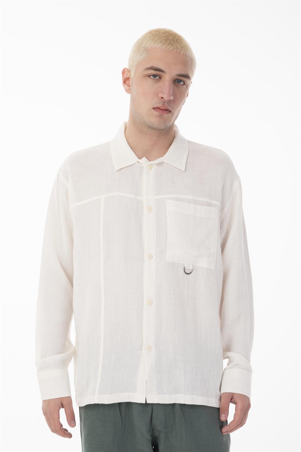 R-6052 Men’s Stand Collar Pocket Detail Long Sleeve Muslin Shirt – White