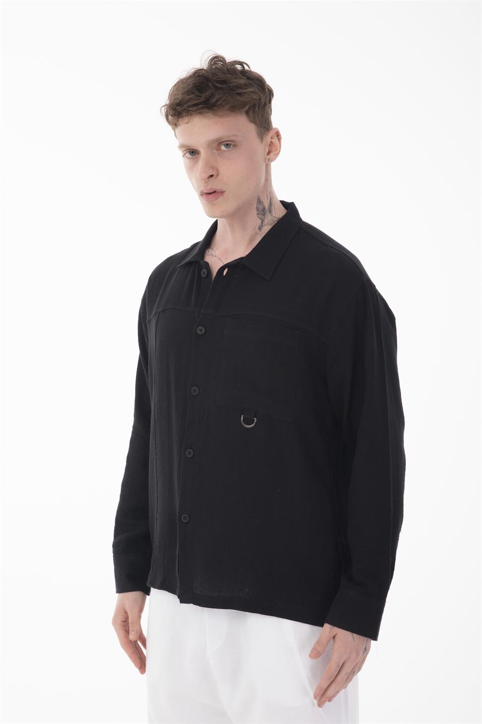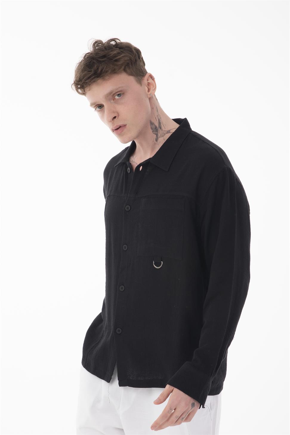 R-6052 Men’s Stand Collar Pocket Detail Long Sleeve Muslin Shirt