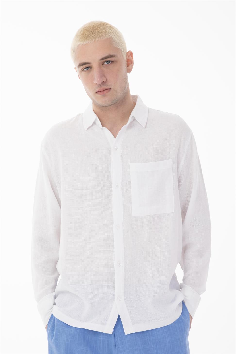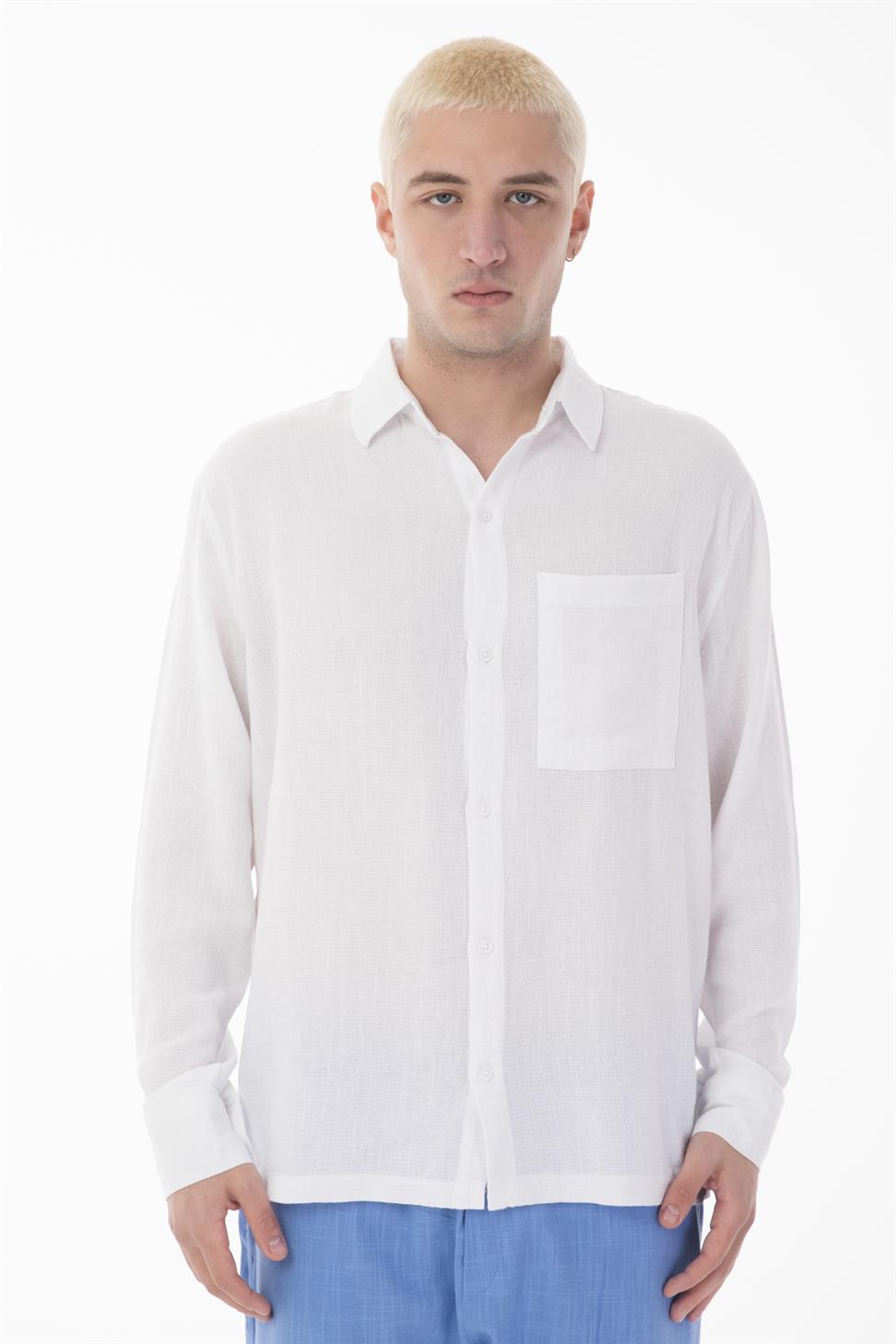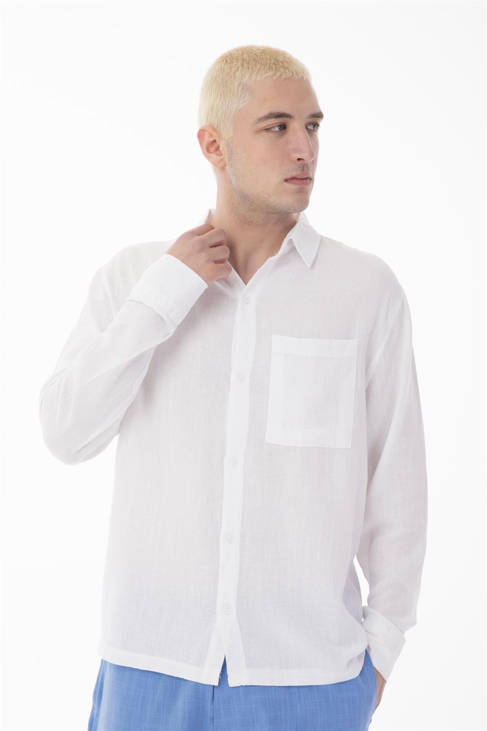 A refined men’s stand collar long sleeve shirt with a single pocket detail in crisp white. Its minimalist design and versatile look make it suitable for both casual wear and semi-formal occasions. Crafted from 100% cotton etamine fabric, it provides excellent breathability, softness, and lasting comfort throughout the day. Easy to pair with jeans, chinos, or tailored trousers, this shirt is a timeless wardrobe essential.