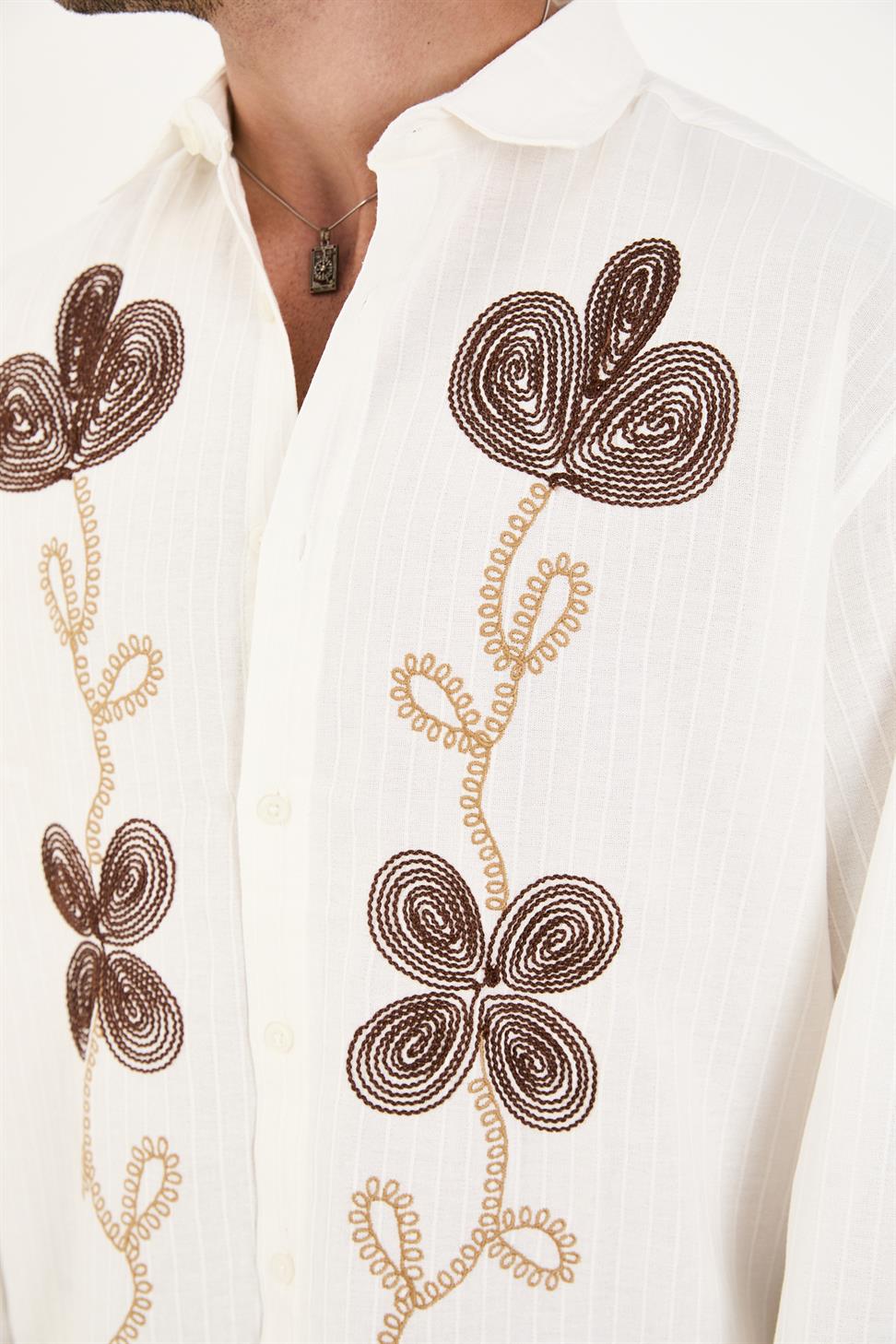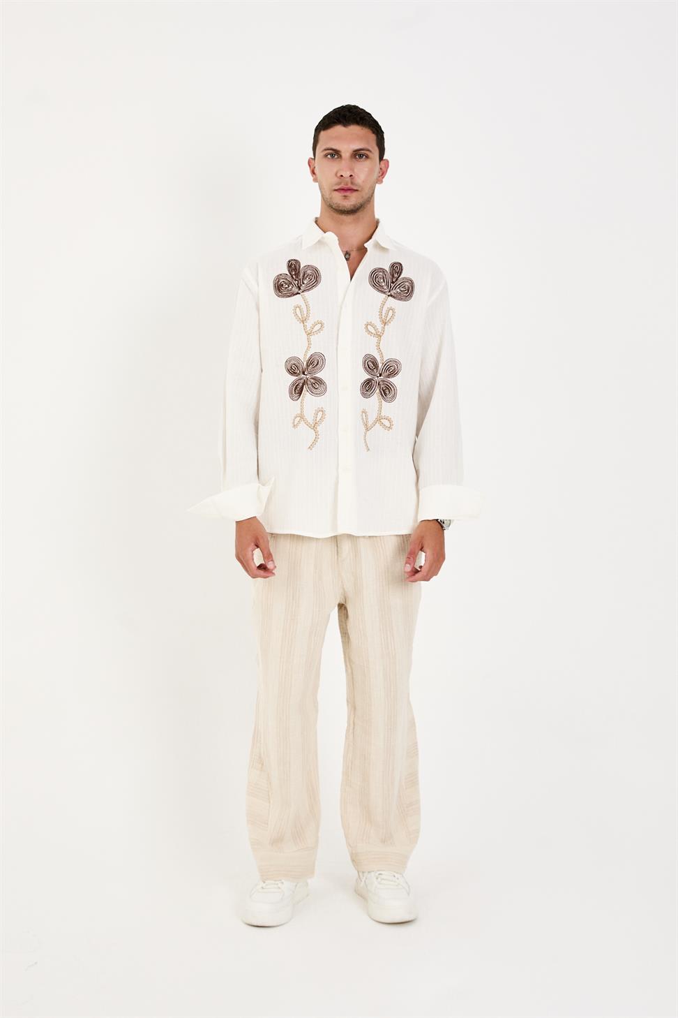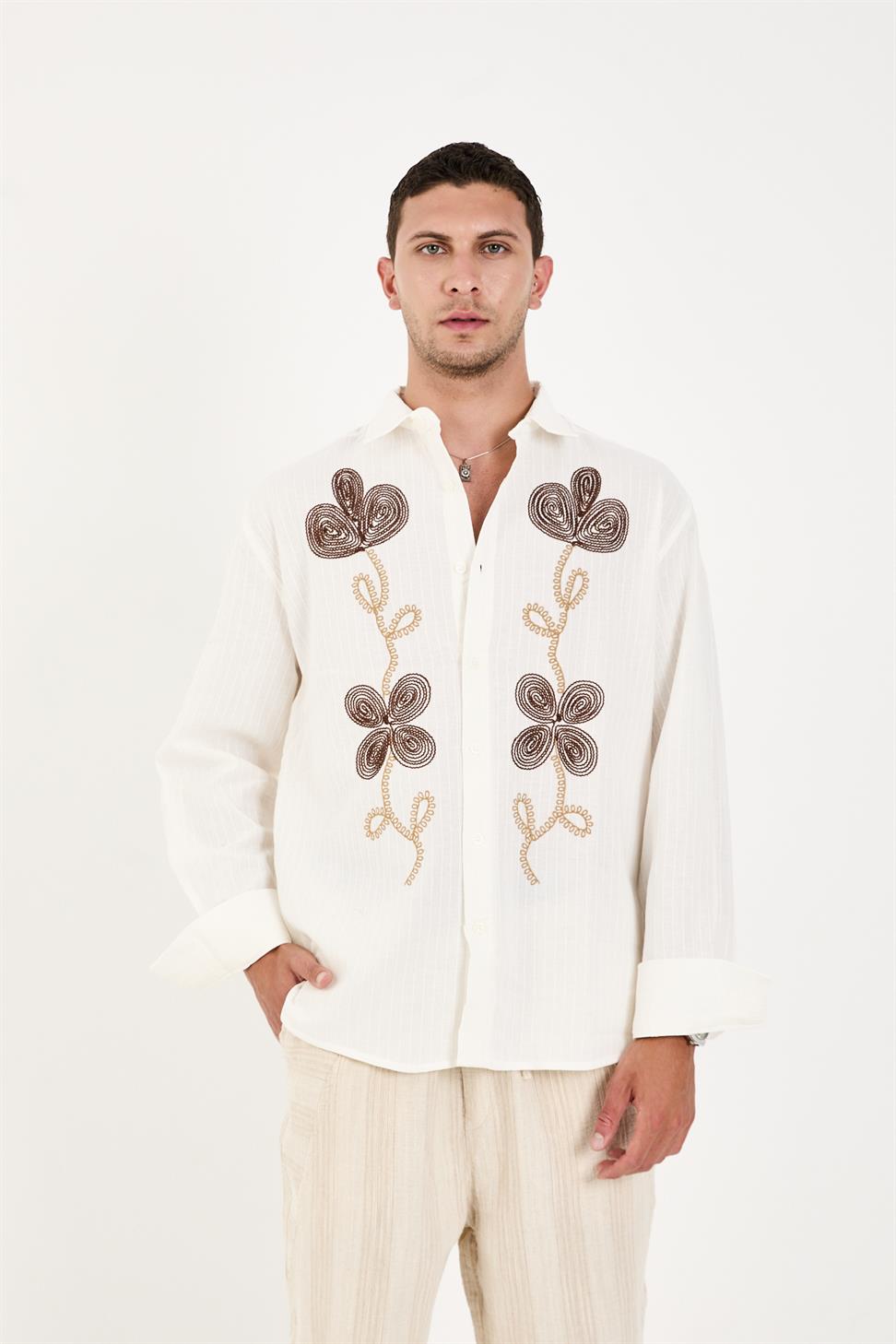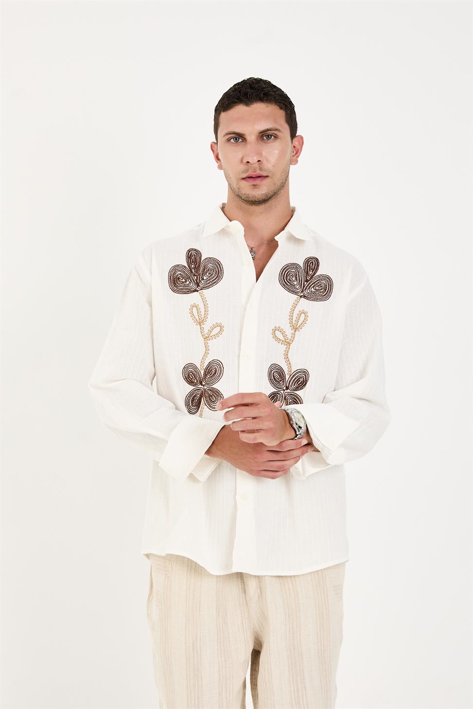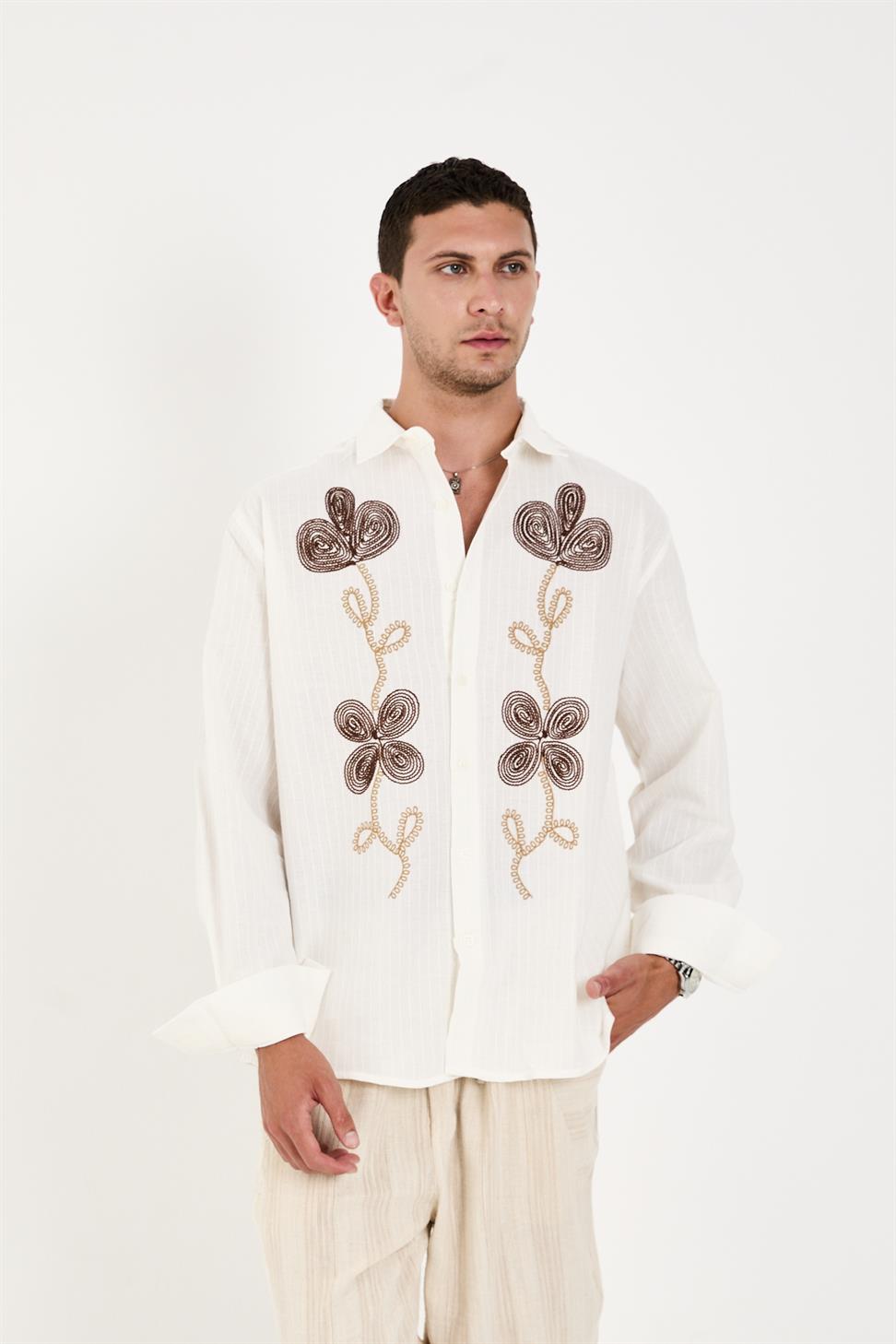 The long sleeves and intricate embroidery on the front add a sophisticated touch, blending artisanal craftsmanship with modern style. Its crisp white tone makes it a versatile piece – perfect for pairing with jeans for a relaxed look or with tailored trousers for a smart-casual outfit.