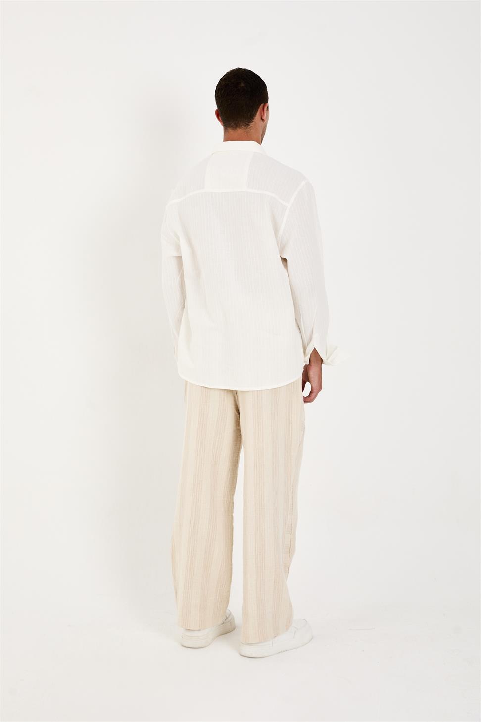 R-6093 R-6093 Men’s 100% Cotton Self-Striped Woven Shirt – White Long Sleeve with Embroidery Detail